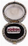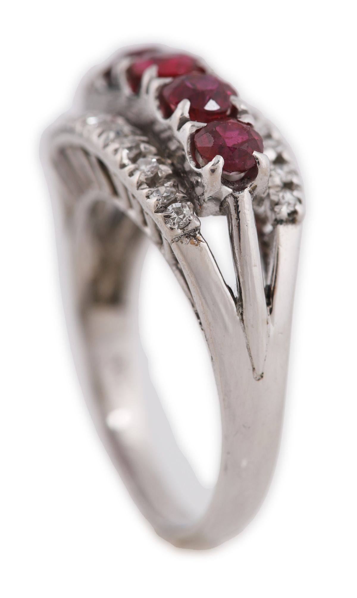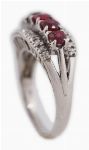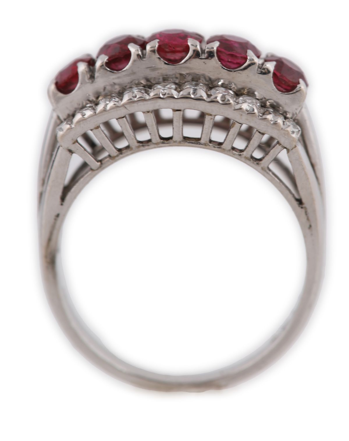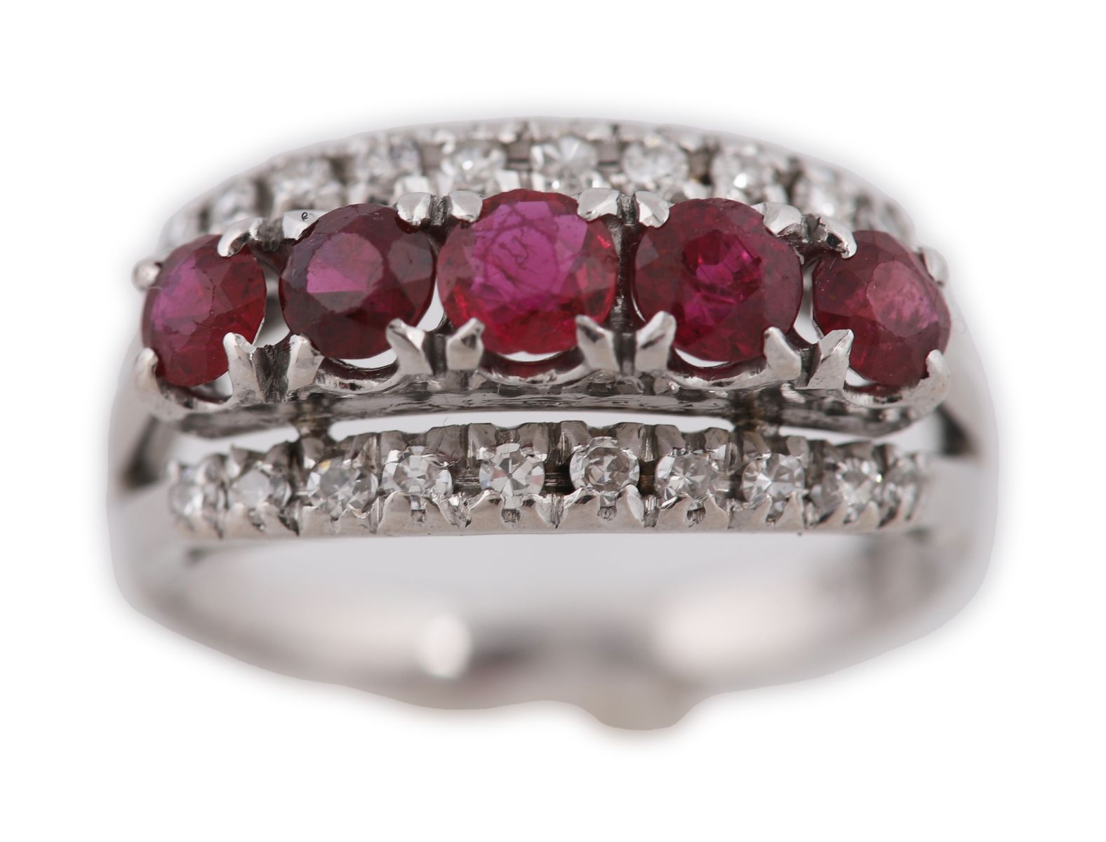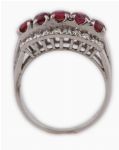 A 10ct white gold ring set with five rubies interspersed with approximately twenty small round brilliant-cut diamonds in a raised gallery.