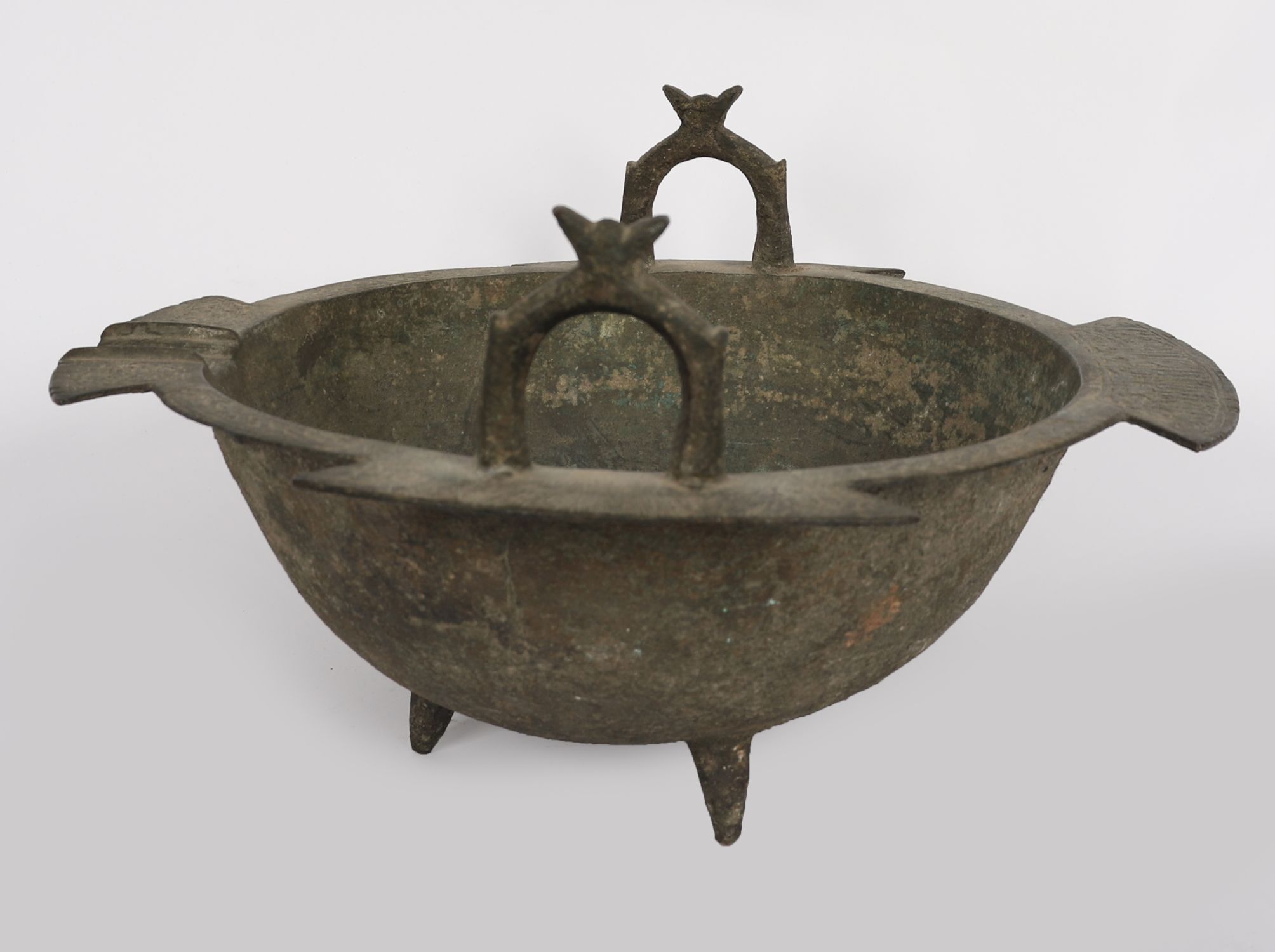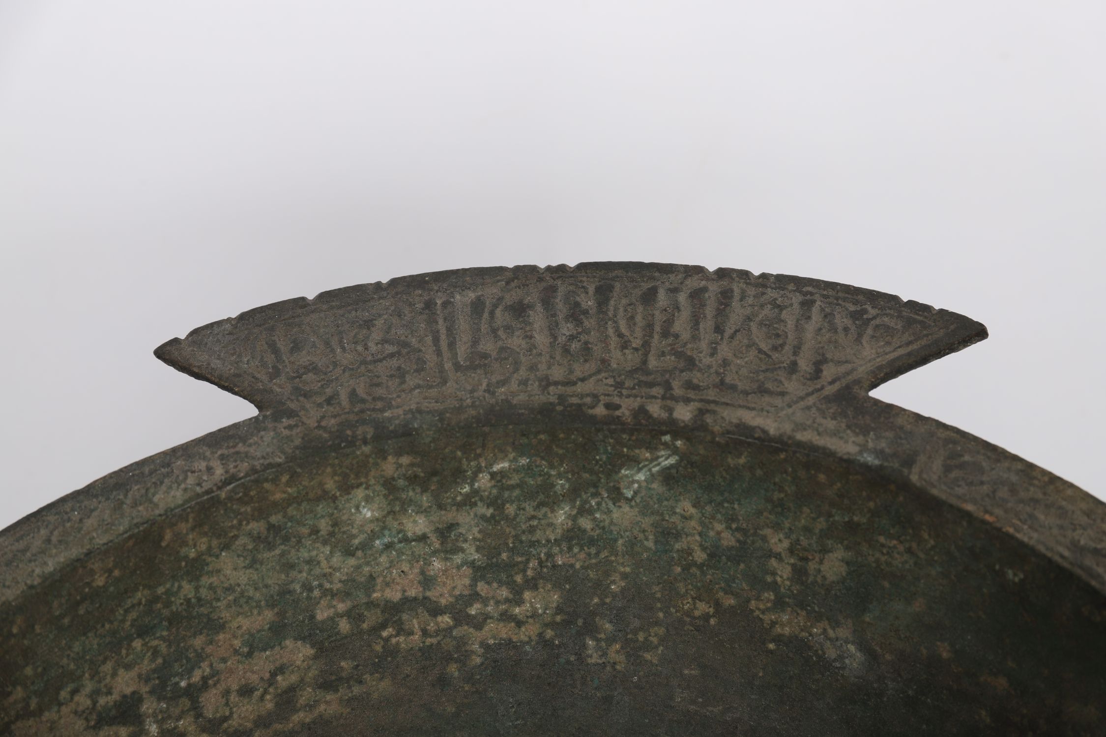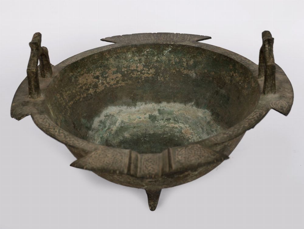 A Medieval Islamic bronze tripod bowl, Persia or Central Asia, 12-13th century. Of circular form raised on three feet, with two prominent arched loop handles and flared rim with pointed flanges. The rim finely decorated in relief with a continuous band of Arabic inscriptions in Kufic script, likely benedictory in nature. Retaining an attractive aged green patination.