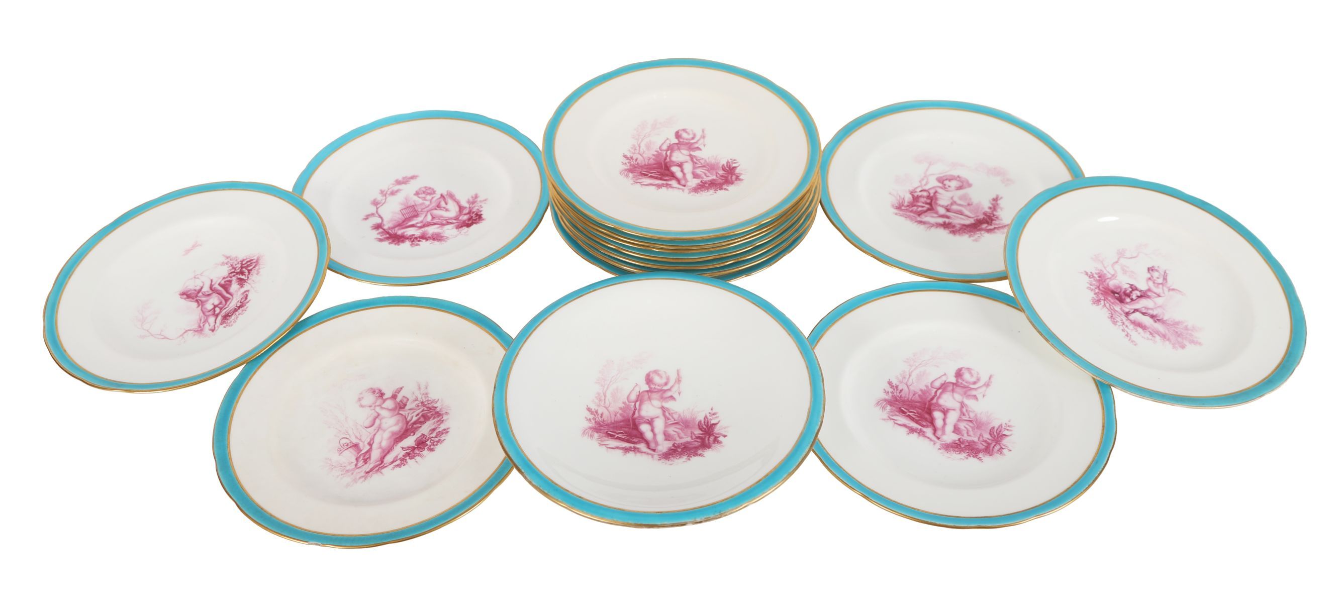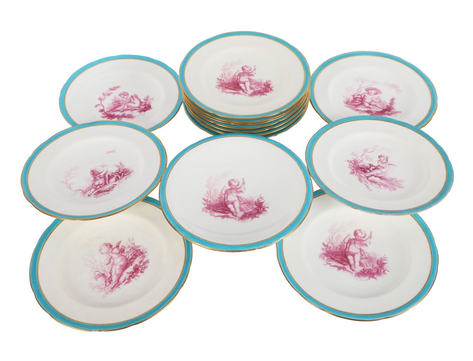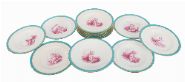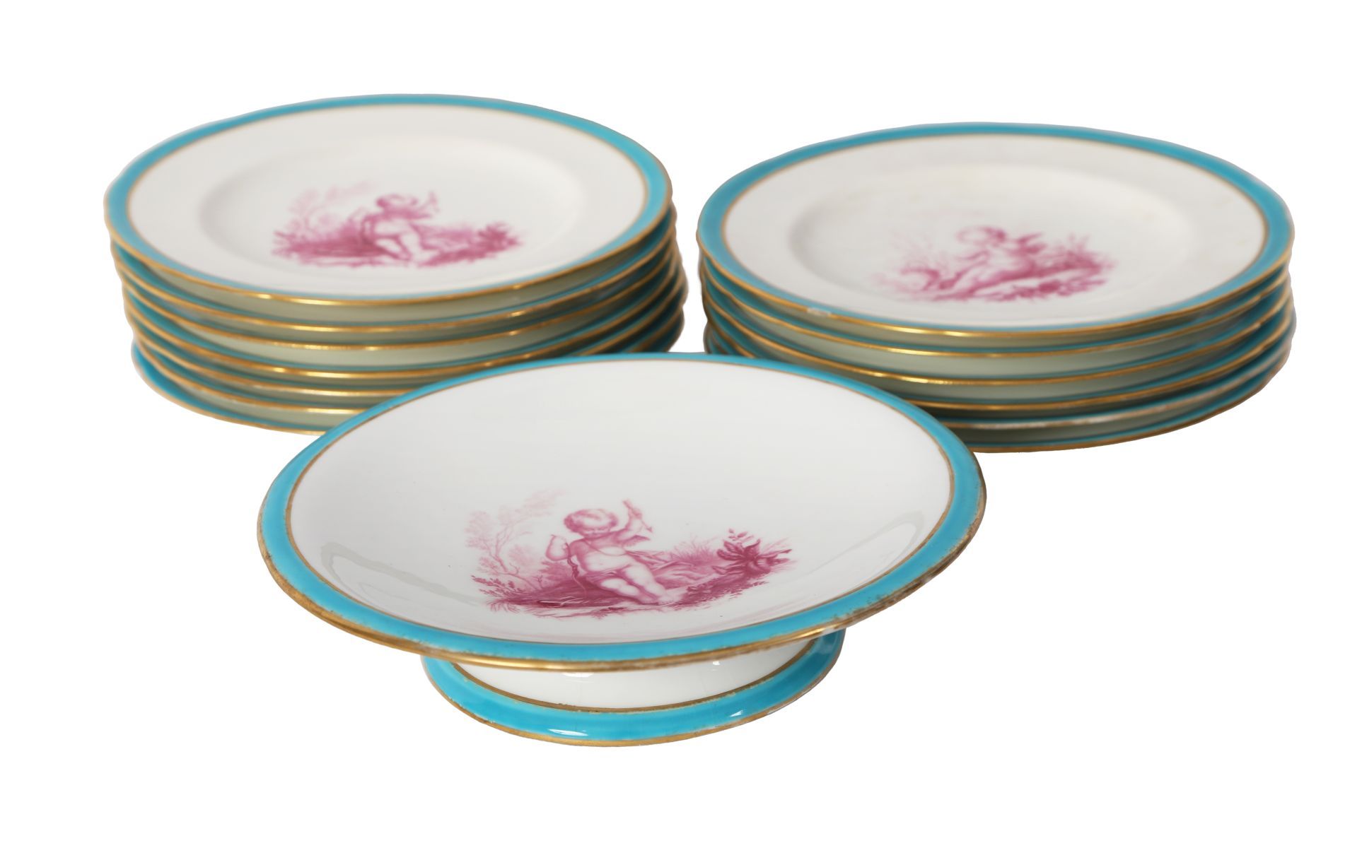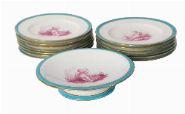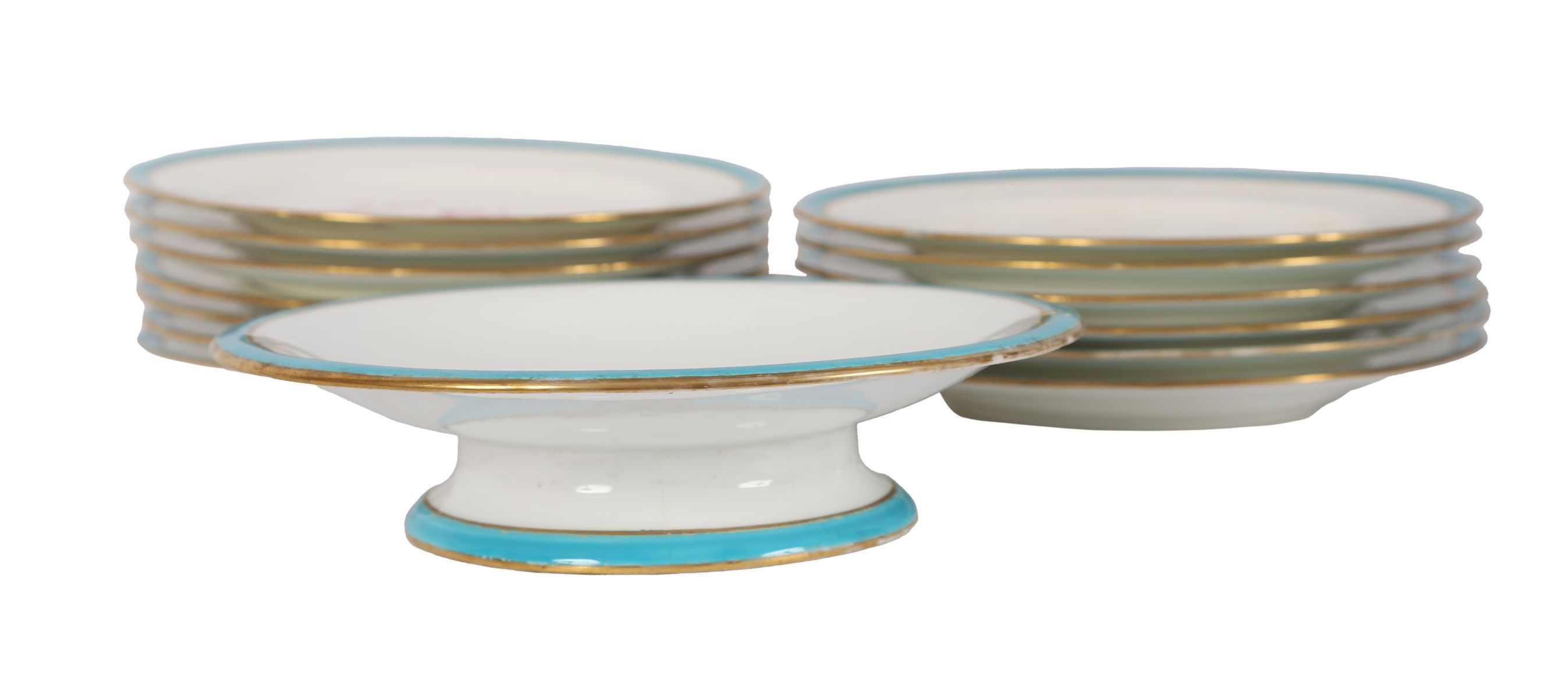 A 13-piece Minton porcelain fruit service, each piece decorated with classical-style fruit and foliate motifs in coloured enamels, reserved within turquoise borders and enriched with gilt rims.
