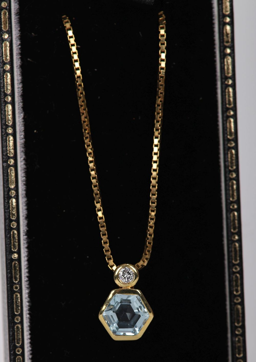 Lot 1372 14 CARAT GOLD AQUAMARINE AND DIAMOND PENDANT