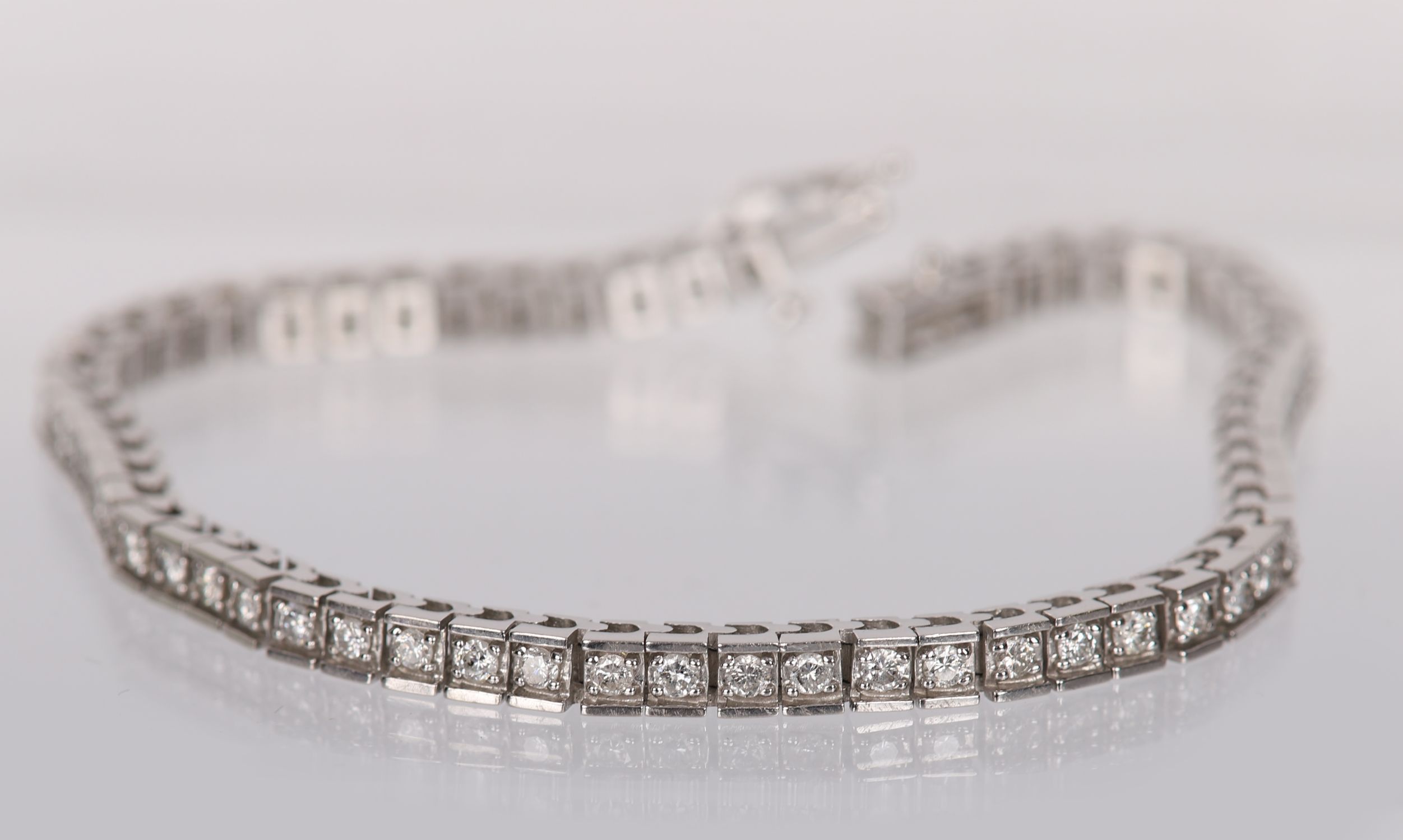 A classic line bracelet set with a continuous row of round brilliant-cut diamonds, totalling approx. 2.00 carats, mounted in 14 carat white gold.