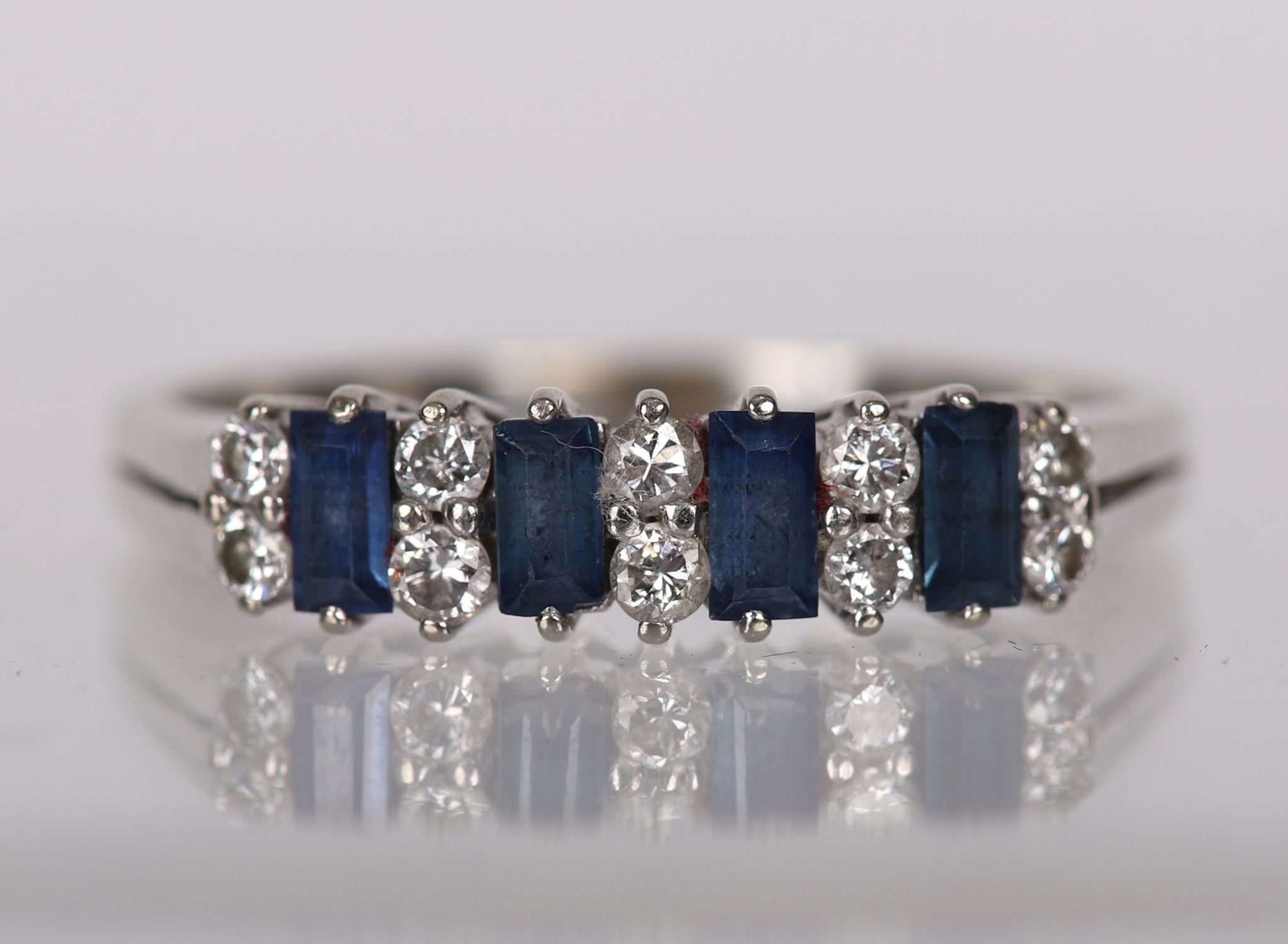 Five-stone band ring alternately set with round-cut sapphires and diamonds, mounted in 14 carat white gold.