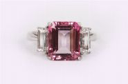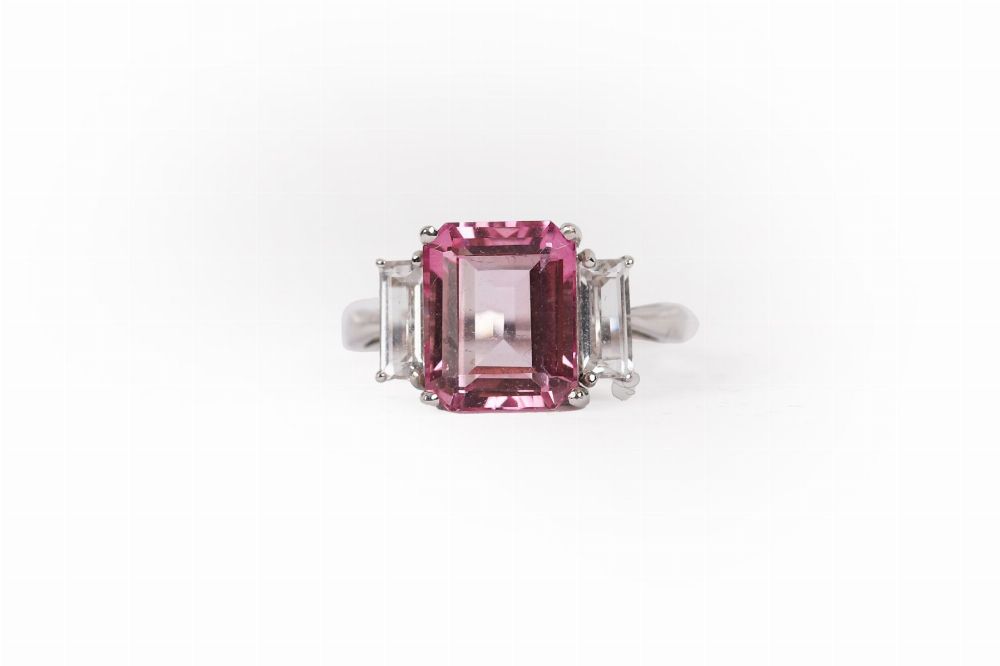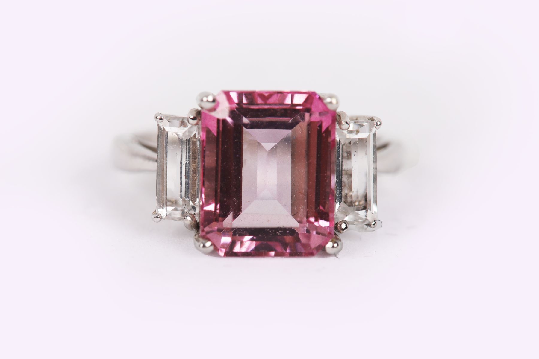 A 14 ct. white gold ring set with a central emerald-cut pink topaz flanked by two baguette-cut clear stones, in a classic three-stone arrangement.