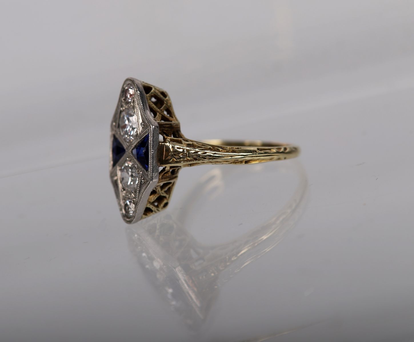 An Art Deco-style marquise-shaped ring set with calibré-cut sapphires and diamonds, total diamond weight approximately 0.5ct, mounted in 14ct white gold.