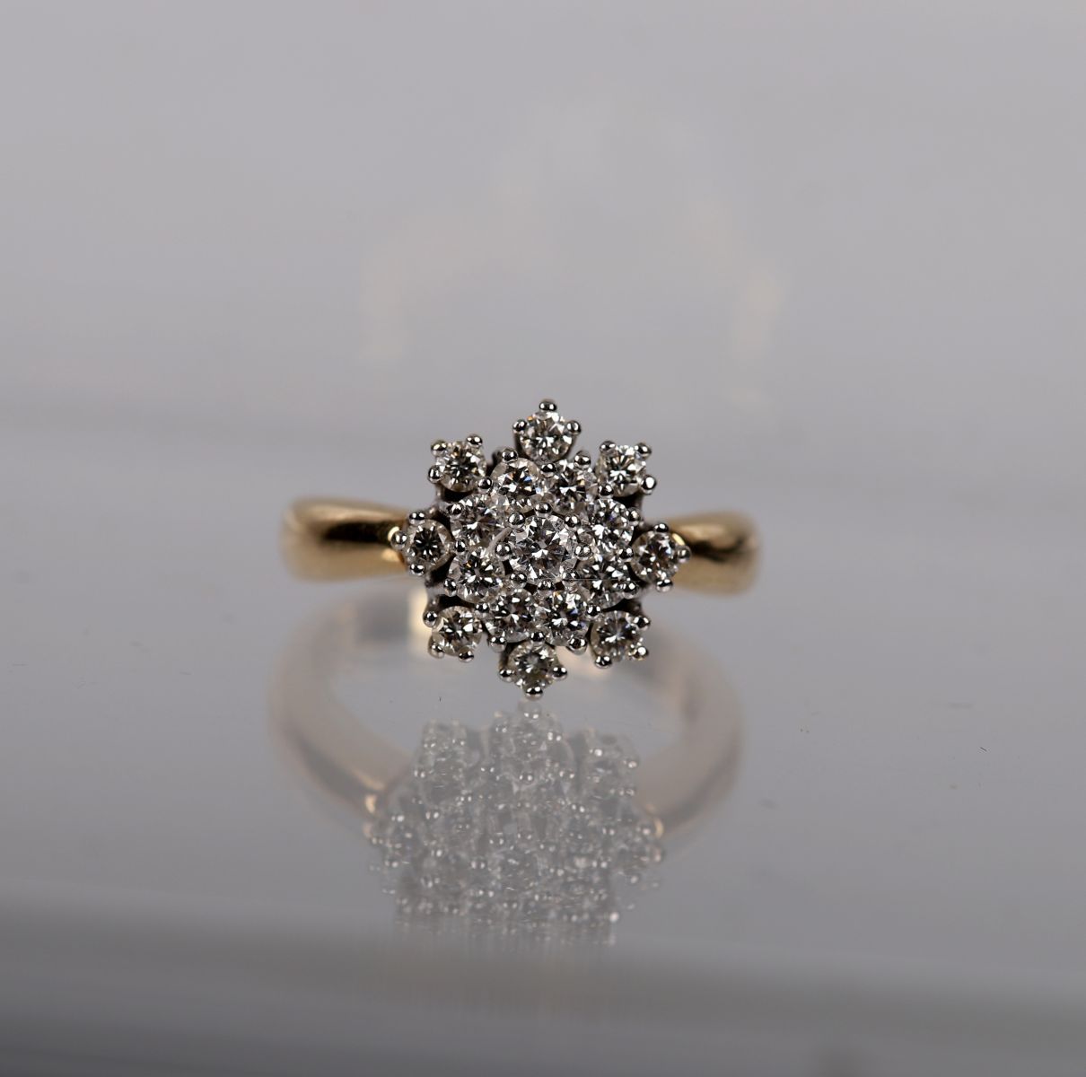 Lot 575 14 CT. YELLOW GOLD DIAMOND CLUSTER RING