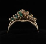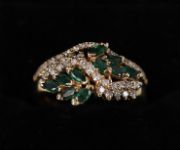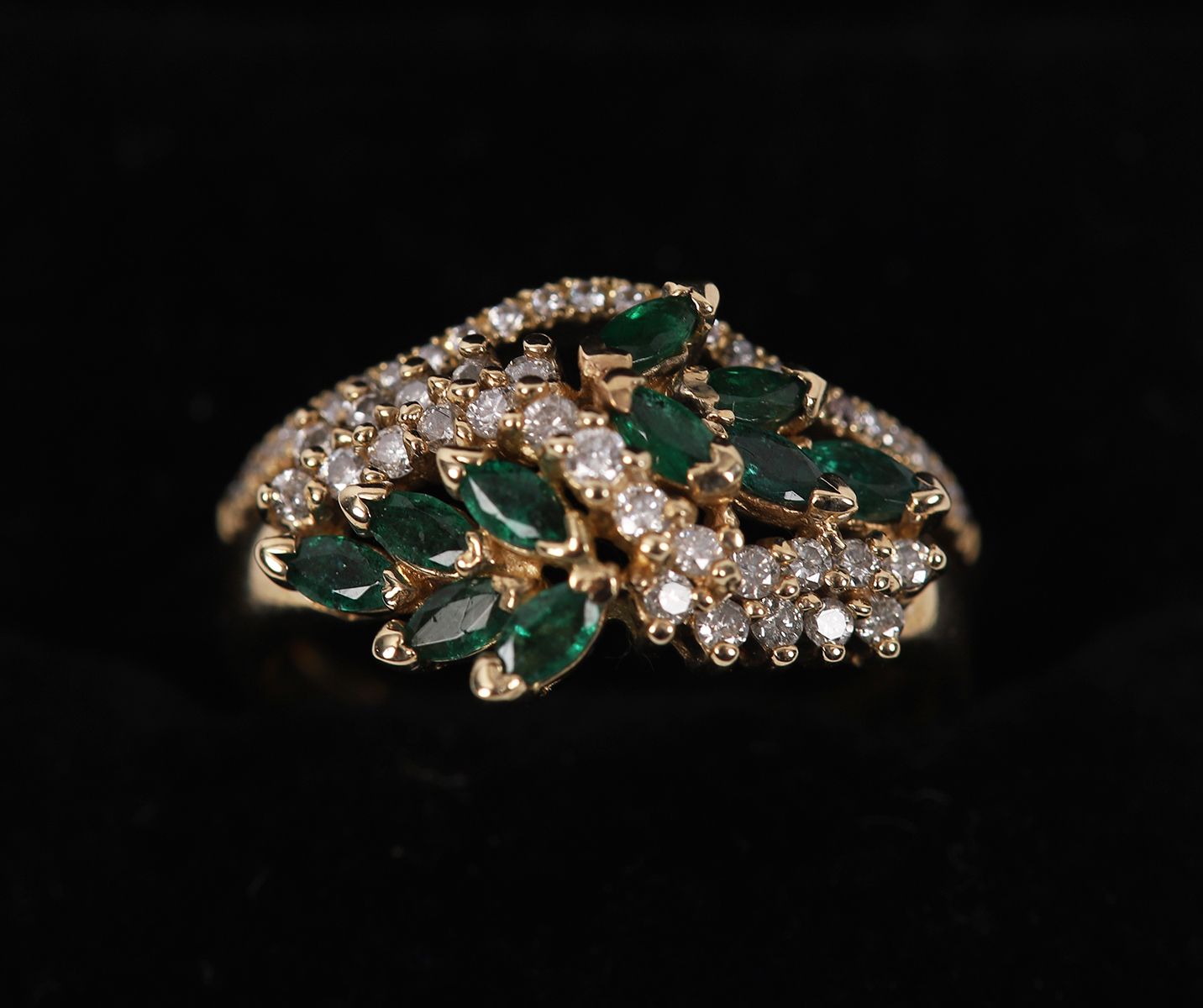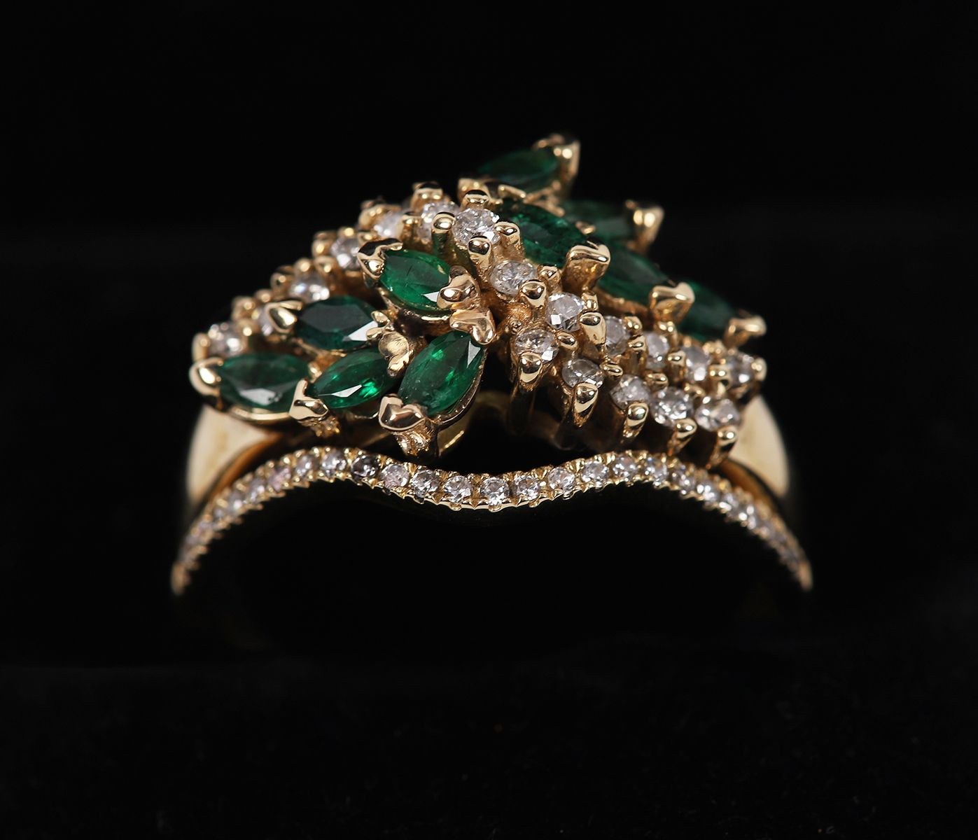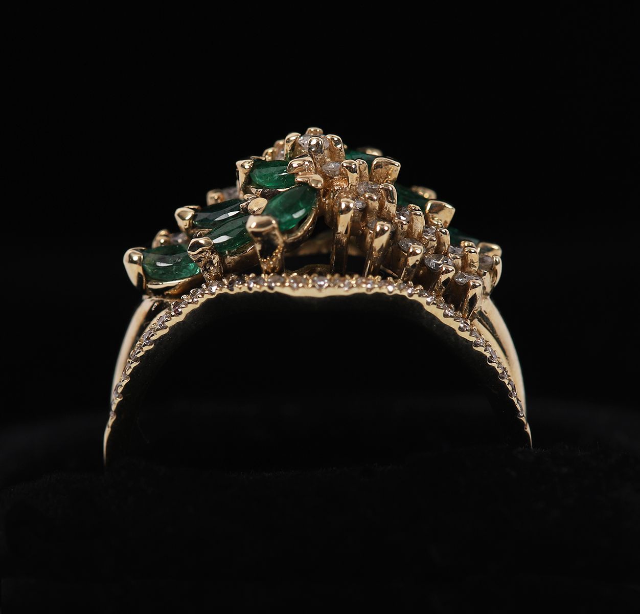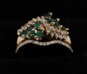 Lot 592 14 CT. YELLOW GOLD EMERALD AND DIAMOND CLUSTER RING
