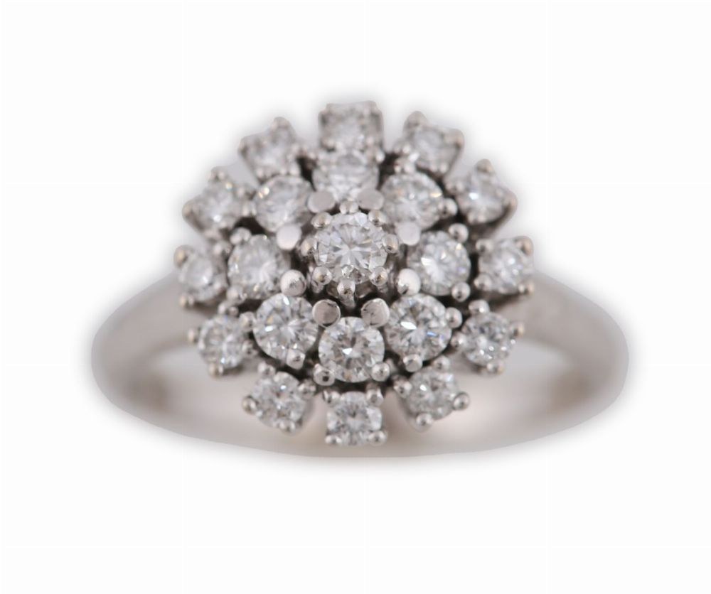 Designed as a circular cluster composed of numerous brilliant-cut diamonds arranged in a domed floral formation, the principal stones collectively totalling approximately 1.00 carat, mounted in 14ct white gold.