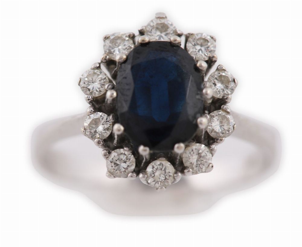 A 14ct white gold cluster ring, centred with an oval blue sapphire within a surround of round brilliant-cut diamonds.