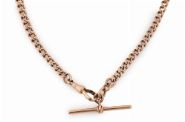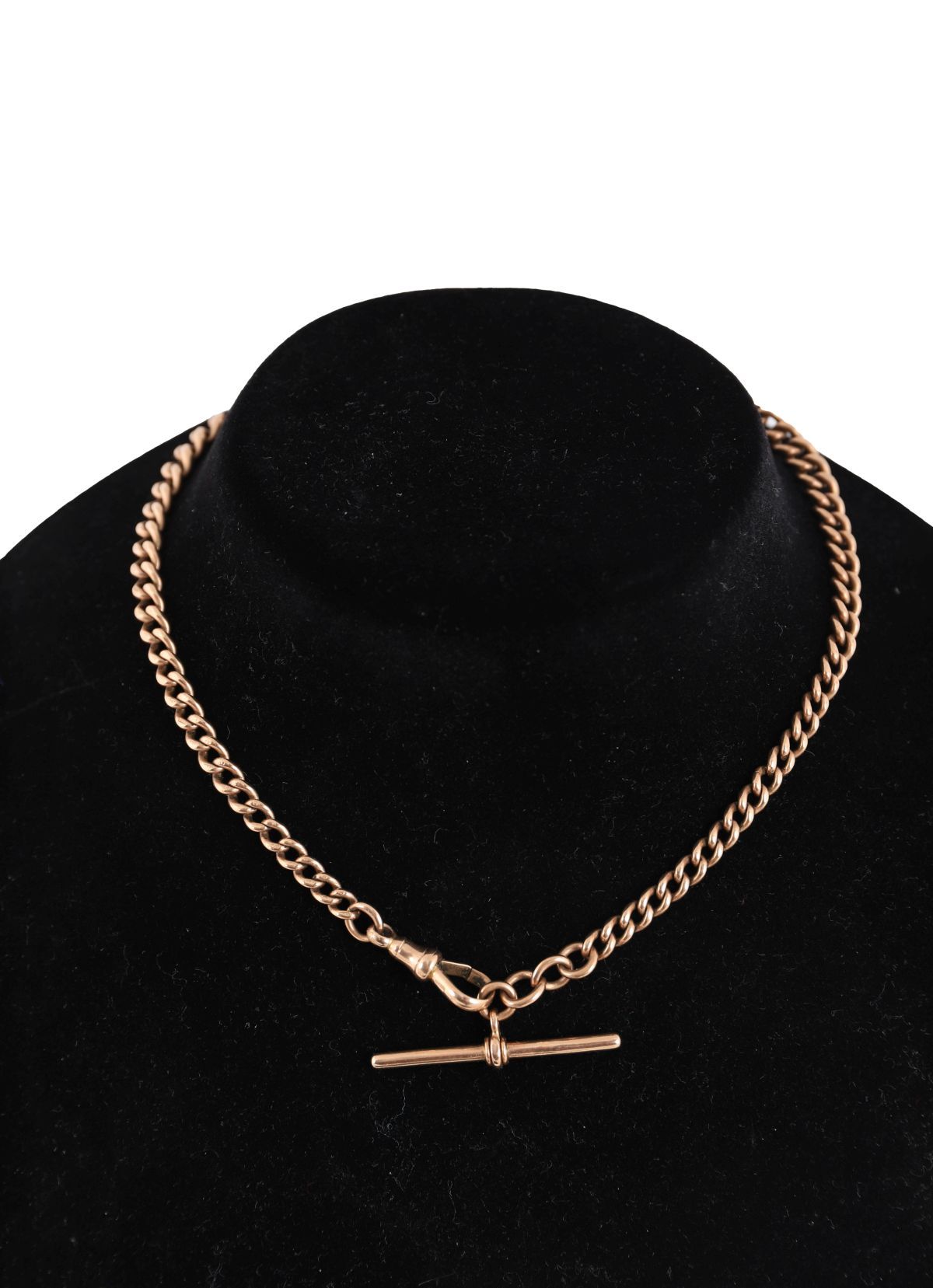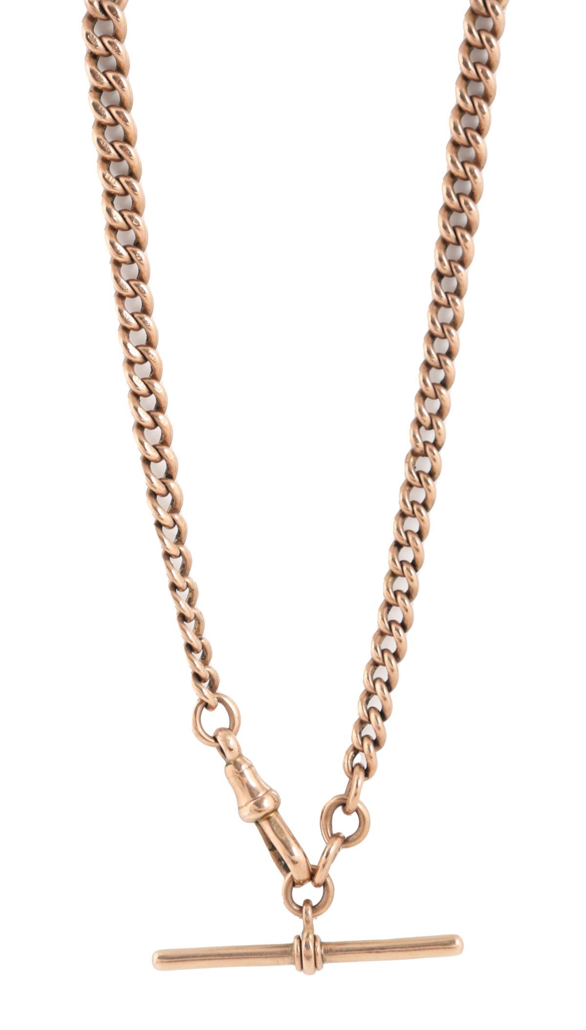 A gold curb-link Albert watch chain, formed of graduated curb links and fitted with a swivel clasp and T-bar suspension. 31 grams.