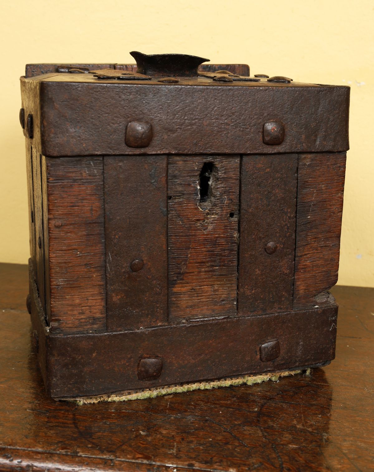 The rectangular hinged lid with iron strapwork mounts, enclosing fitted interior.