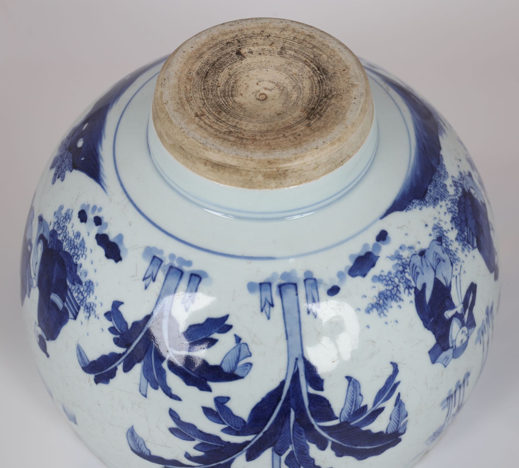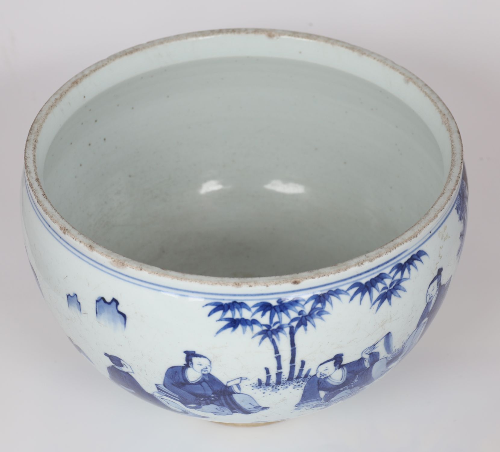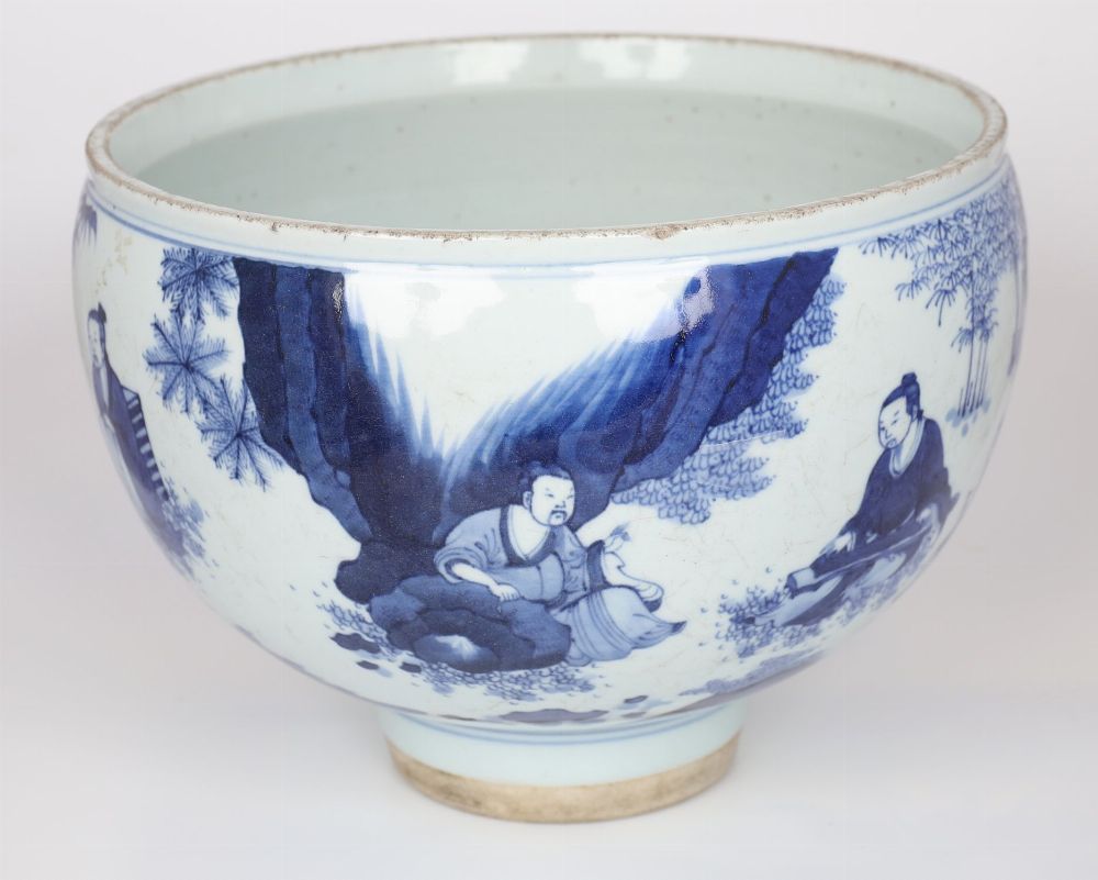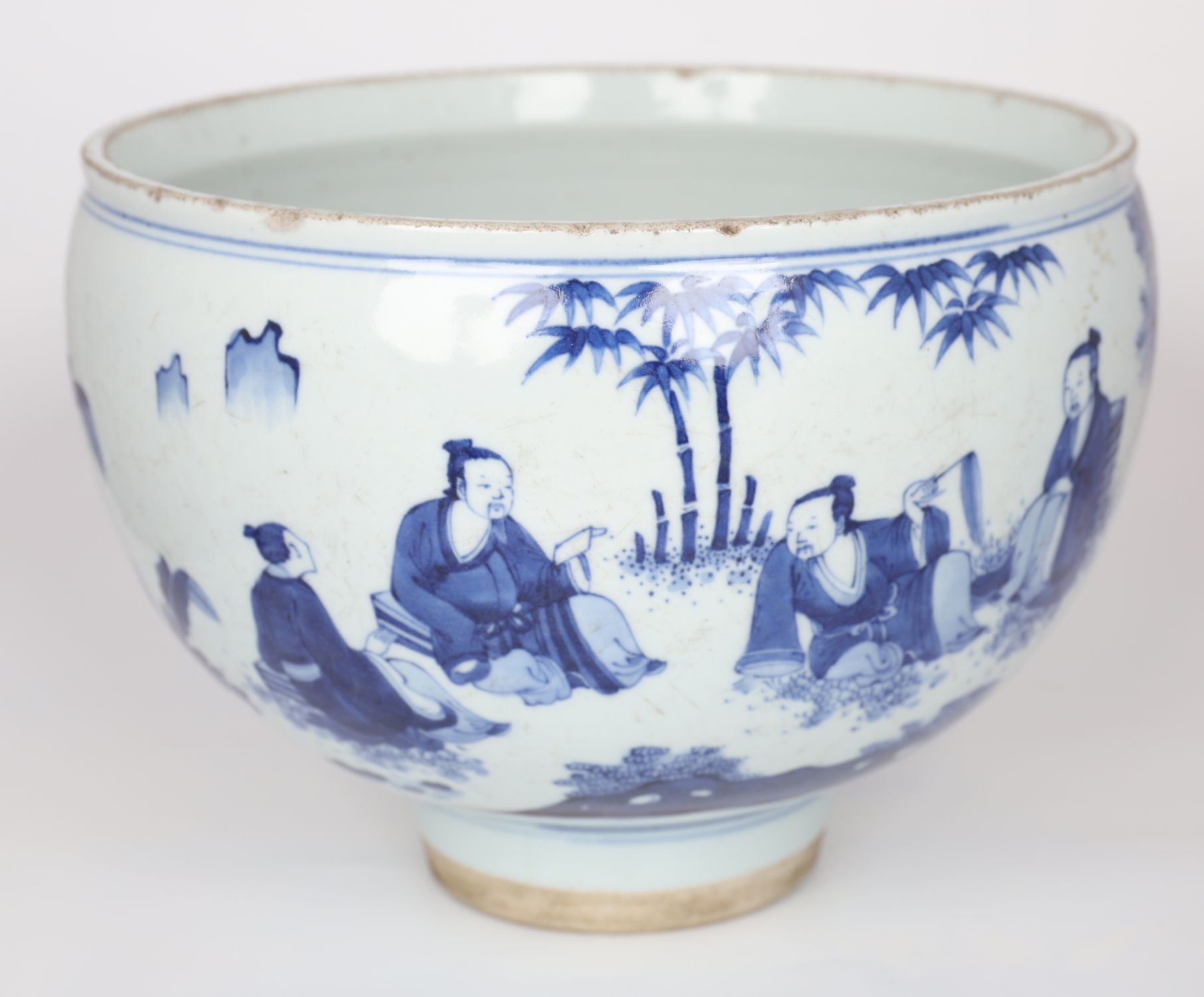 A large blue and white porcelain bowl decorated in underglaze cobalt with figures in a continuous bamboo garden landscape.