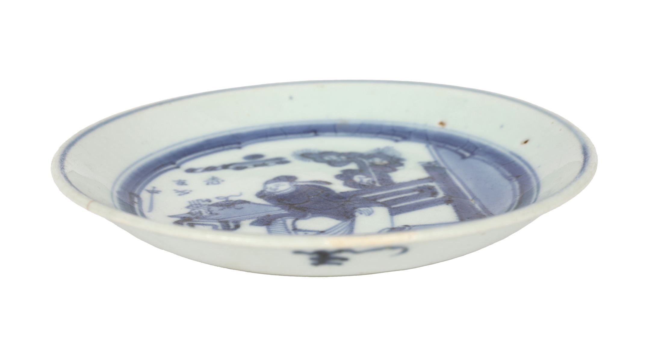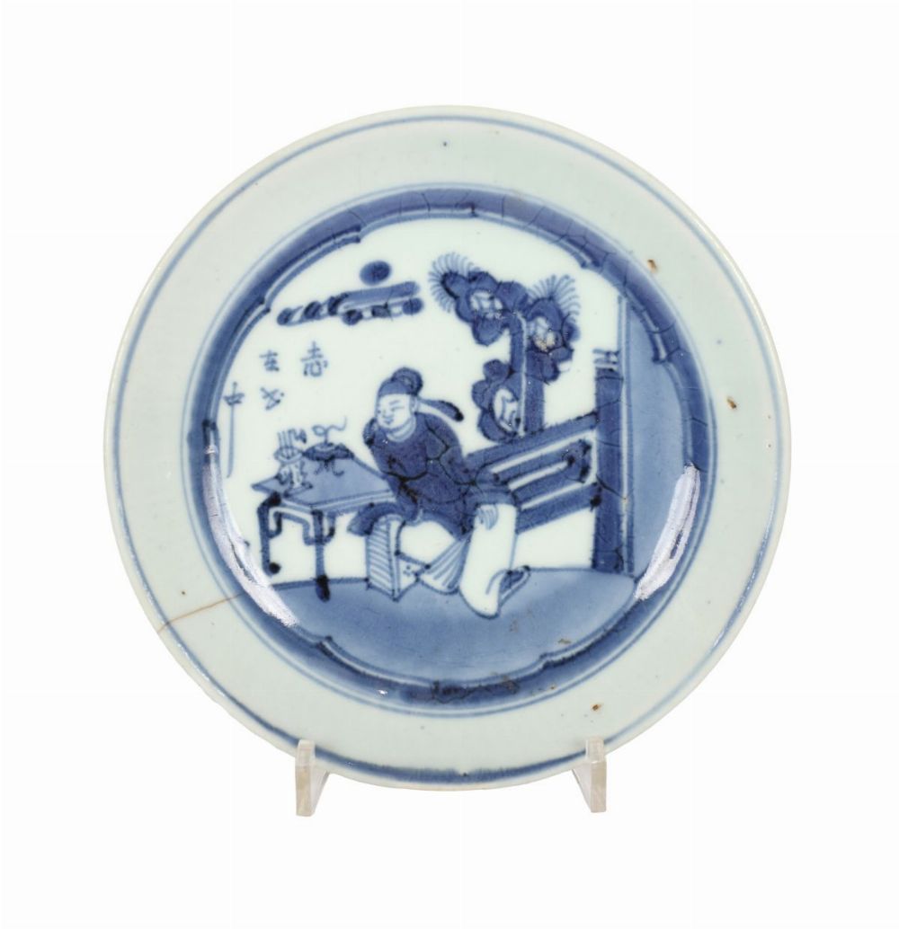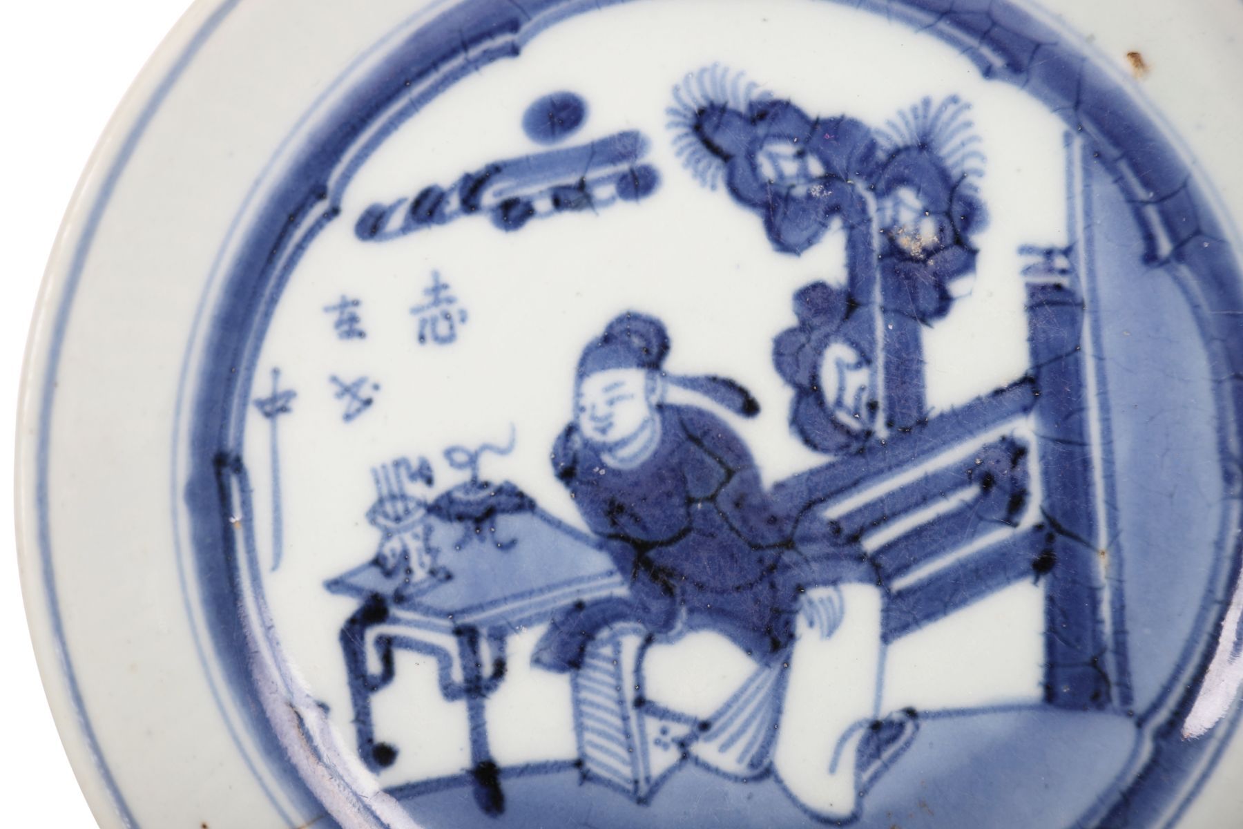 A Chinese blue and white porcelain plate, finely painted in underglaze cobalt blue with a scholar seated beside a low table beneath a pine tree, with calligraphic inscription to the left and enclosed within a double ring border. The rim with a light blue wash and exhibiting characteristic glaze crackle and minor kiln imperfections.