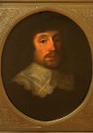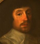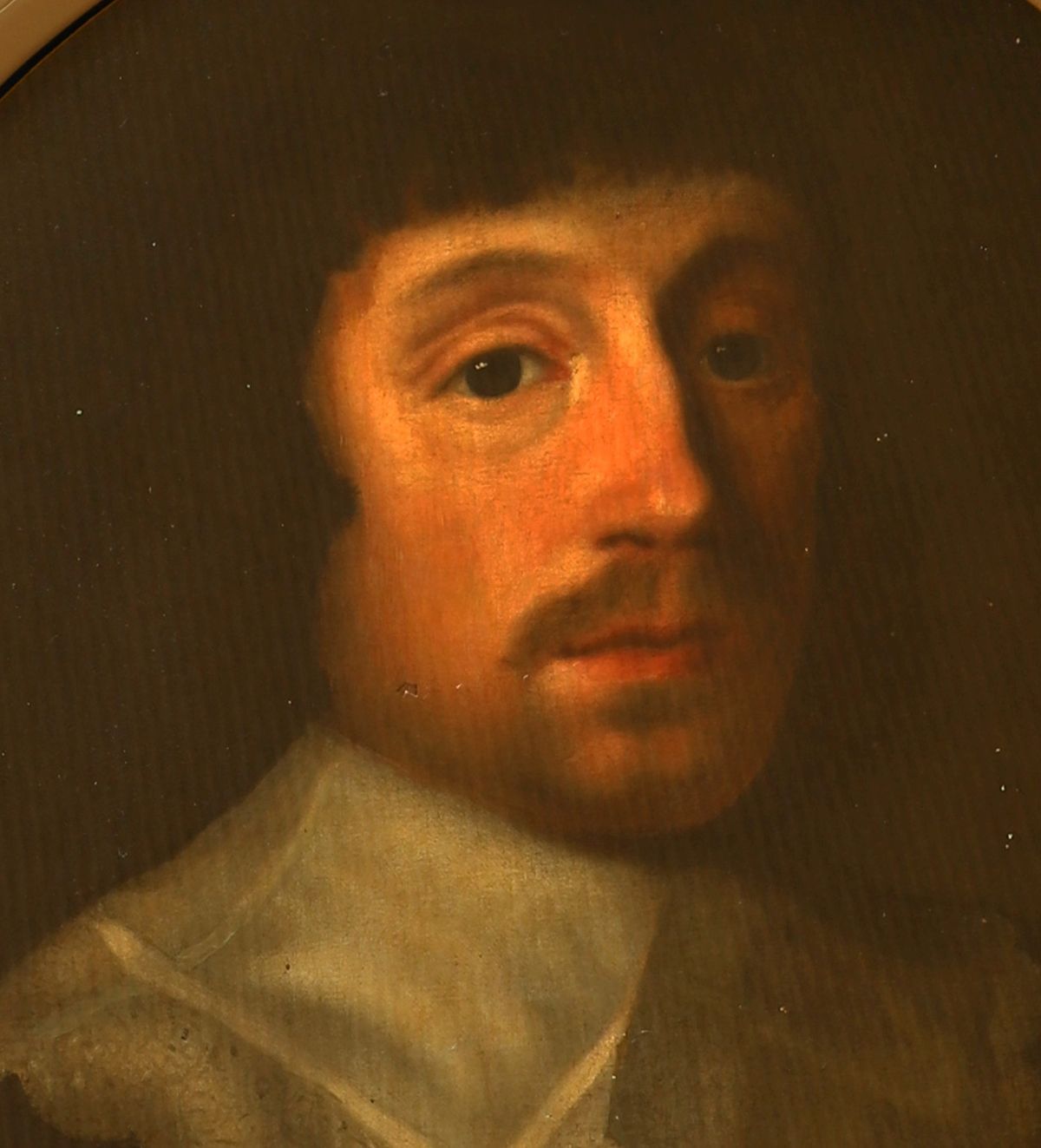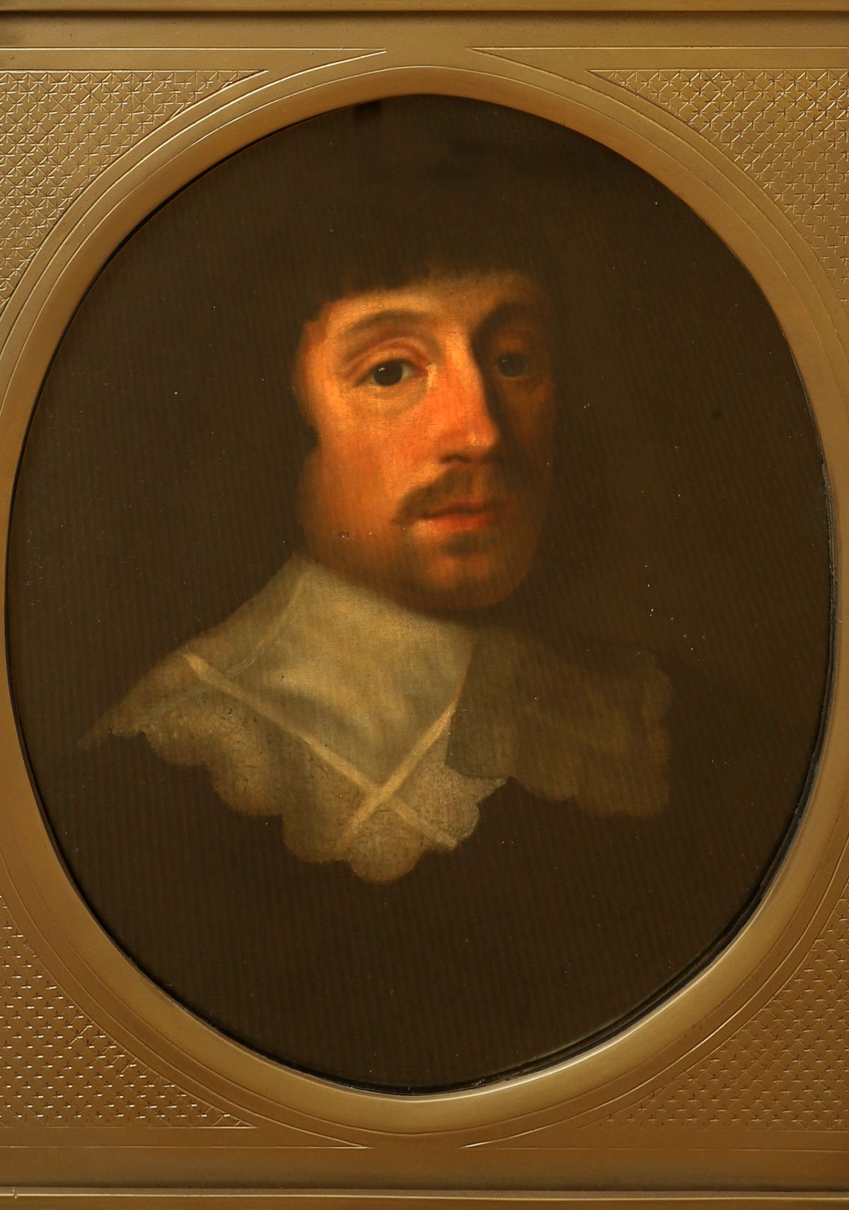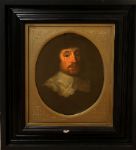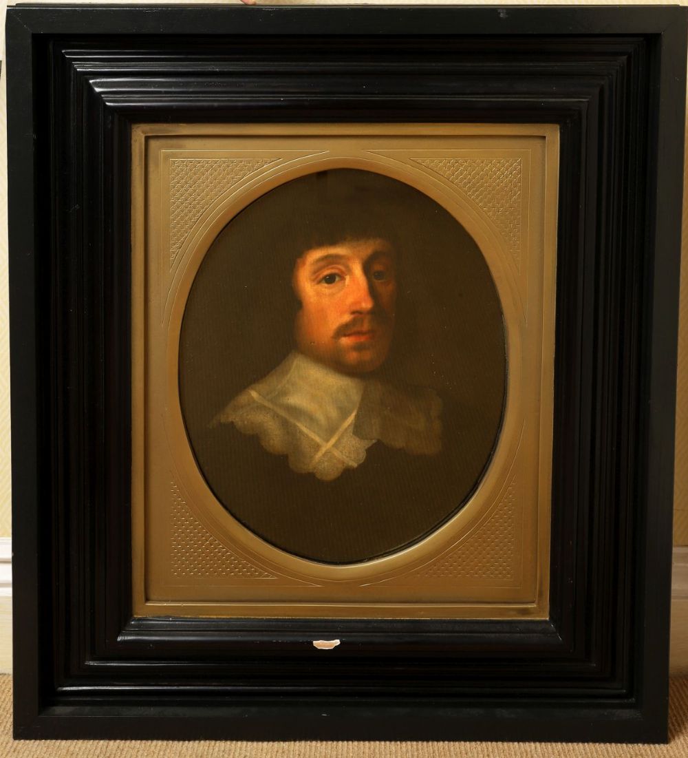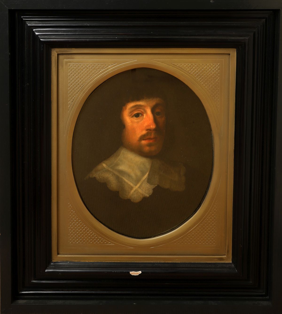 Oval portrait of a gentleman with lace collar and dark attire, presented in an ebony frame with gilt mount. Oil on canvas.