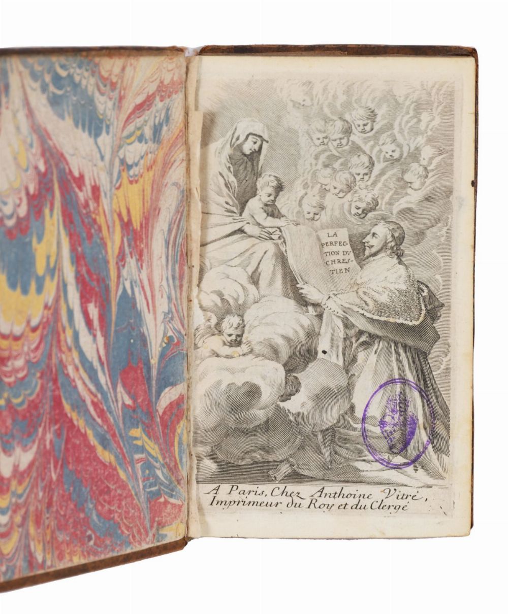 Small octavo. Engraved allegorical frontispiece depicting the Virgin and Child presenting the text La Perfection du Chrétien to a kneeling cleric, imprint at foot: À Paris, Chez Anthoine Vitré, Imprimeur du Roy et du Clergé.
