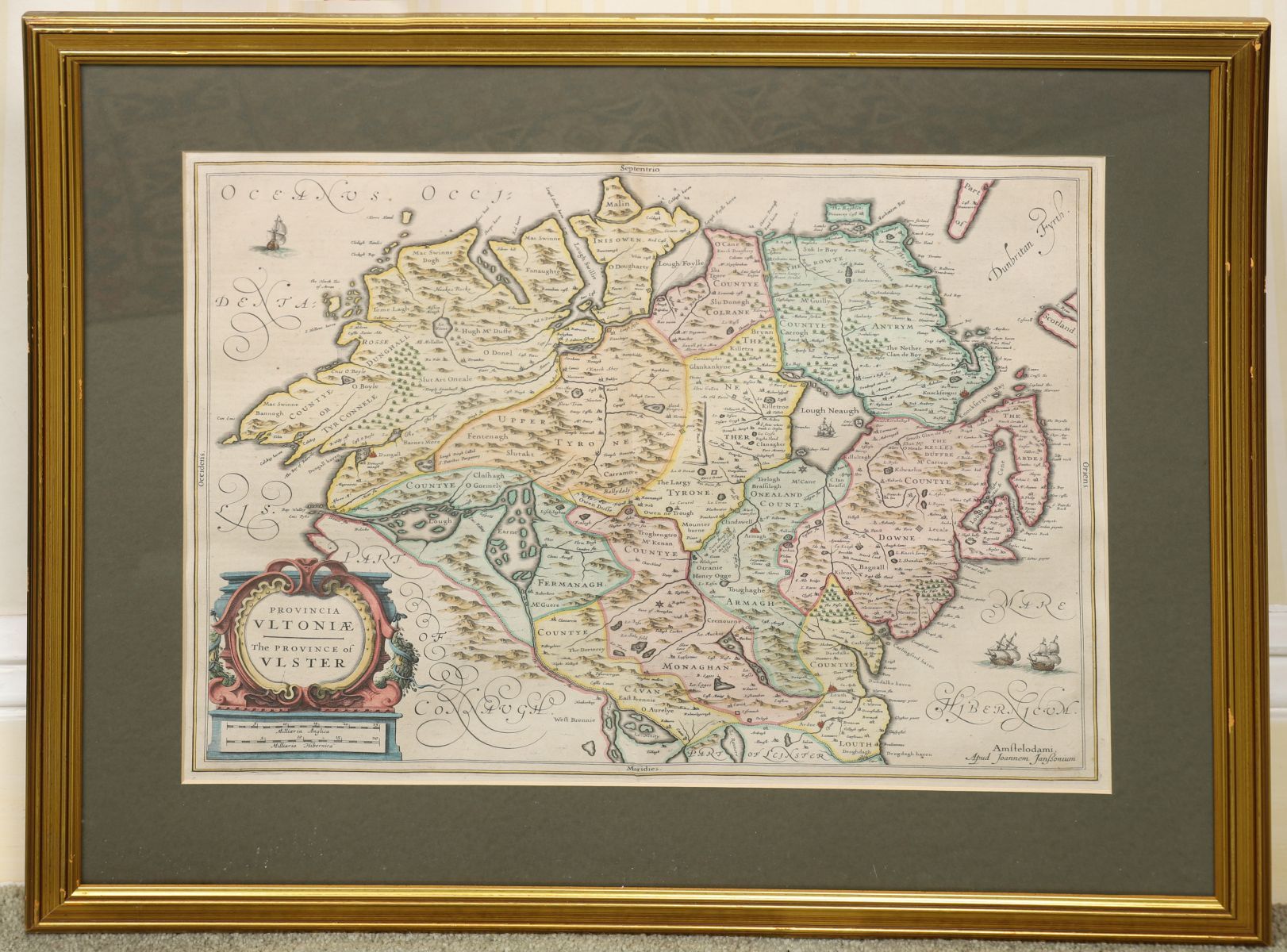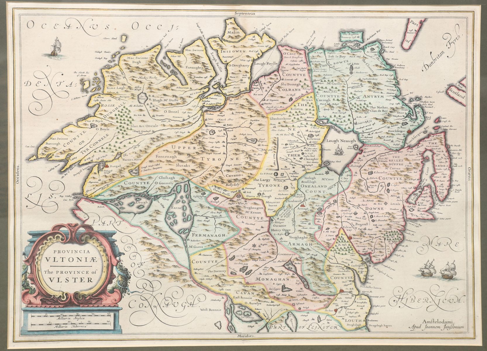 Provincia Ultoniae – The Province of Ulster, engraved map by Johannes Janssonius, with hand-colouring and decorative cartouche, framed. Amsterdam, mid-17th century.