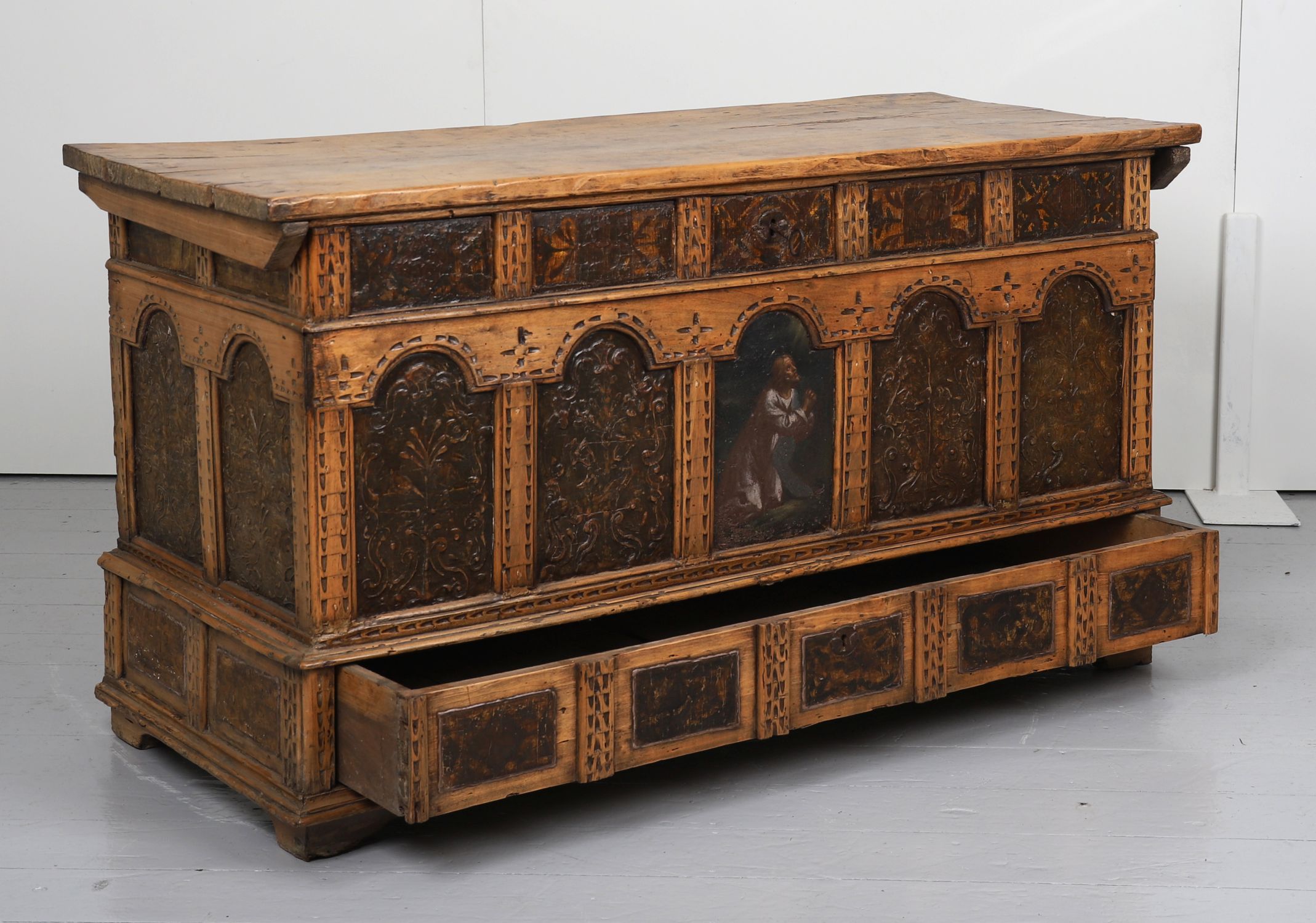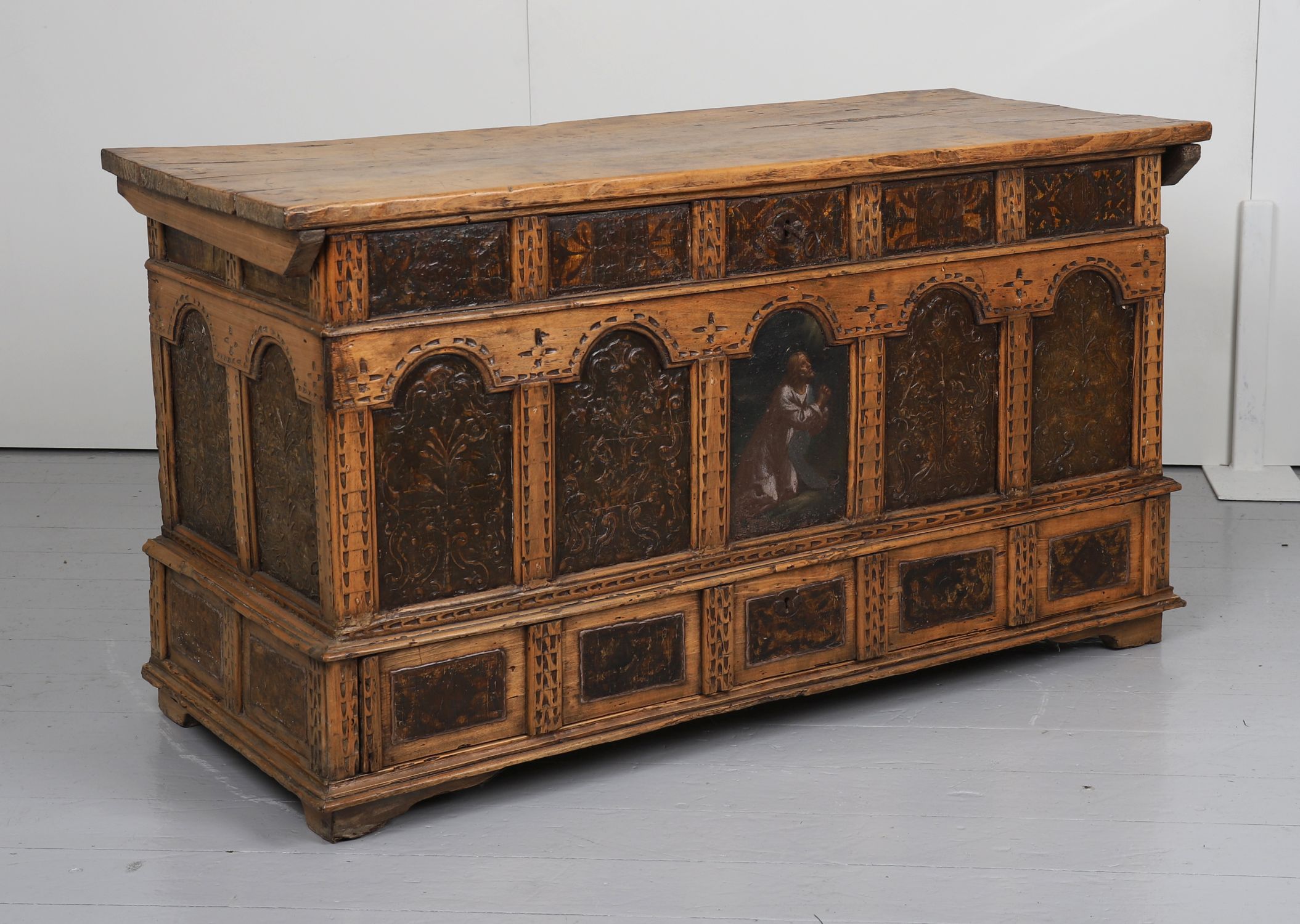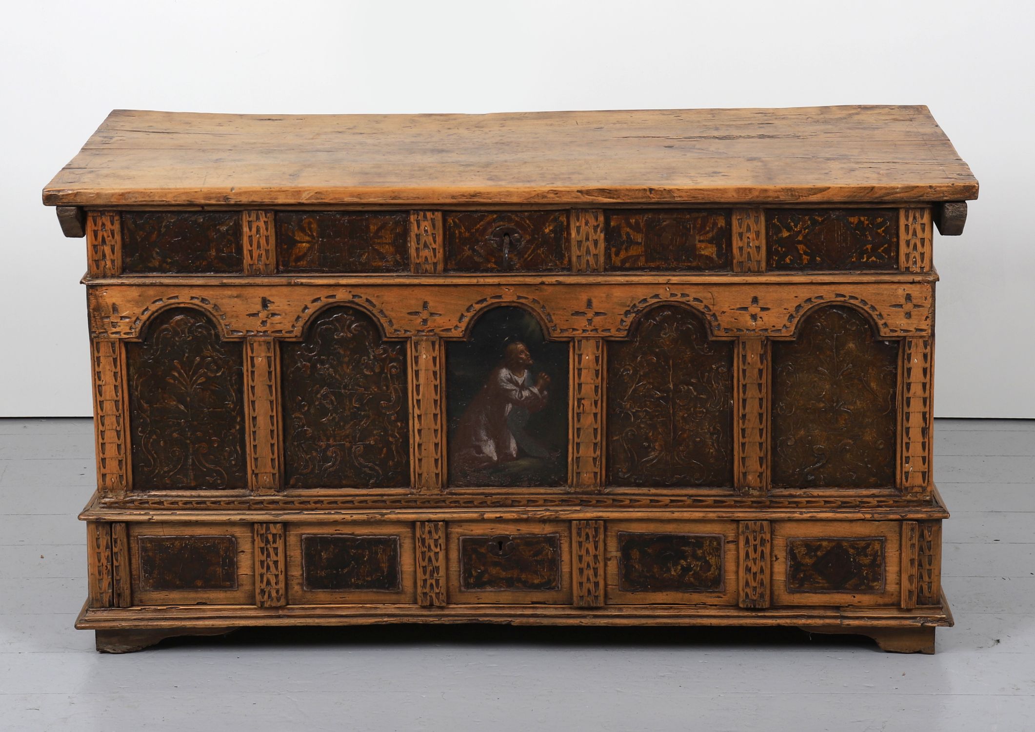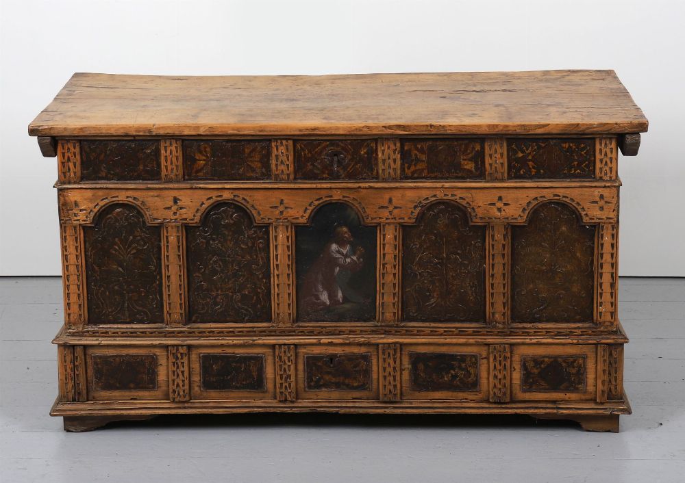 A rectangular oak and pine coffer, painted and parcel-gilt, the façade with Gothic-style arcaded leather panels enclosing floral motifs and religious imagery, the central niche depicting a kneeling donor figure. Hinged plank lid and moulded base.