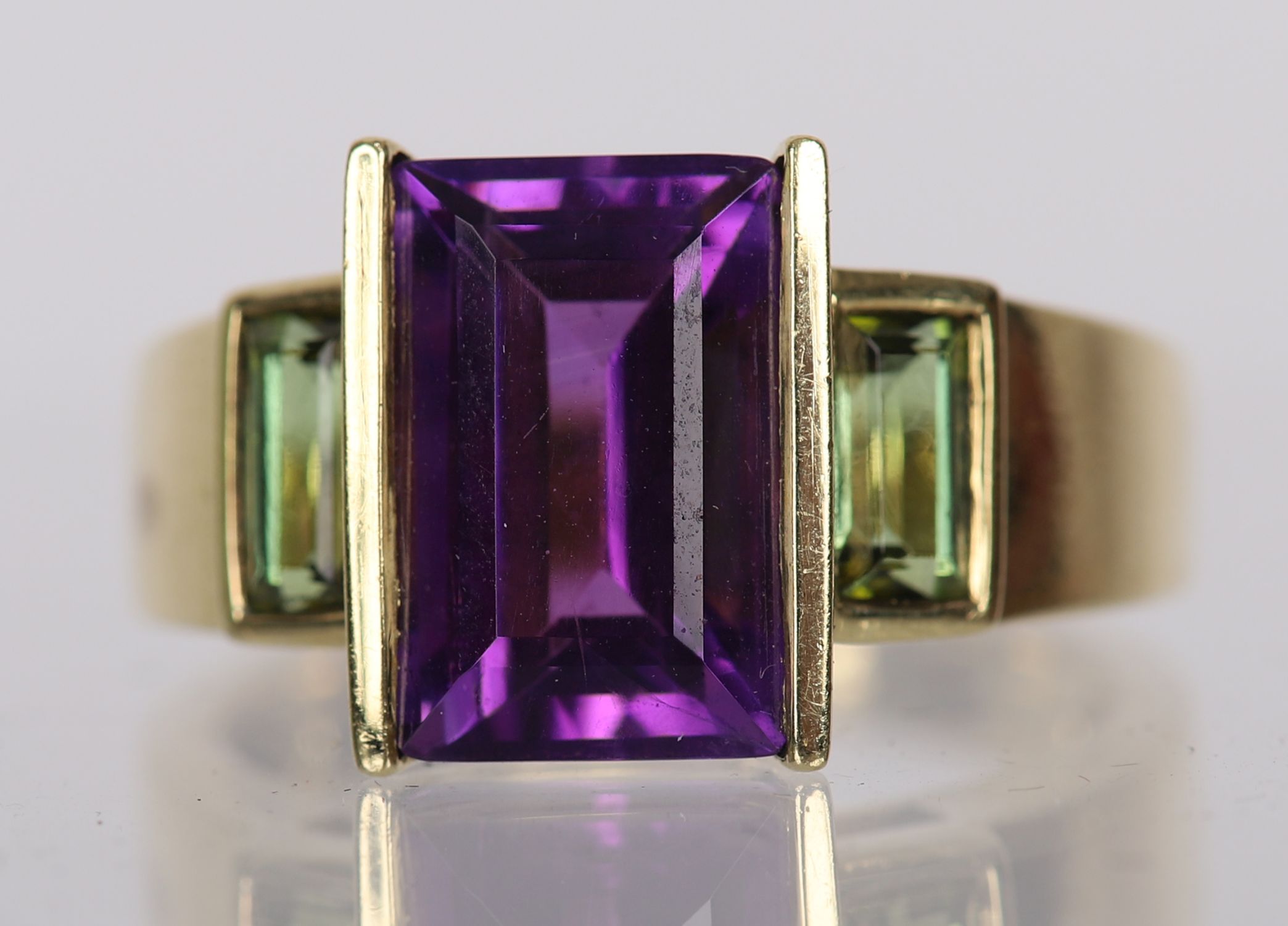 Rectangular step-cut amethyst of approx. 4.00 carats flanked by green tourmalines totalling approx. 0.90 carats, set in 18 carat yellow gold.