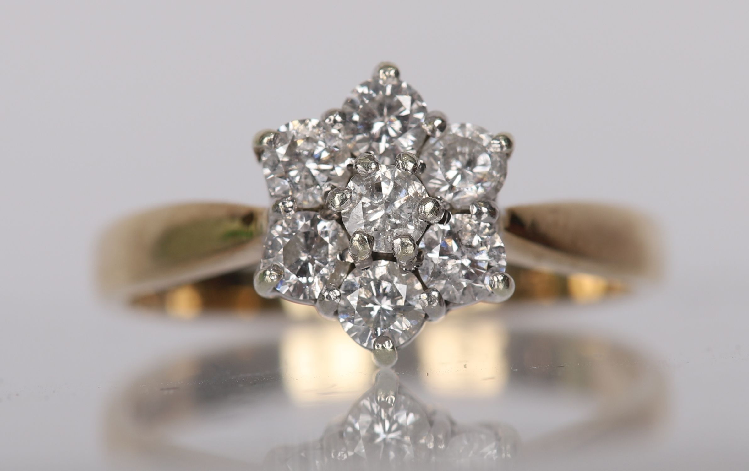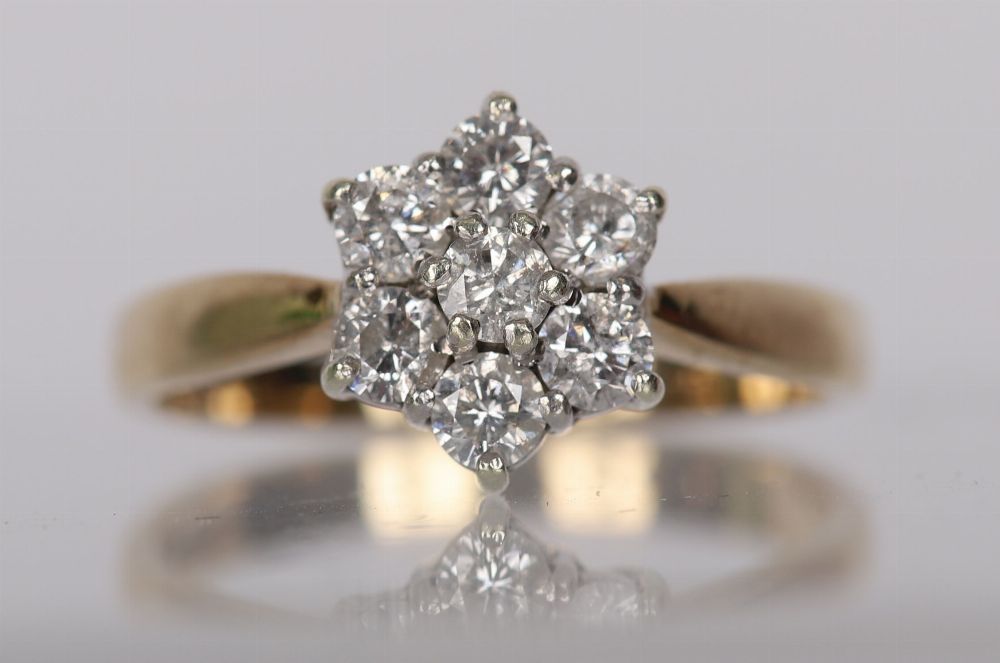 Central brilliant-cut diamond framed by six smaller diamonds in a classic cluster setting, approx. 0.80 carats total, in 18 carat yellow gold.