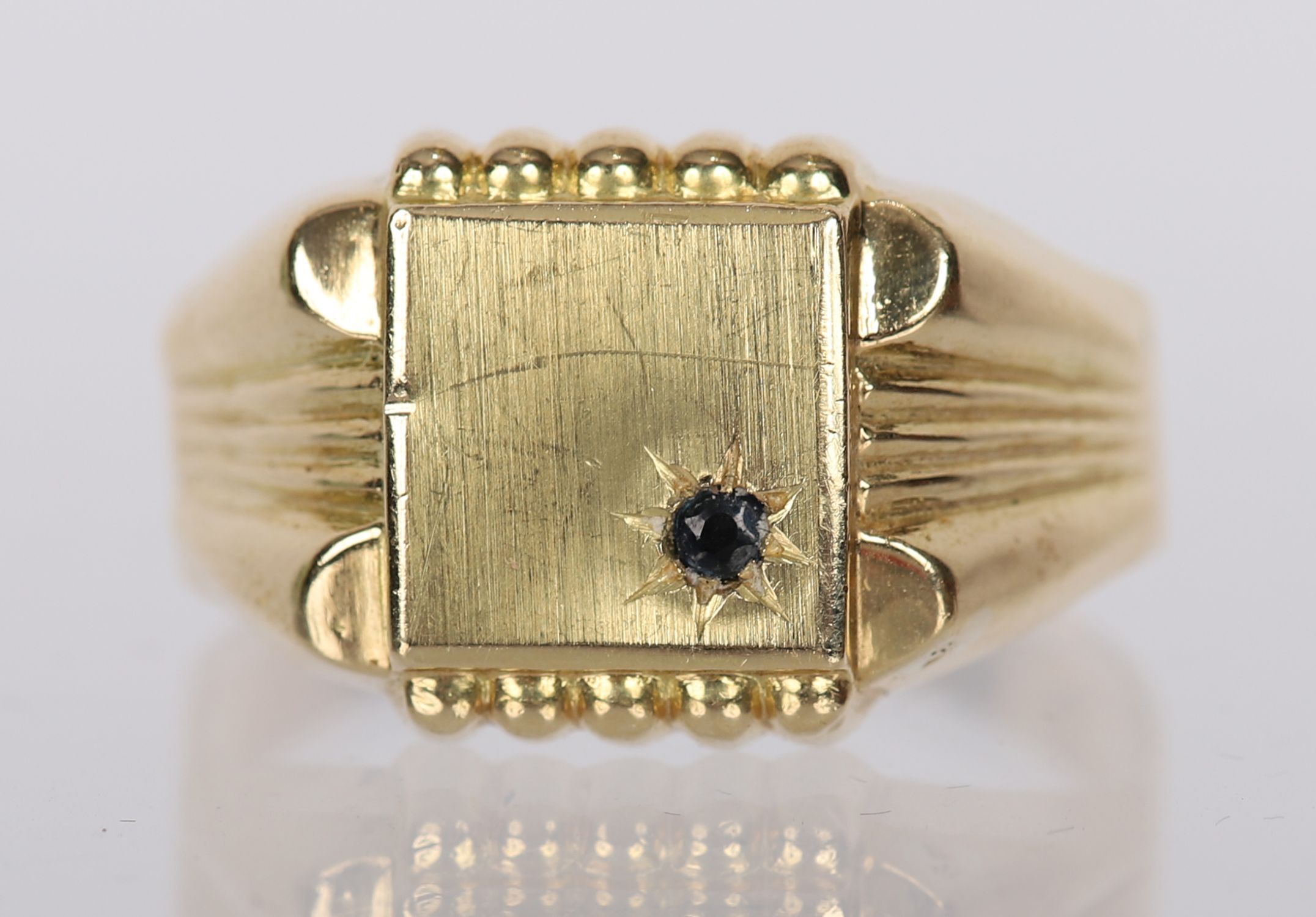 A rectangular 18 carat yellow gold signet-style ring, claw-set with a small sapphire within a chased mount.