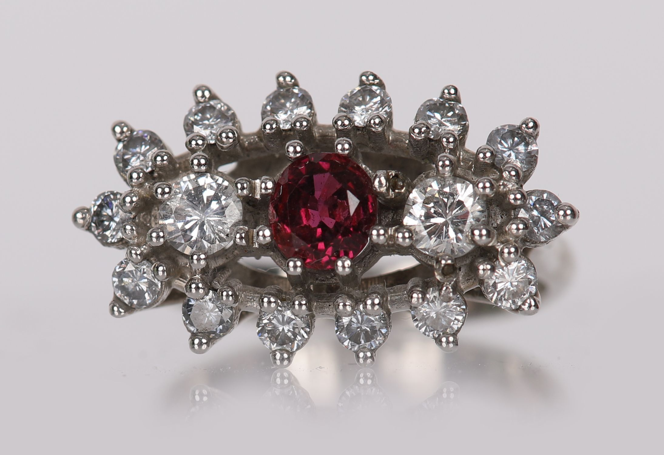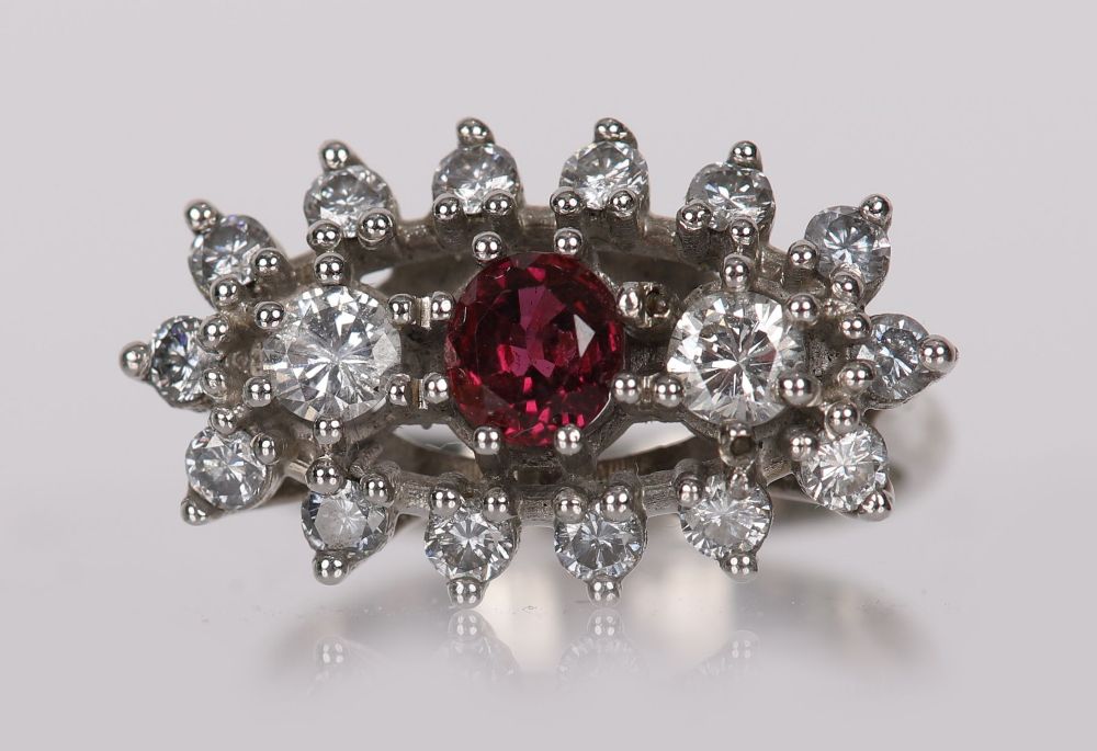 Lot 1386 18 CARAT WHITE GOLD RUBY AND DIAMOND CLUSTER RING