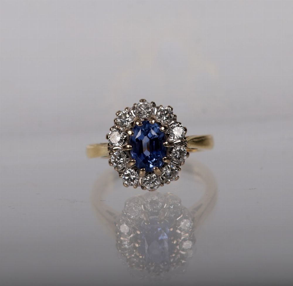 An 18 ct. yellow gold ring centred by an oval Ceylon sapphire within a border of brilliant-cut diamonds, the total diamond weight approximately 1.0ct.