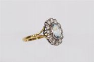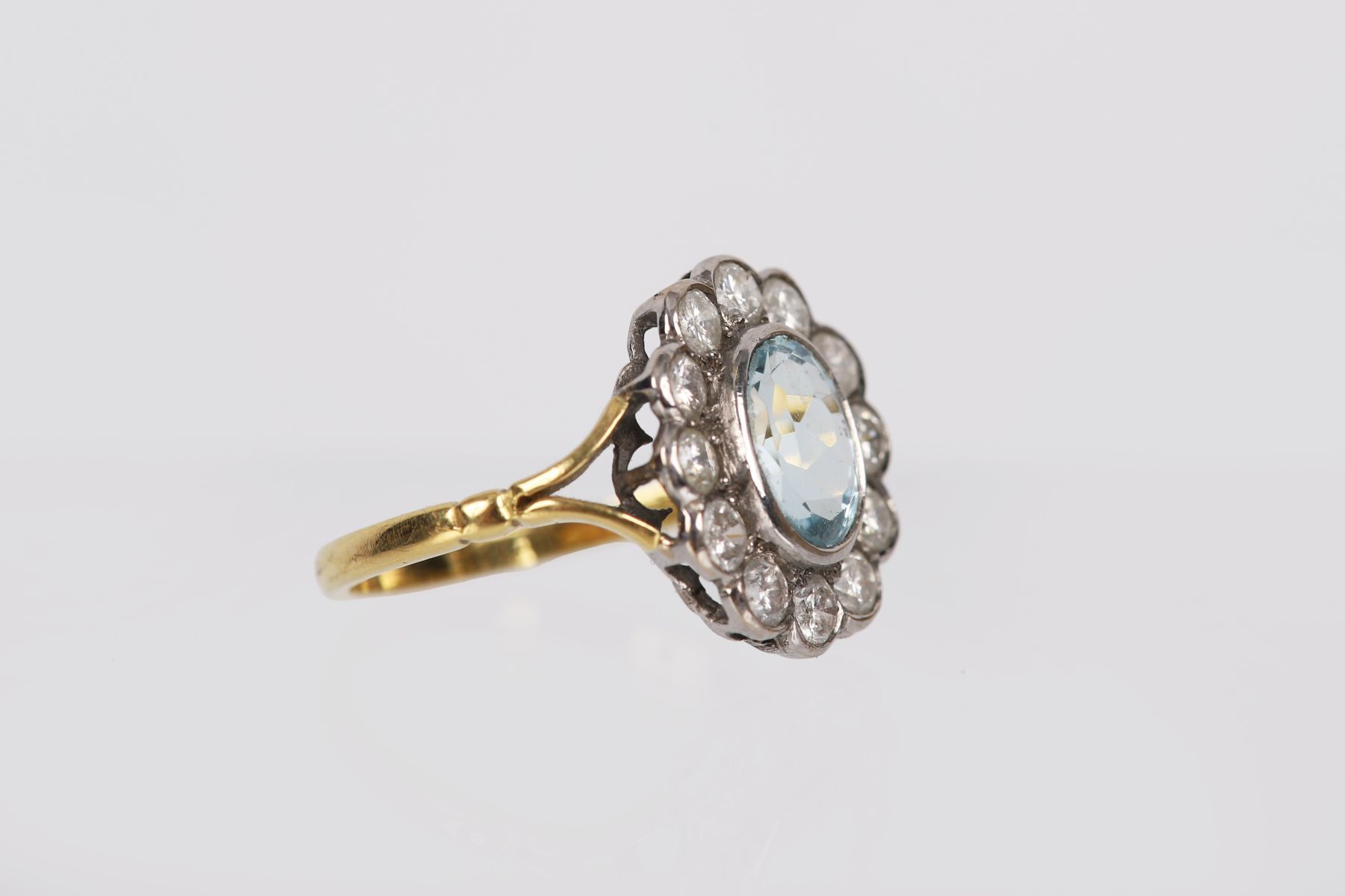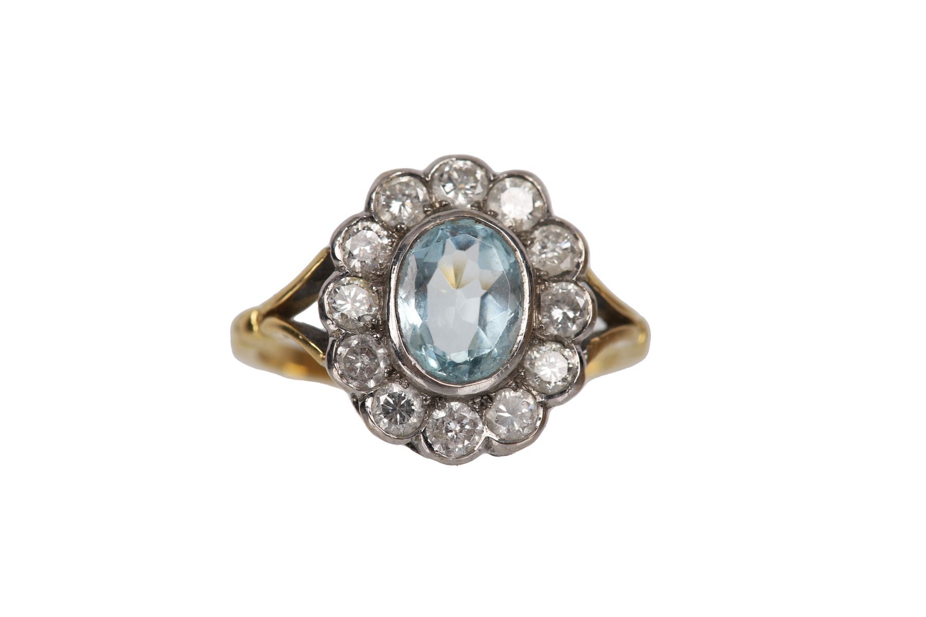An 18 ct. gold cluster ring set with an oval-cut aquamarine surrounded by brilliant-cut diamonds in a scalloped border.