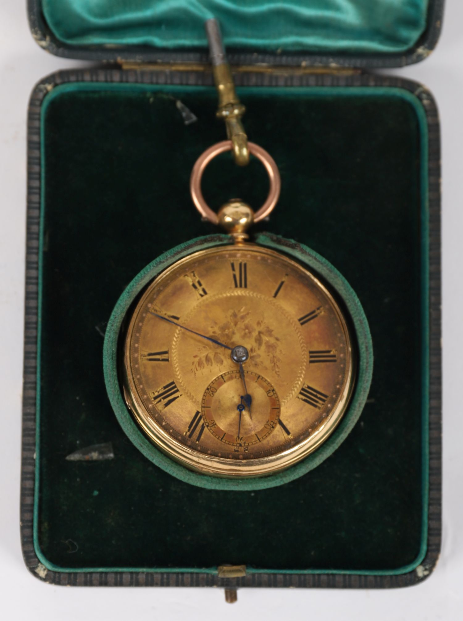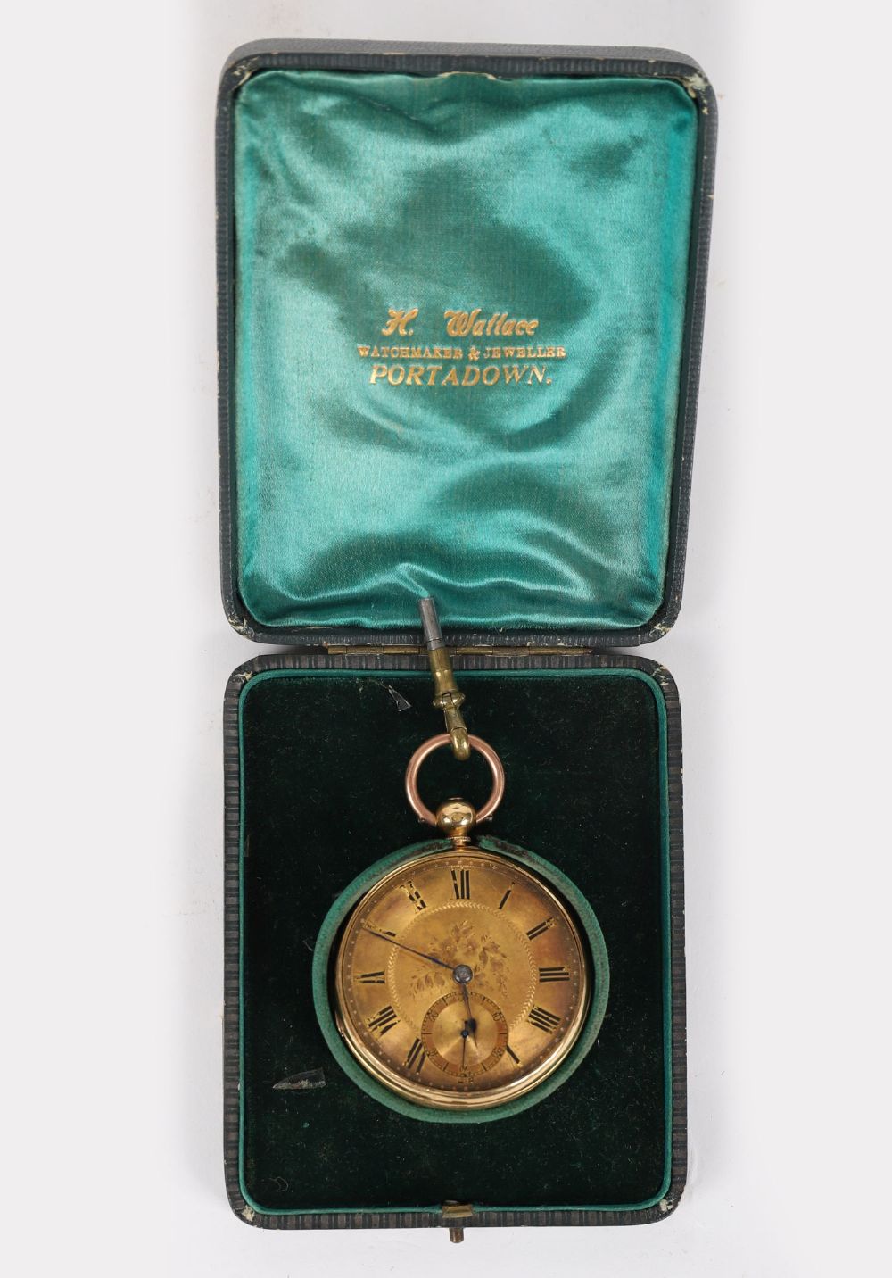 An 18 carat gold keywind pocket watch with engraved dial and Roman numerals, housed in fitted retailer's case for H. Wallace, Portadown.