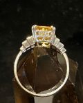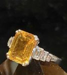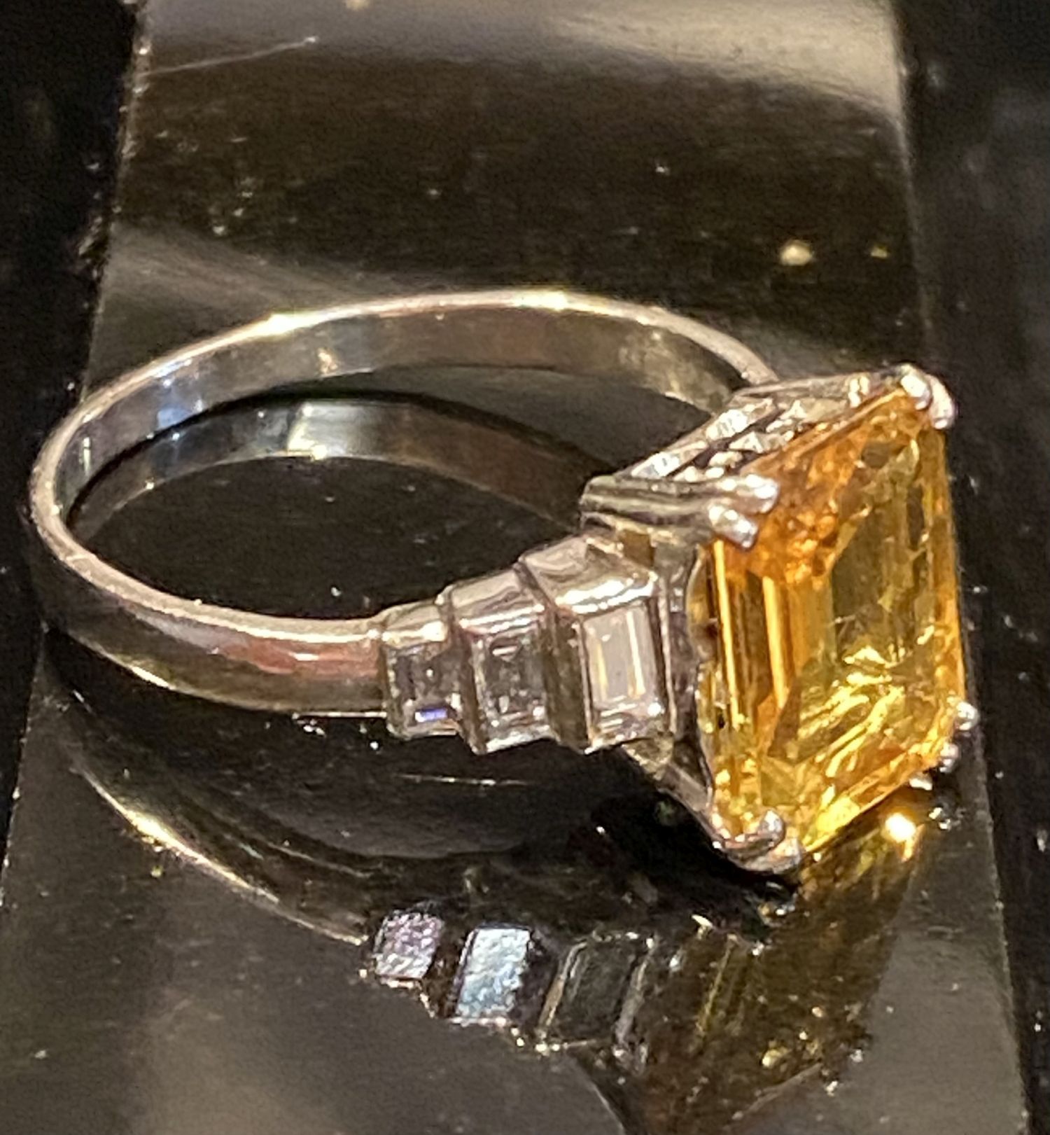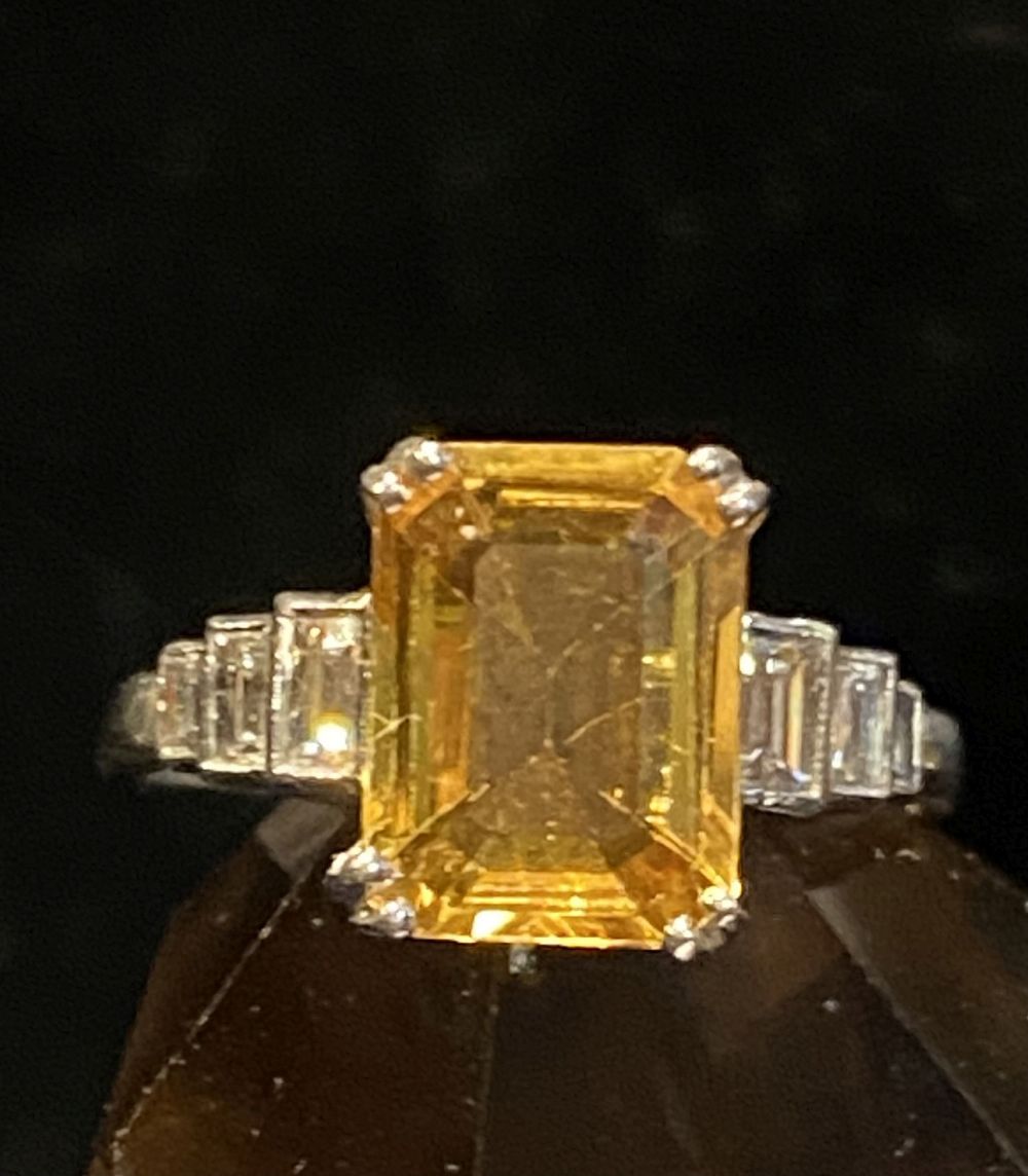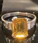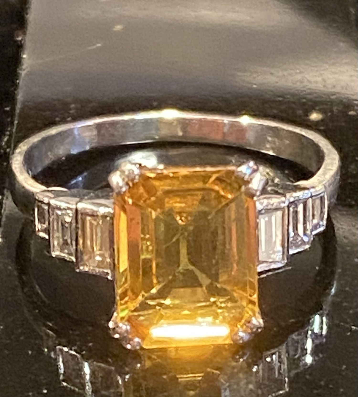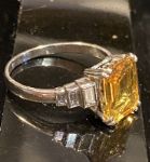 Lot 1413 18 CT. WHITE GOLD EMERALD CUT GOLDEN YELLOW SAPPHIRE WITH BAGUETTE DIAMOND SHOULDERS