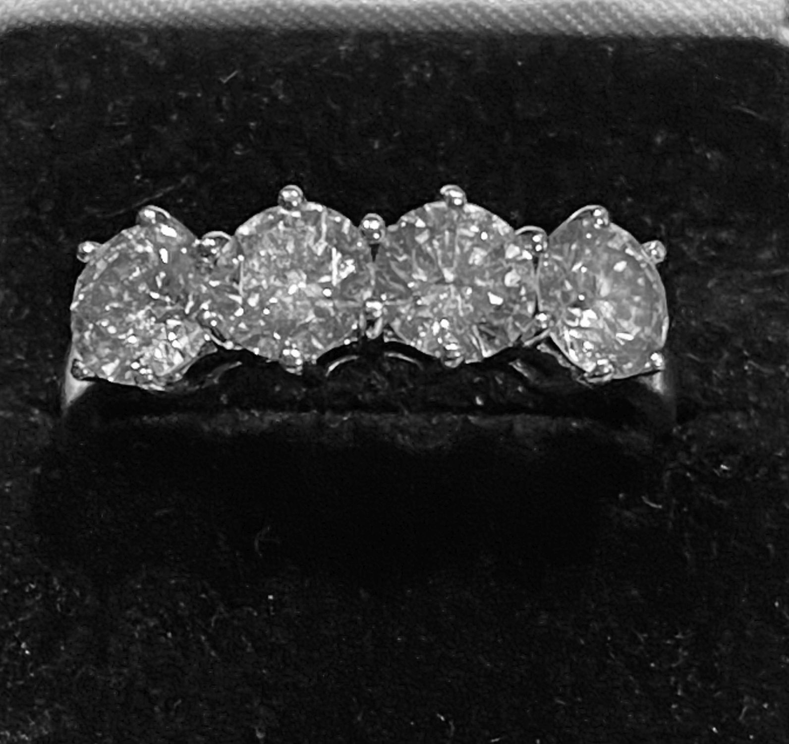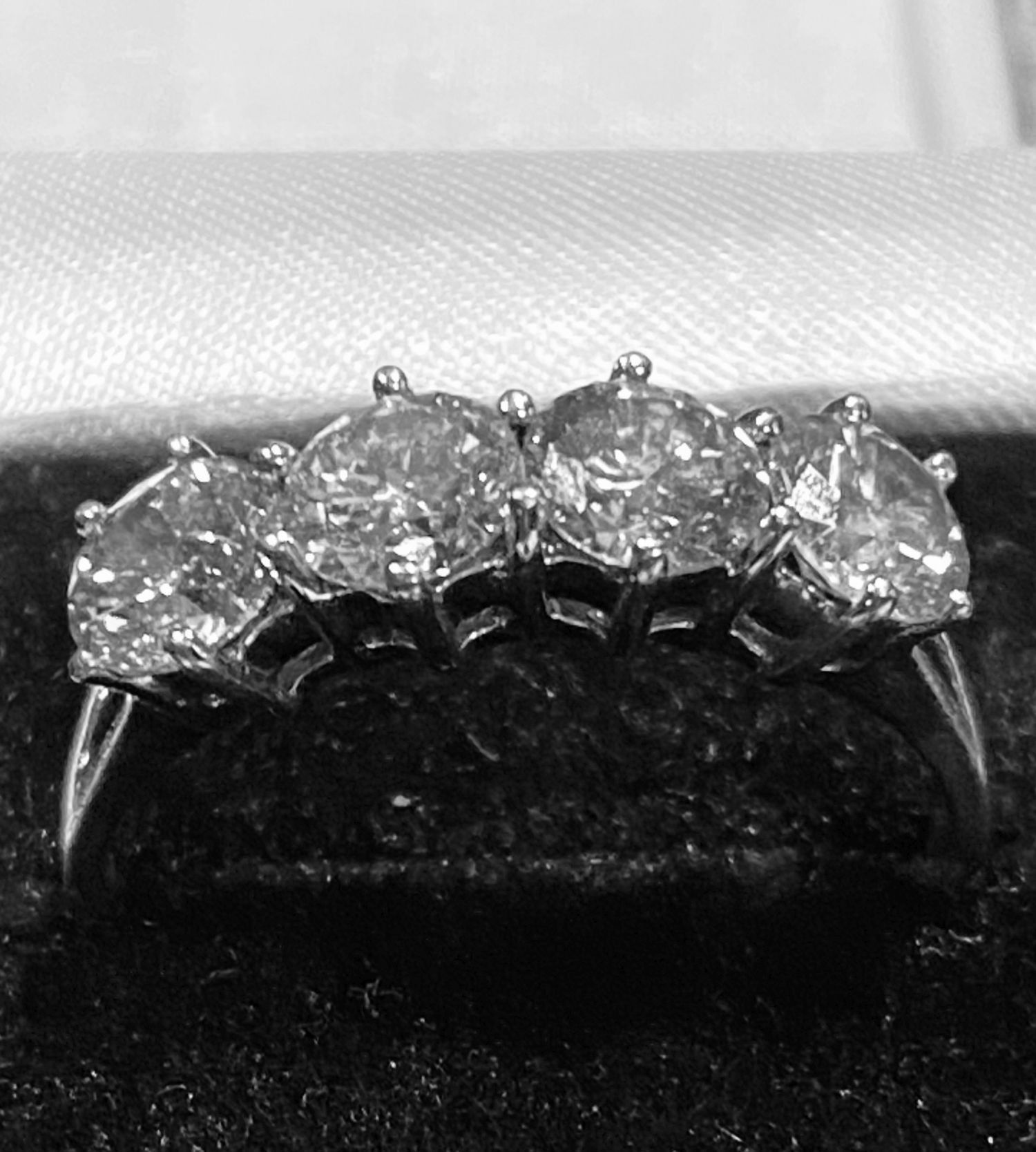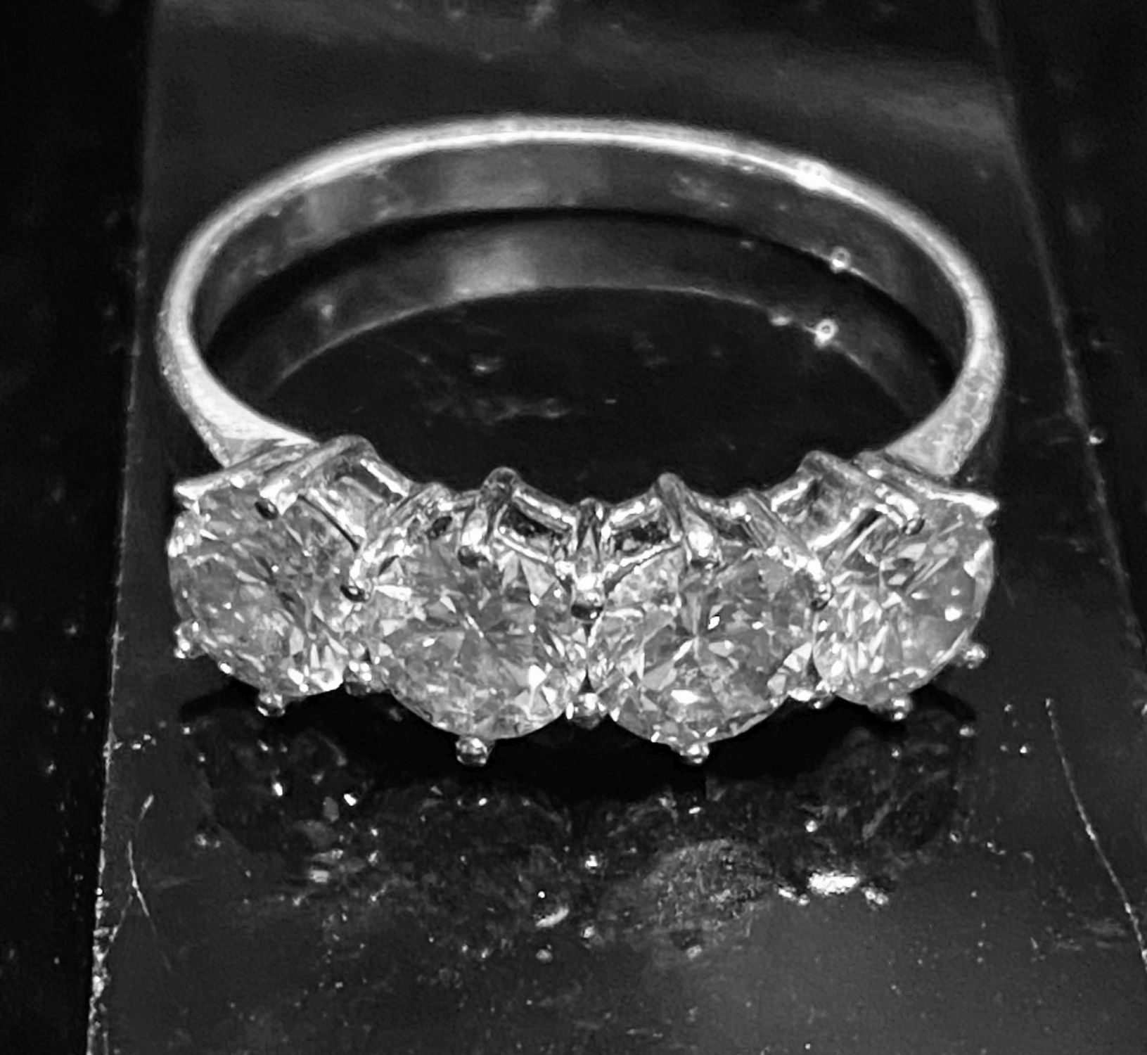 Lot 1358 18 CT. WHITE GOLD FOUR STONE CLAW SET DIAMOND RING