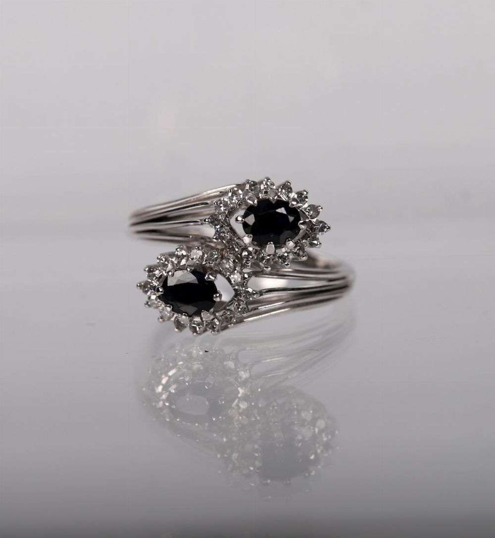 An 18 ct. white gold ‘toi et moi’ ring, set with two round sapphires, each encircled by brilliant-cut diamonds, in crossover design.