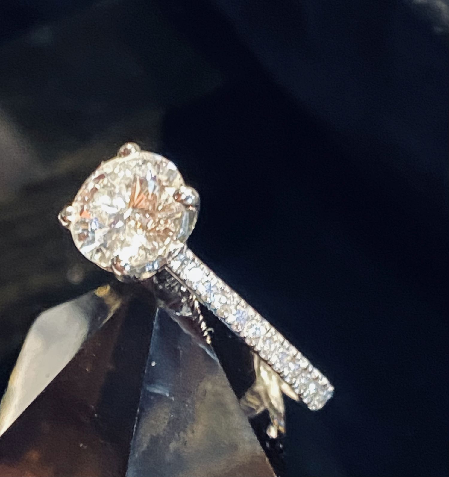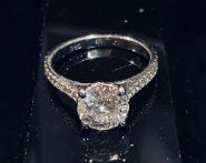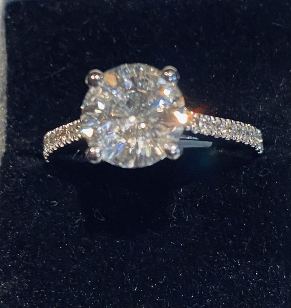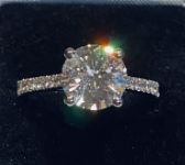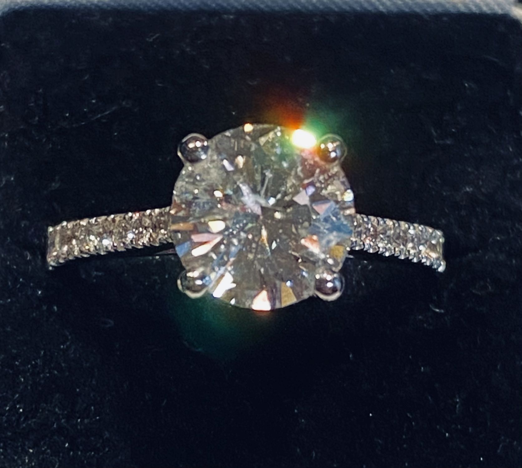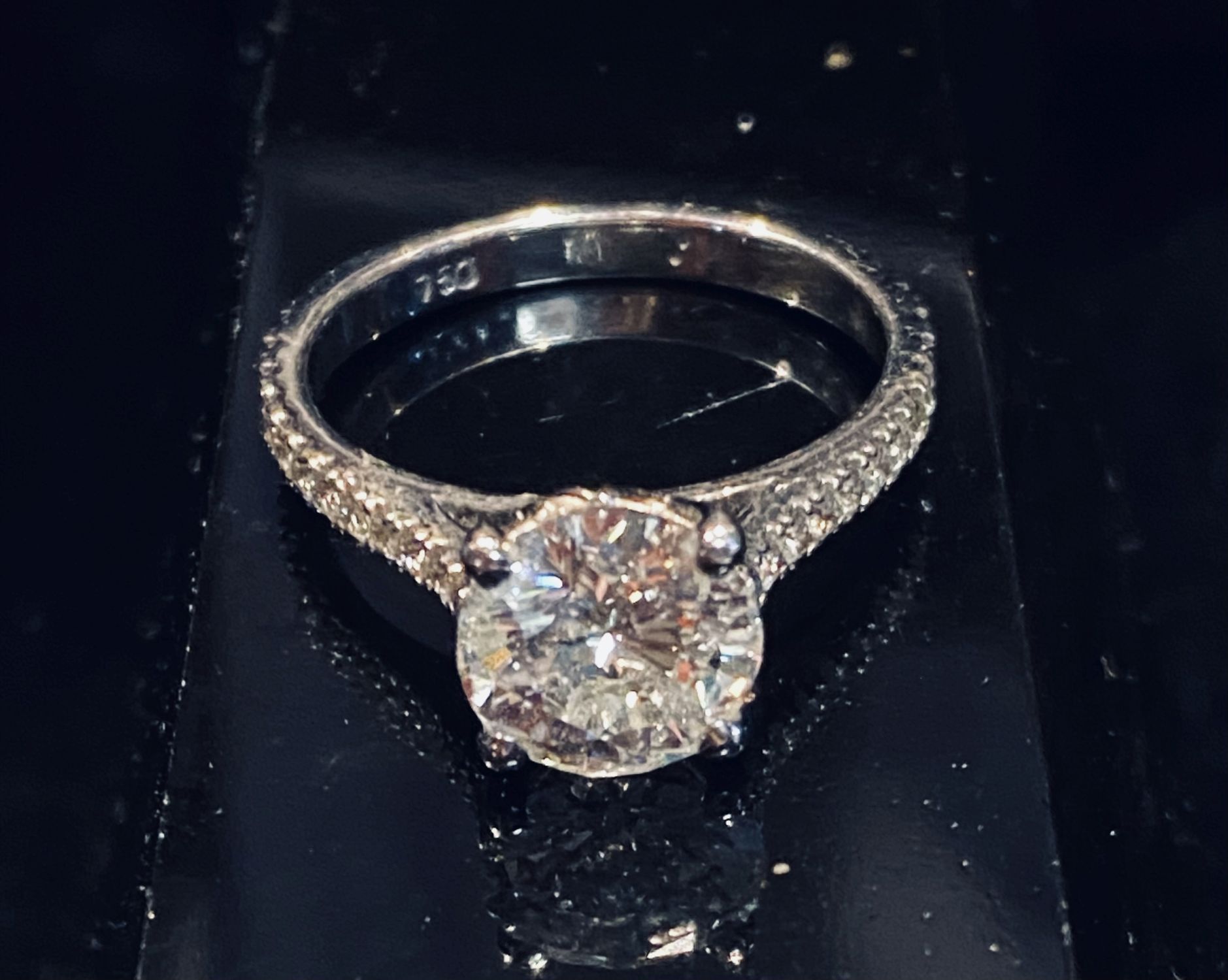 Solitaire diamond weight: 2.01 ct. in a four claw setting and finished with diamond shoulders. Diamond colour: G; clarity: VS1.