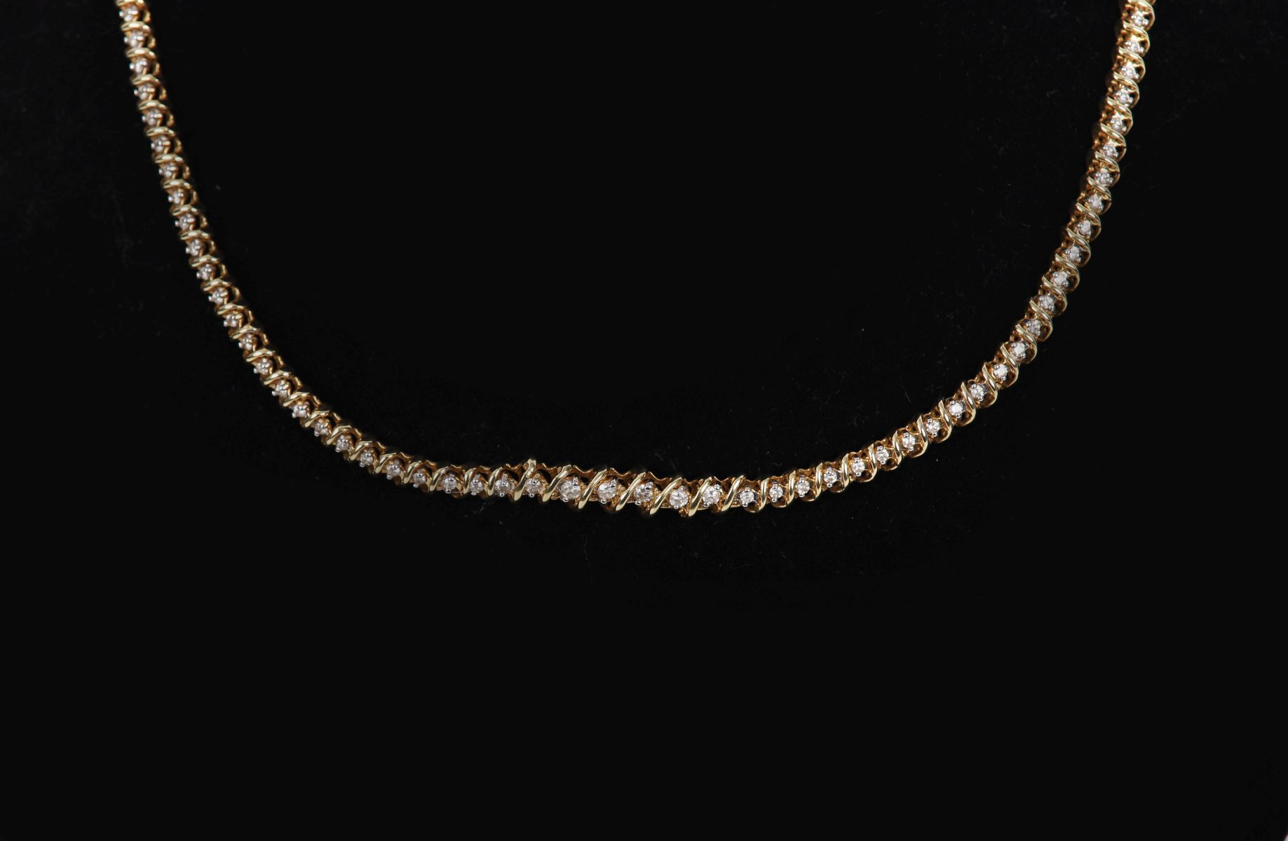 An elegant 18 ct. yellow gold necklace of articulated design, set with round brilliant-cut diamonds, the total diamond weight approx. 4 carats. Fitted with a secure clasp. Accompanied by certificate of authenticity. 30.7 grams gold.