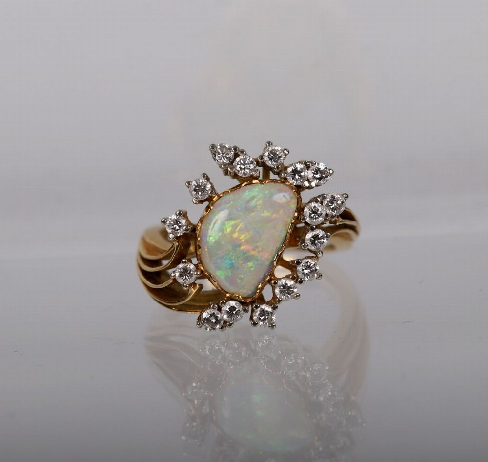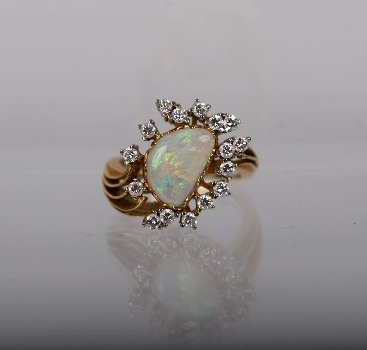 An 18 ct. yellow gold ring centred by a pear-shaped cabochon opal displaying vivid play of colour, surrounded by brilliant-cut diamonds totalling approximately 0.6 ct.