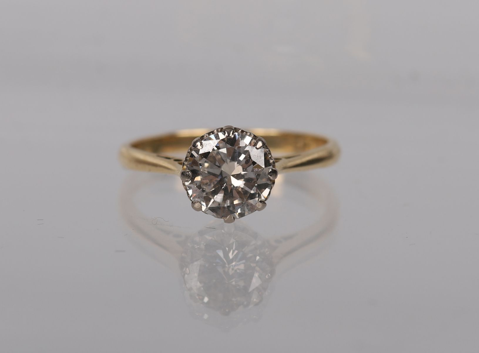 An 18 ct. yellow gold ring set with a single brilliant-cut diamond of approximately 1.5 ct.; colour F/G; clarity SI 1.