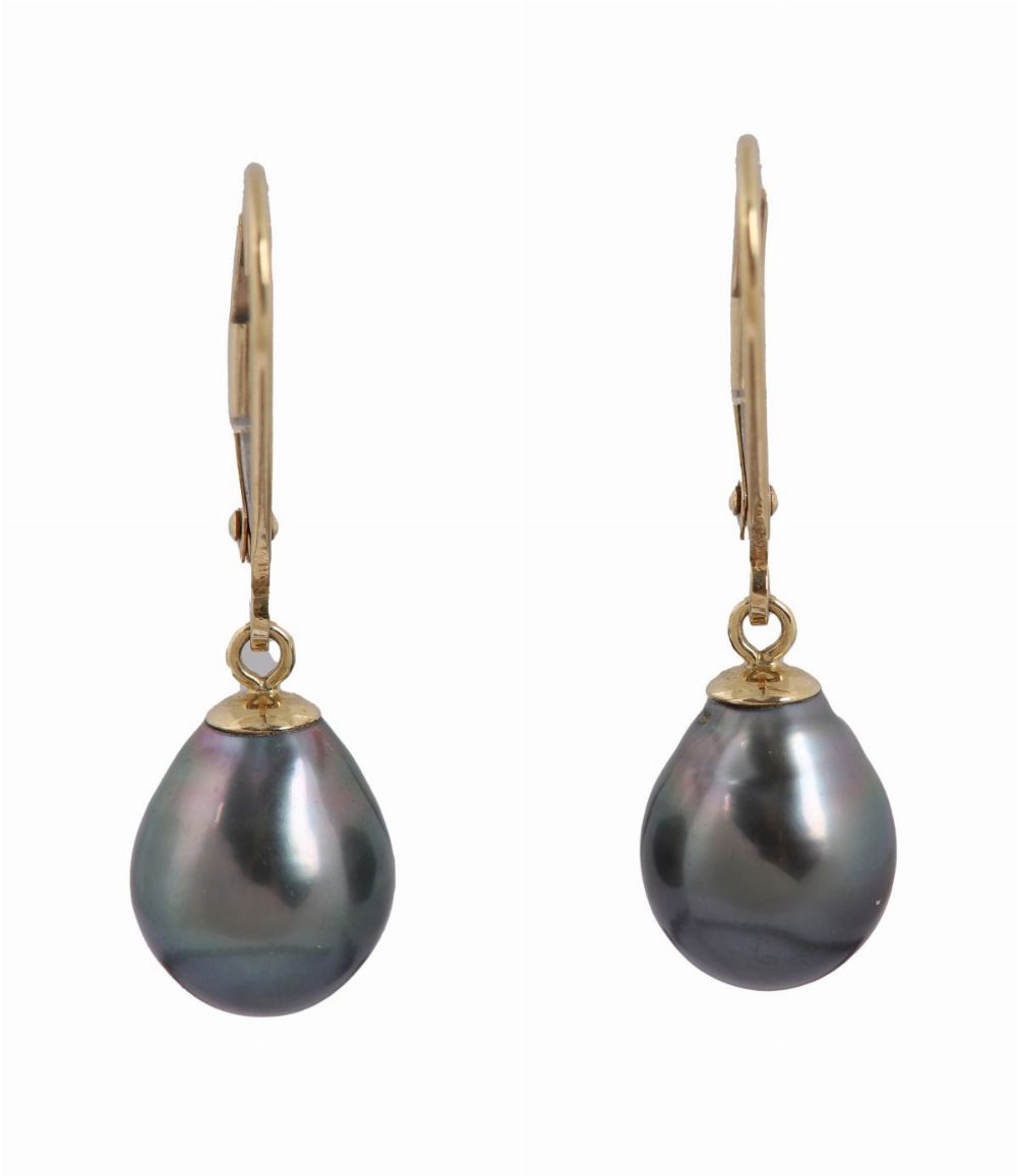 18ct. gold and black pearl drop earrings.