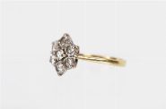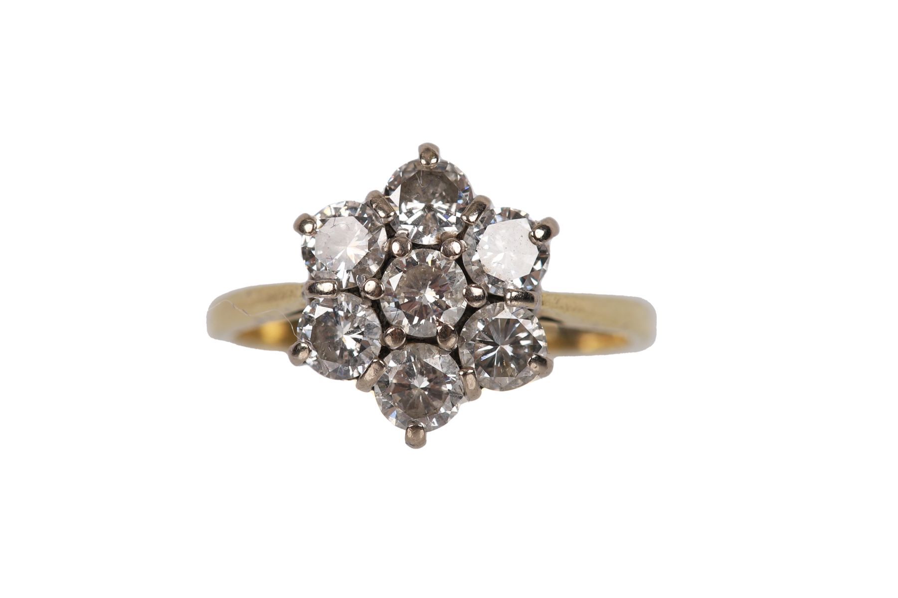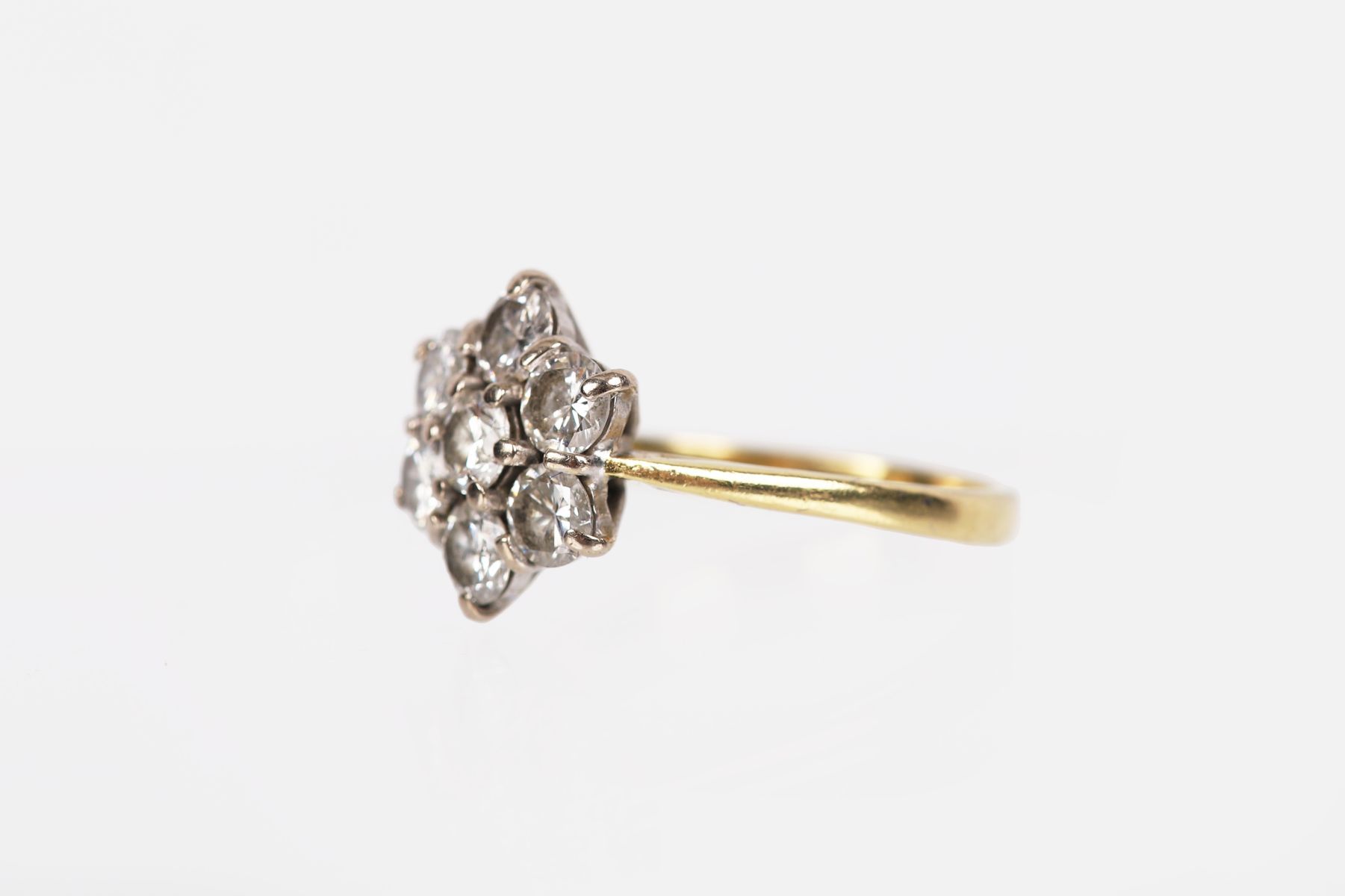 An 18 ct. yellow gold diamond cluster ring, set with brilliant-cut diamonds arranged in a floral motif, on a plain shank.