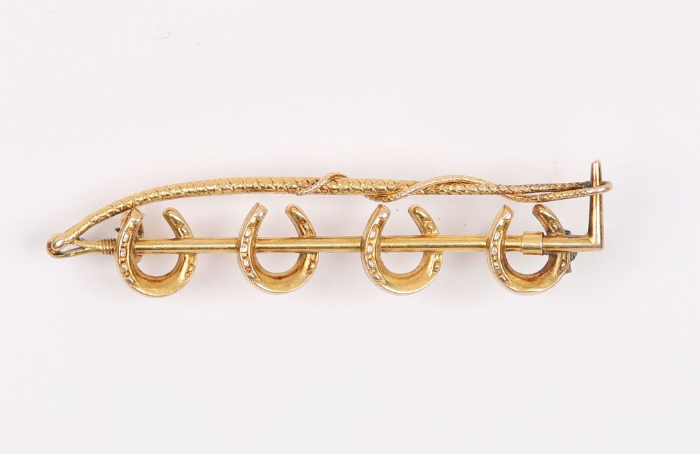 Lot 1400 18CT GOLD HORSESHOE AND WHIP BROOCH