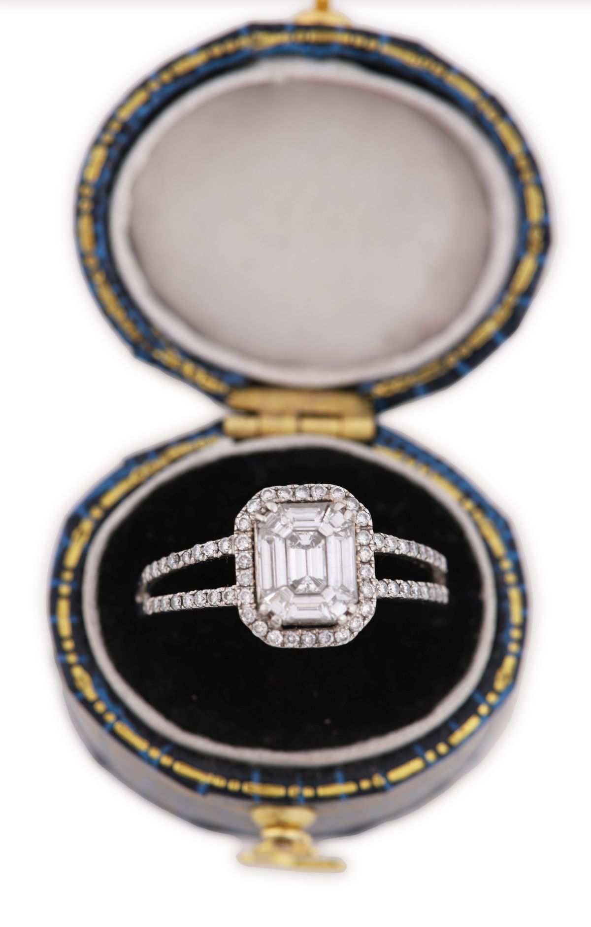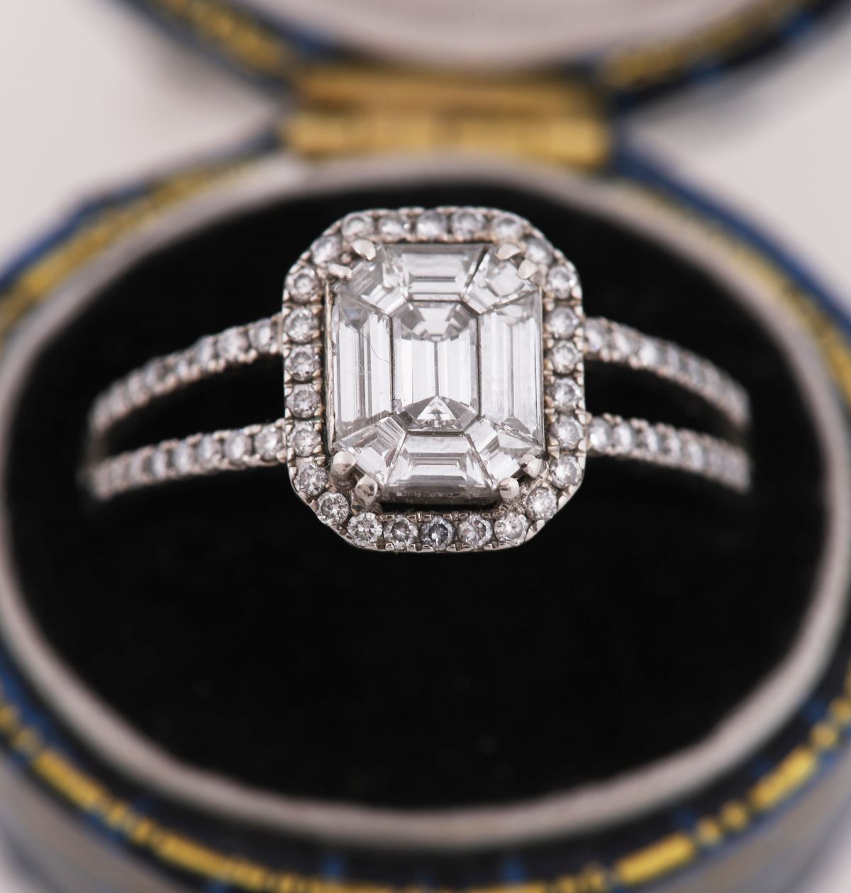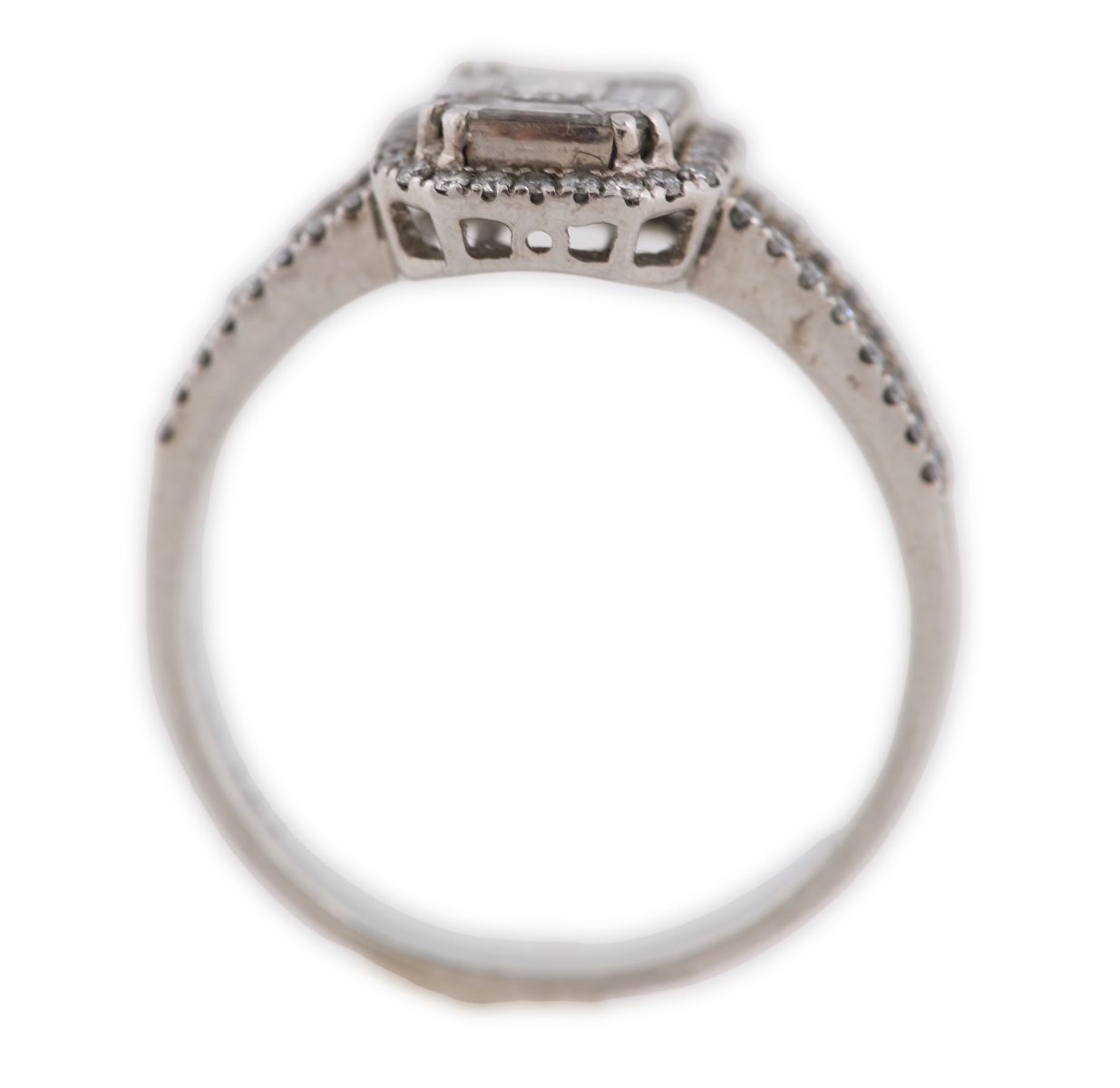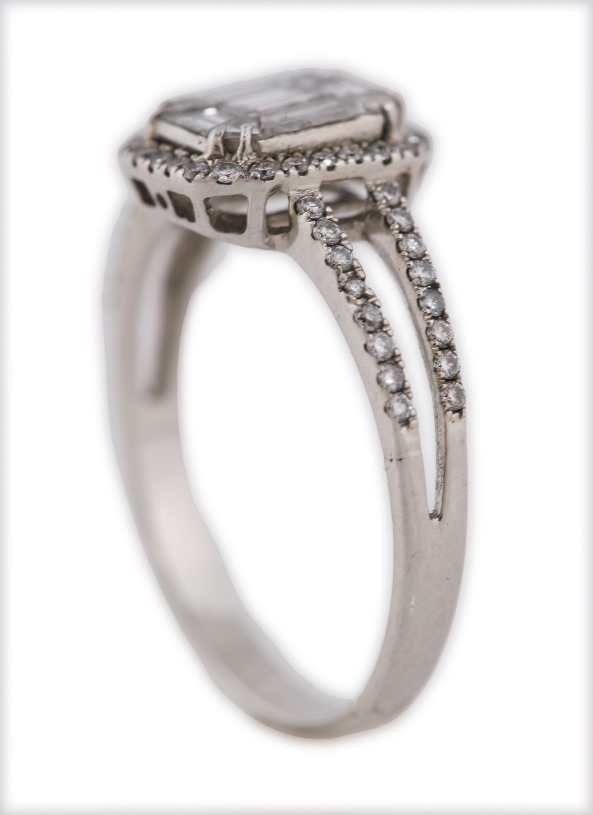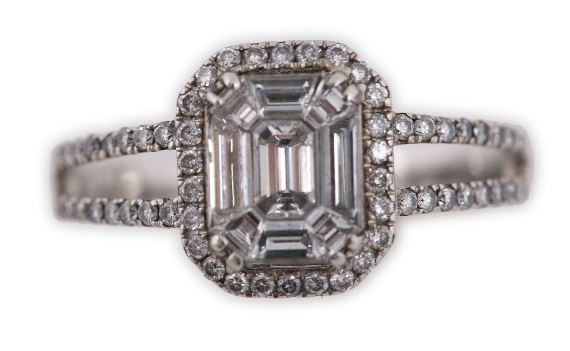 Lot 661 18CT WHITE GOLD EMERALD-CUT DIAMOND CLUSTER RING