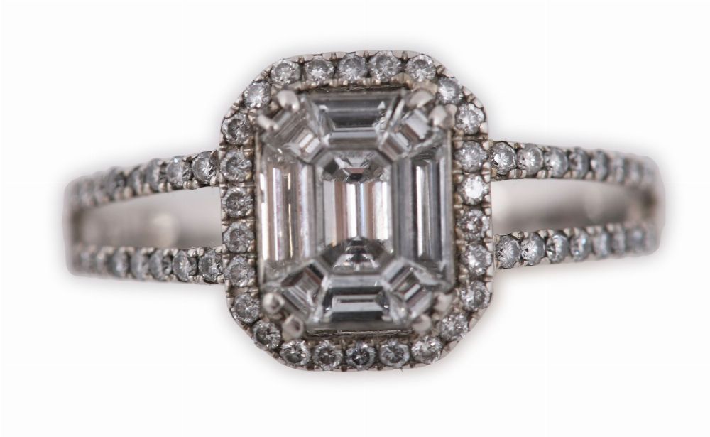 An 18ct white gold diamond cluster ring, centred with an emerald-cut diamond (approximately 0.75ct) within a surround of round brilliant-cut diamonds, the shoulders further set with small brilliants.