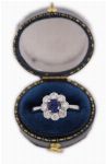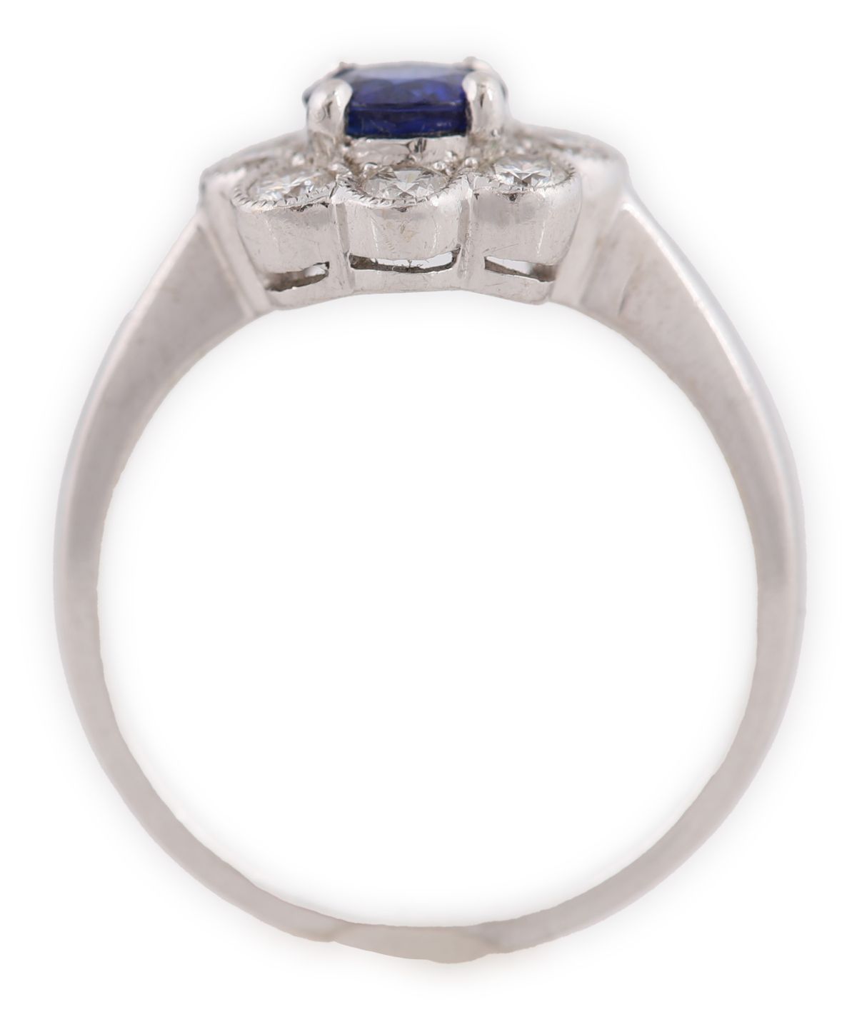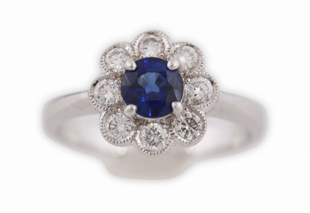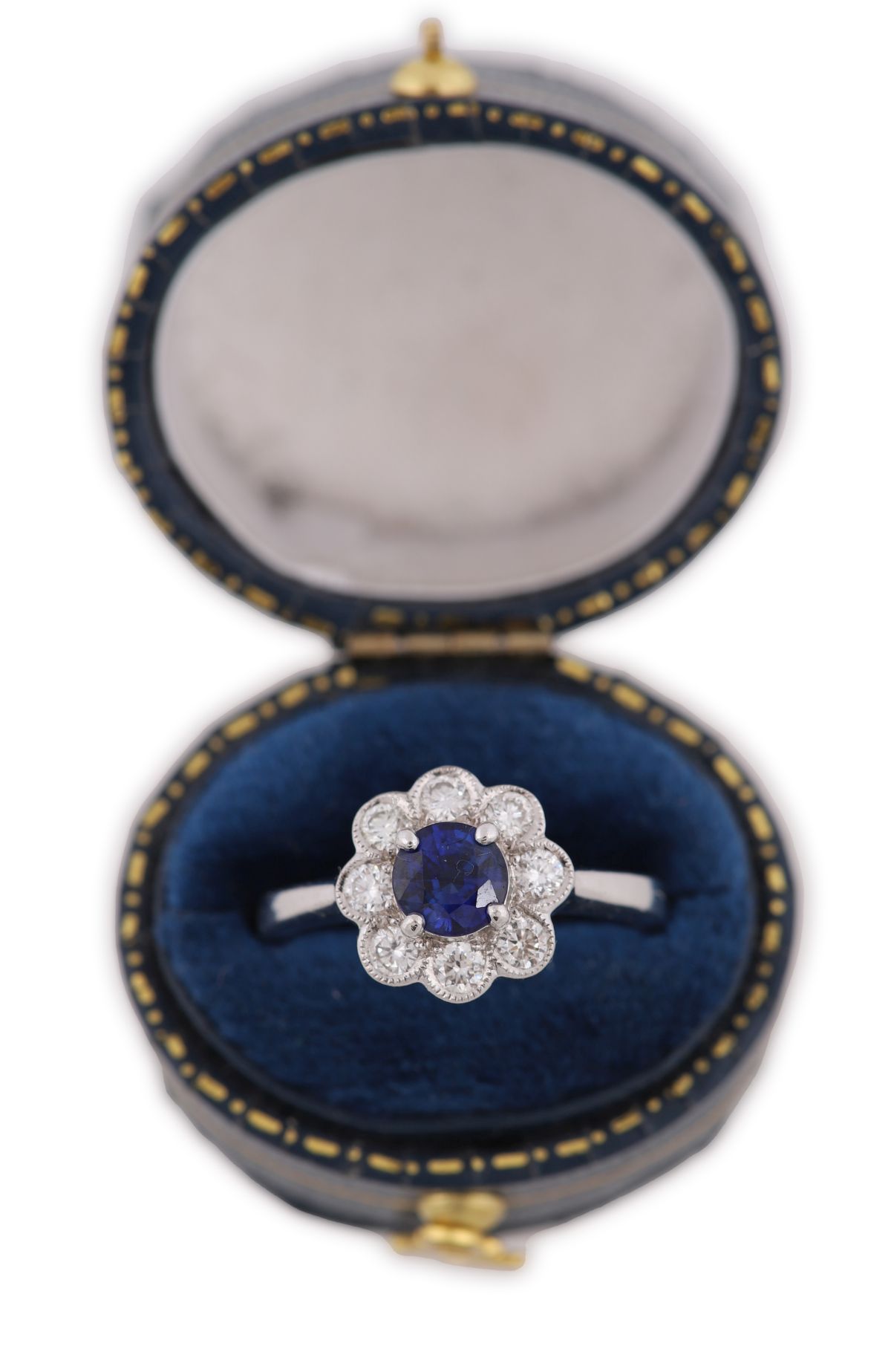 Lot 691 18CT WHITE GOLD SAPPHIRE AND DIAMOND CLUSTER RING