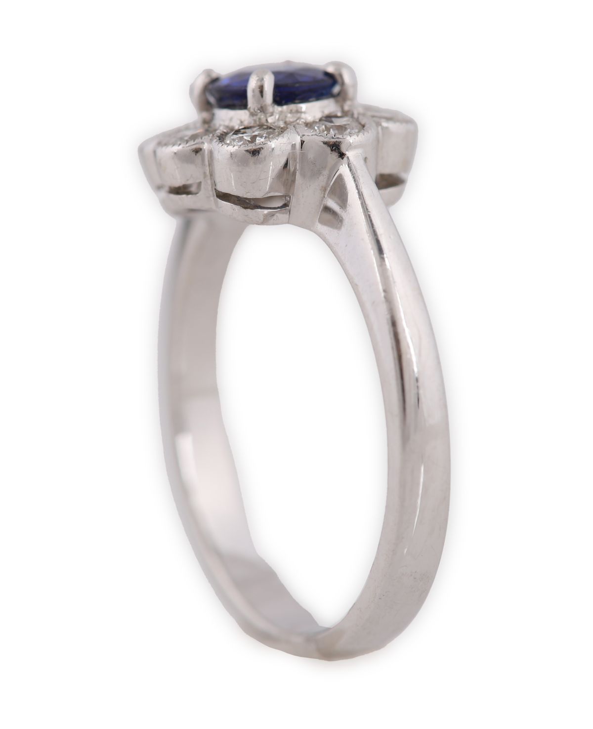 Centrally set with a round mixed-cut sapphire, within a scalloped surround of brilliant-cut diamonds forming a floral cluster head, mounted on an 18ct white gold shank.