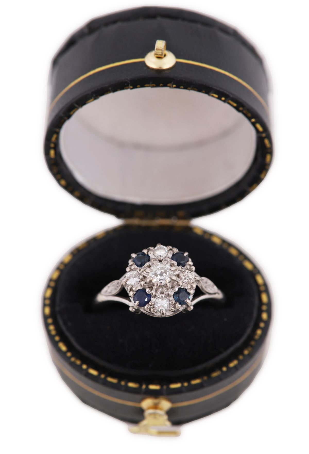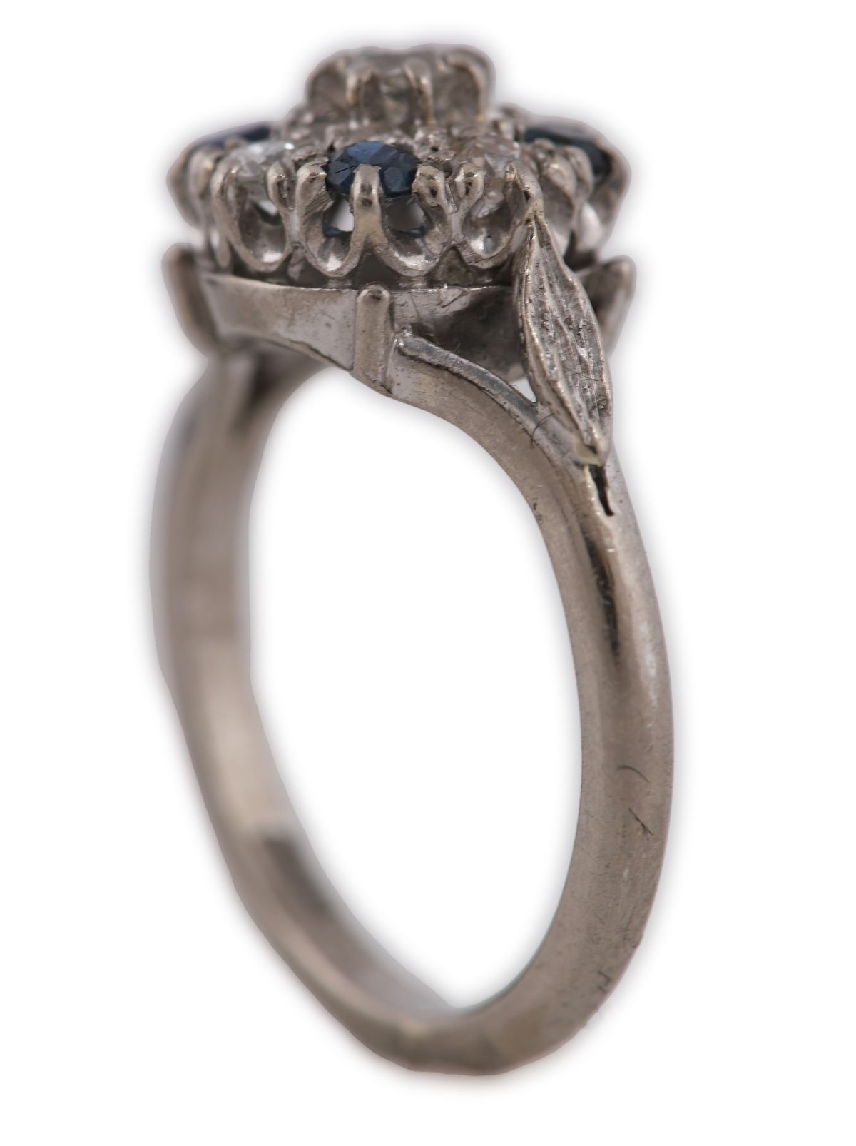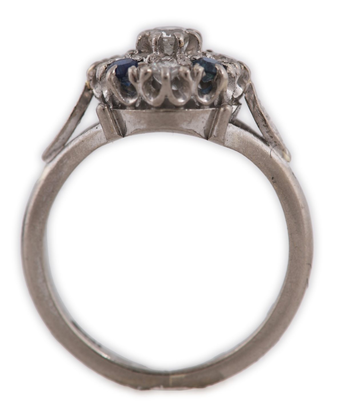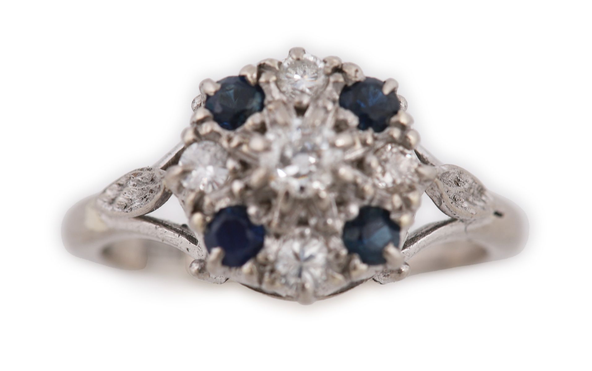Lot 650 18CT WHITE GOLD SAPPHIRE AND DIAMOND CLUSTER RING