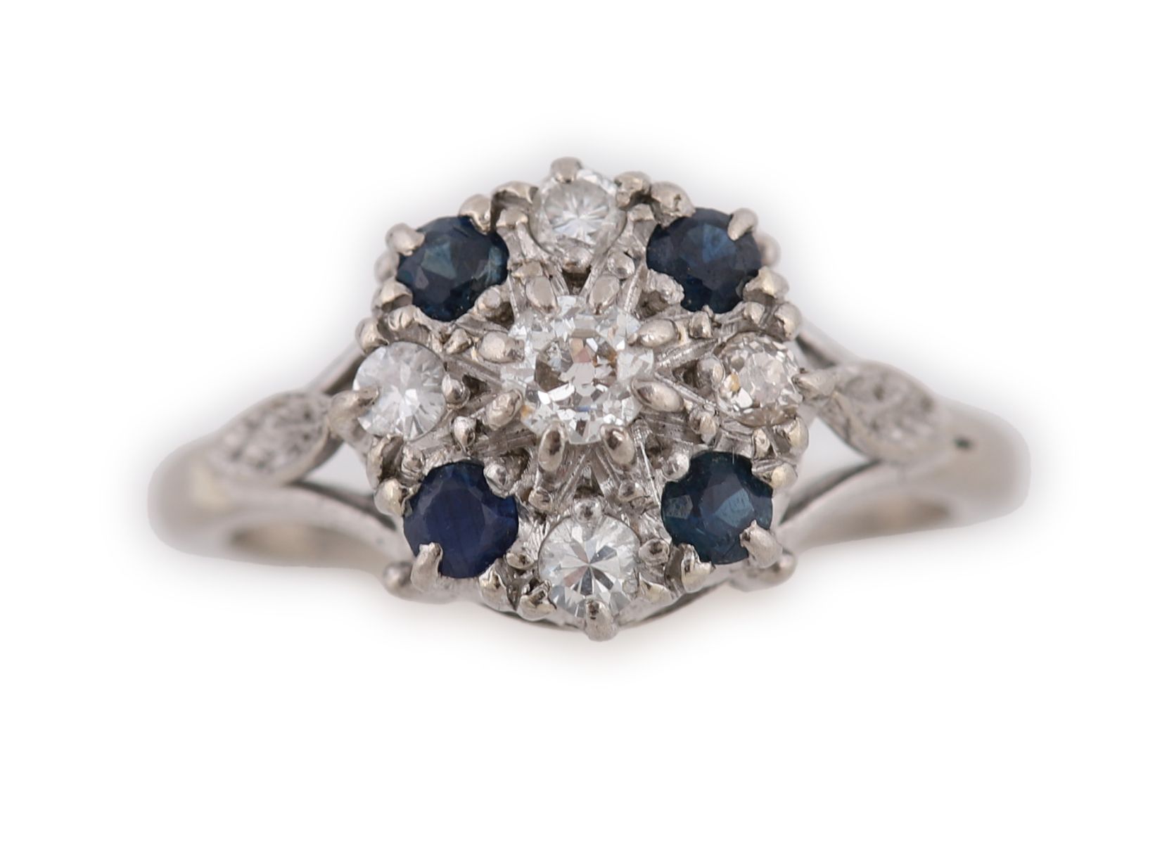 An 18ct white gold cluster ring, centred with a round mixed-cut sapphire surrounded by a halo of brilliant-cut diamonds, with additional diamond detail to the shoulders. Open gallery and split shoulder design.