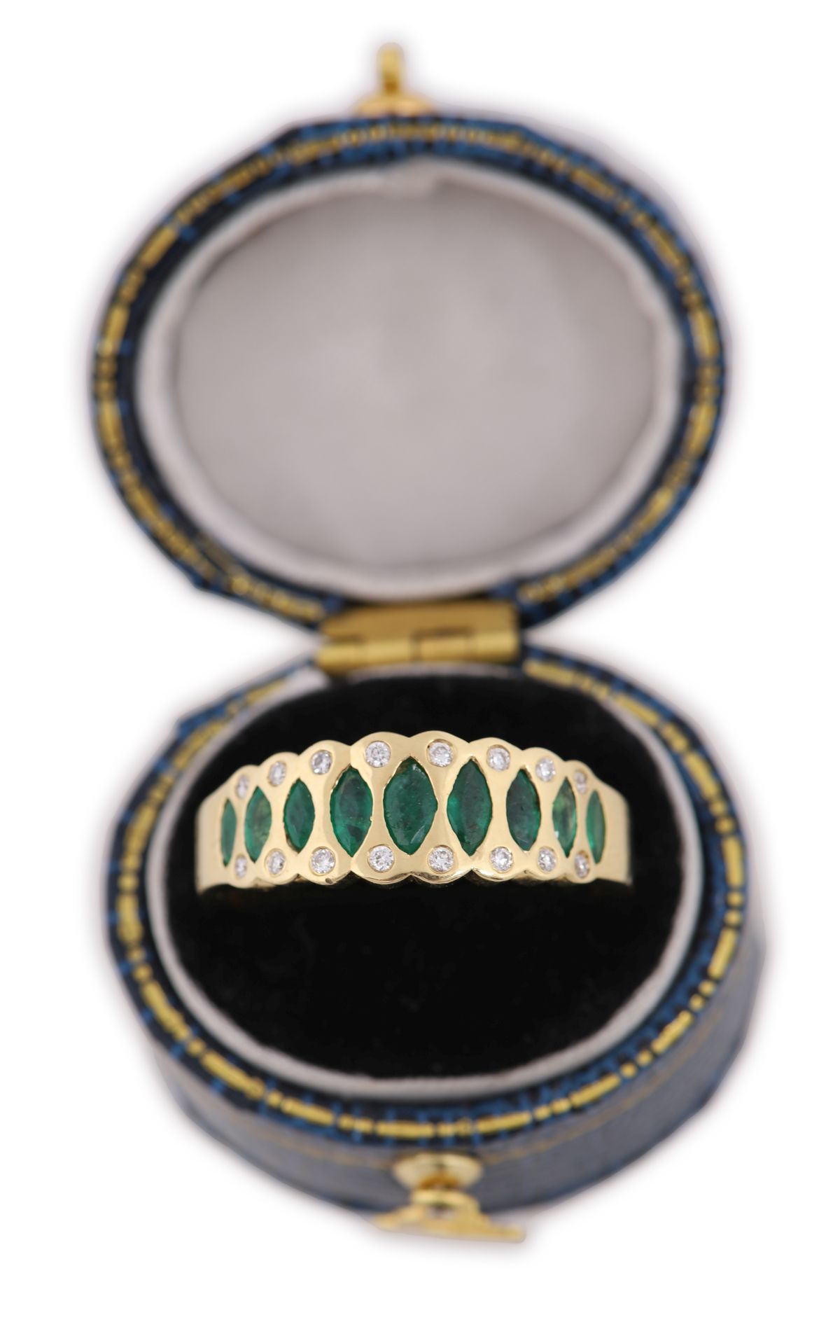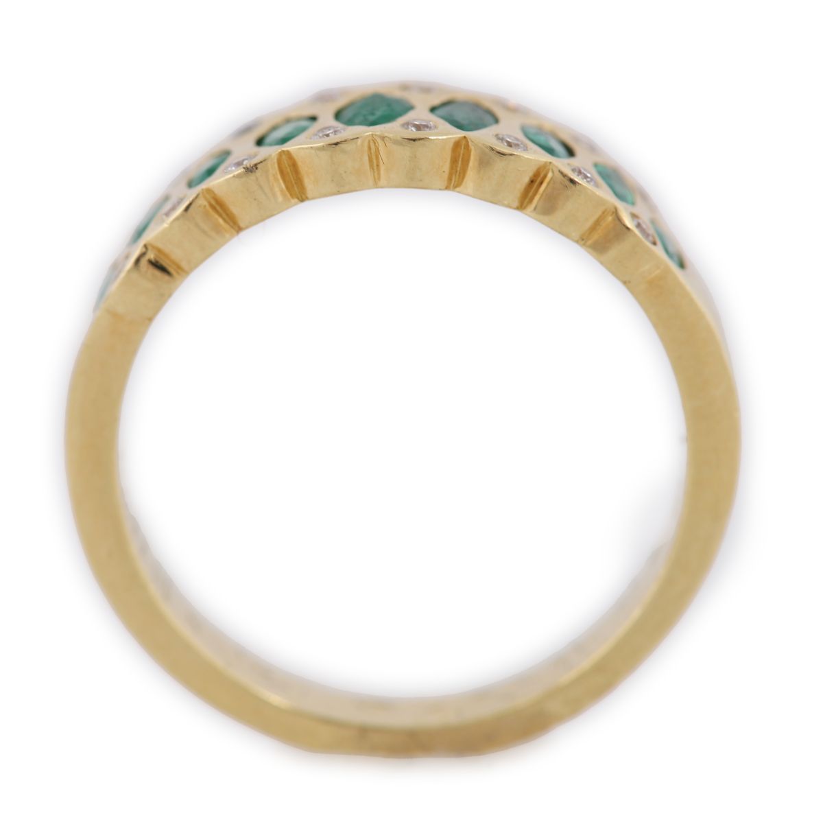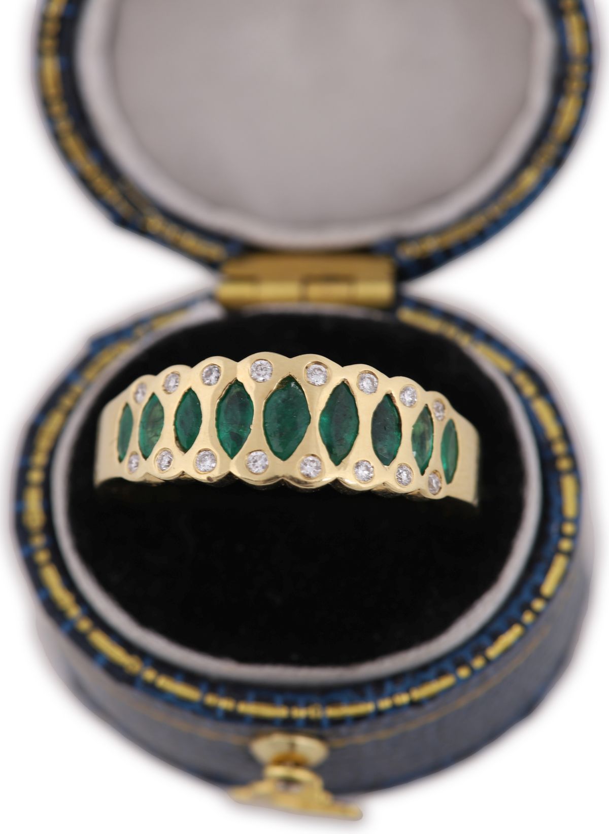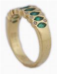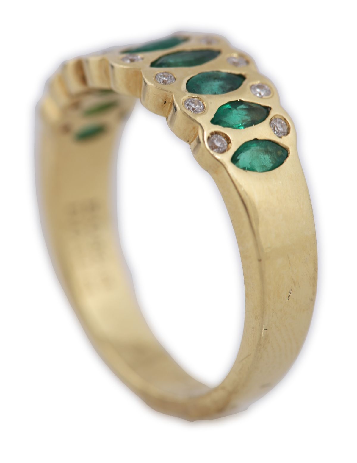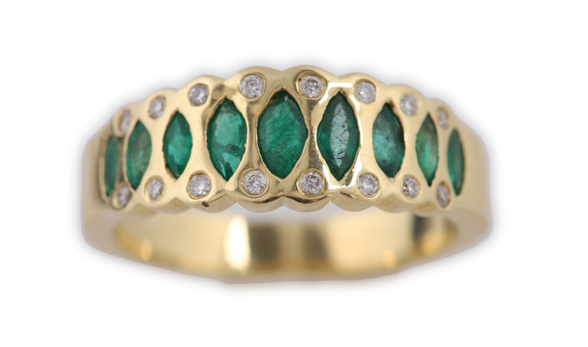 An 18ct yellow gold band ring set with a continuous row of marquise-cut emeralds, interspersed with small round brilliant-cut diamonds. Total emerald weight approximately 0.82 carats and total diamond weight approximately 0.11 carats (as per vendor note). Scroll and pierced gallery detail.