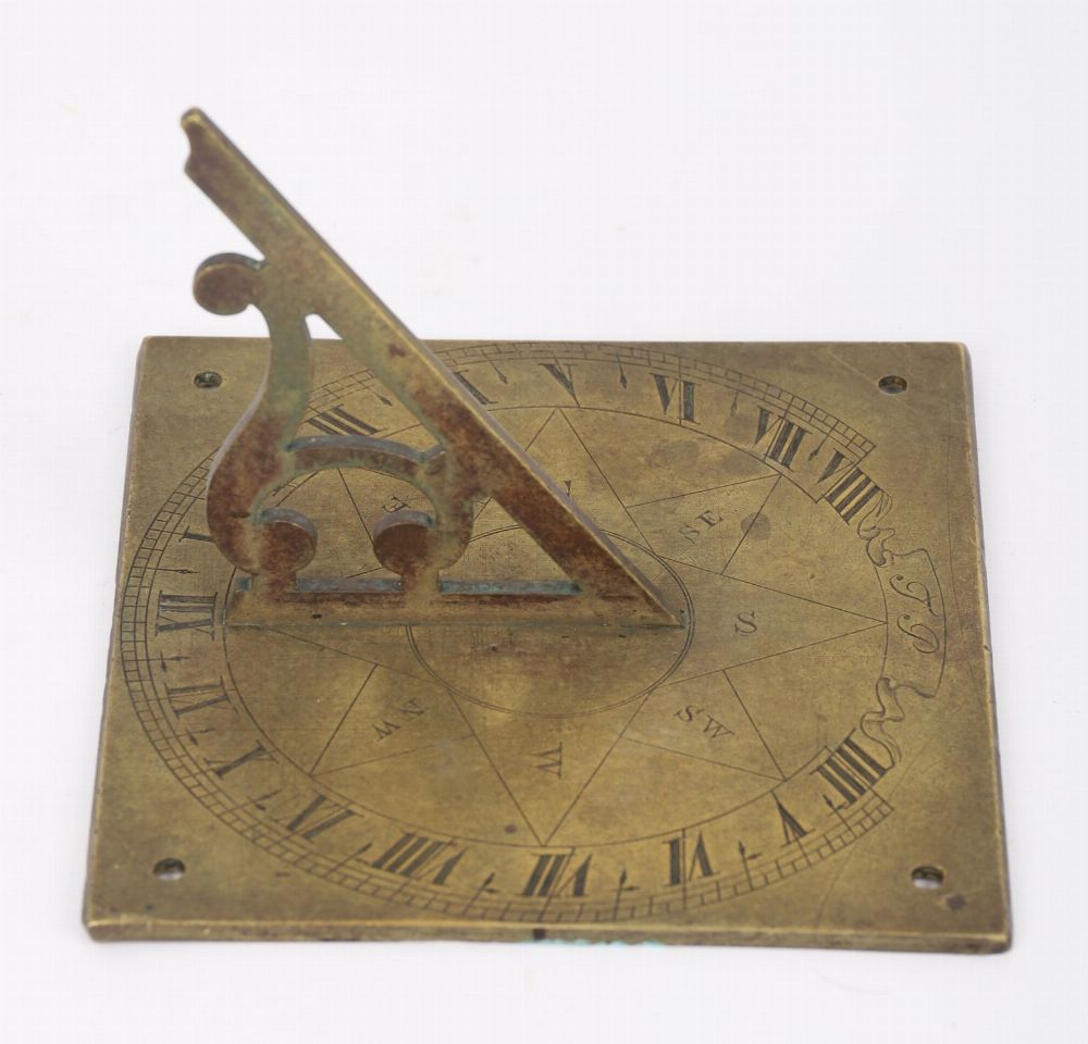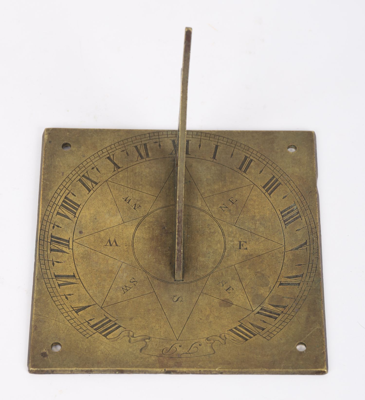 A square brass sundial plate, engraved with Roman numerals and compass markings, the gnomon with pierced foliate design, showing a mellow patina from age and use. Signed J. P.