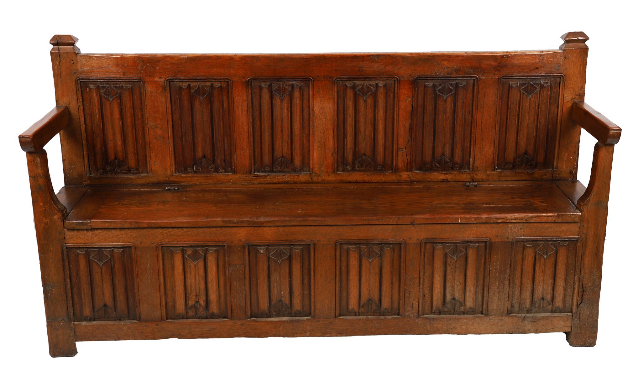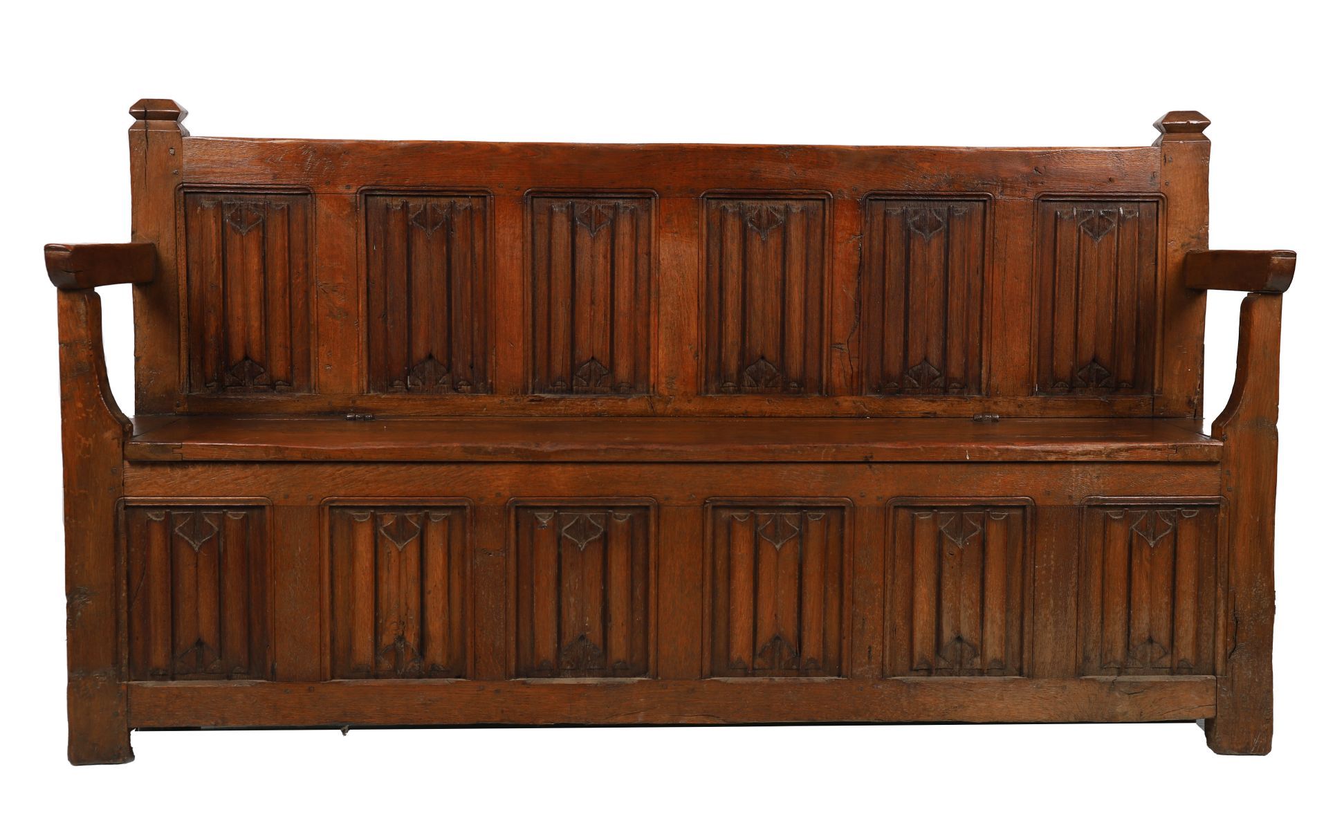 An 18th-century oak hall bench, the back and seat front carved with linenfold panels, with shaped arms and panelled sides, raised on square supports. English or continental, 18th century.