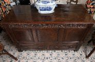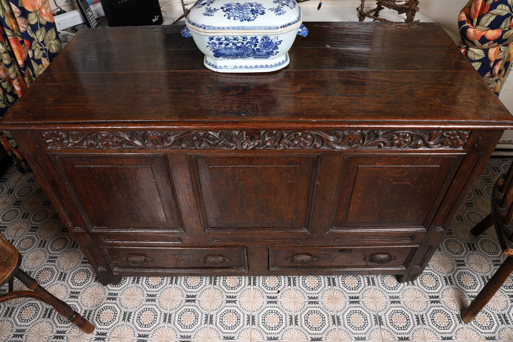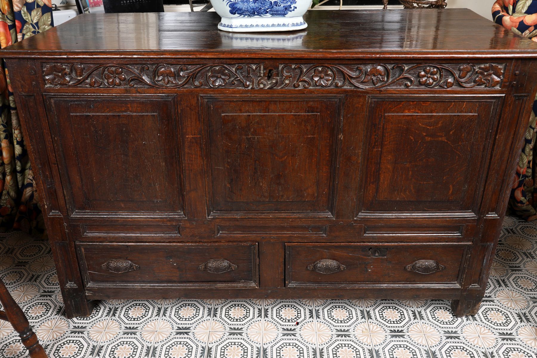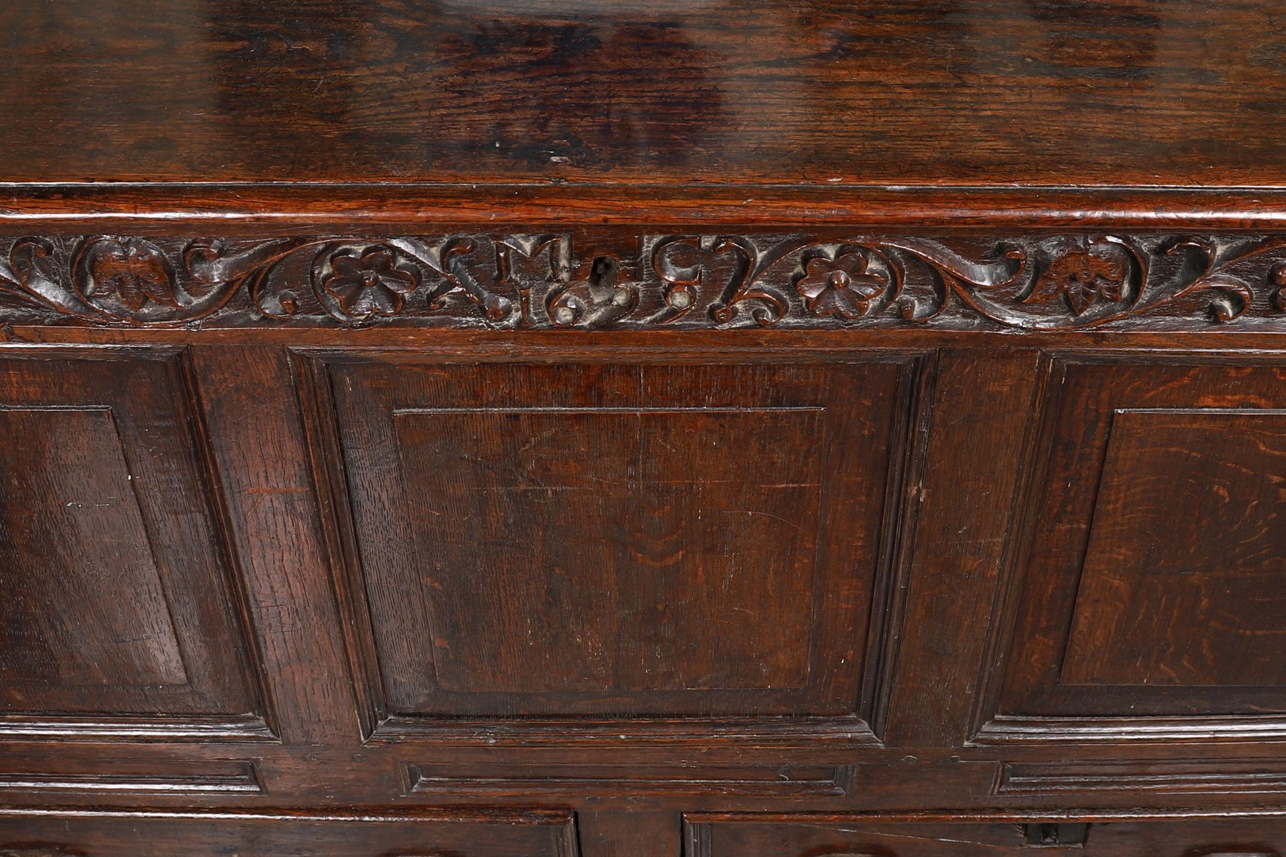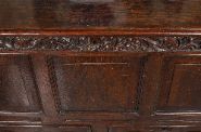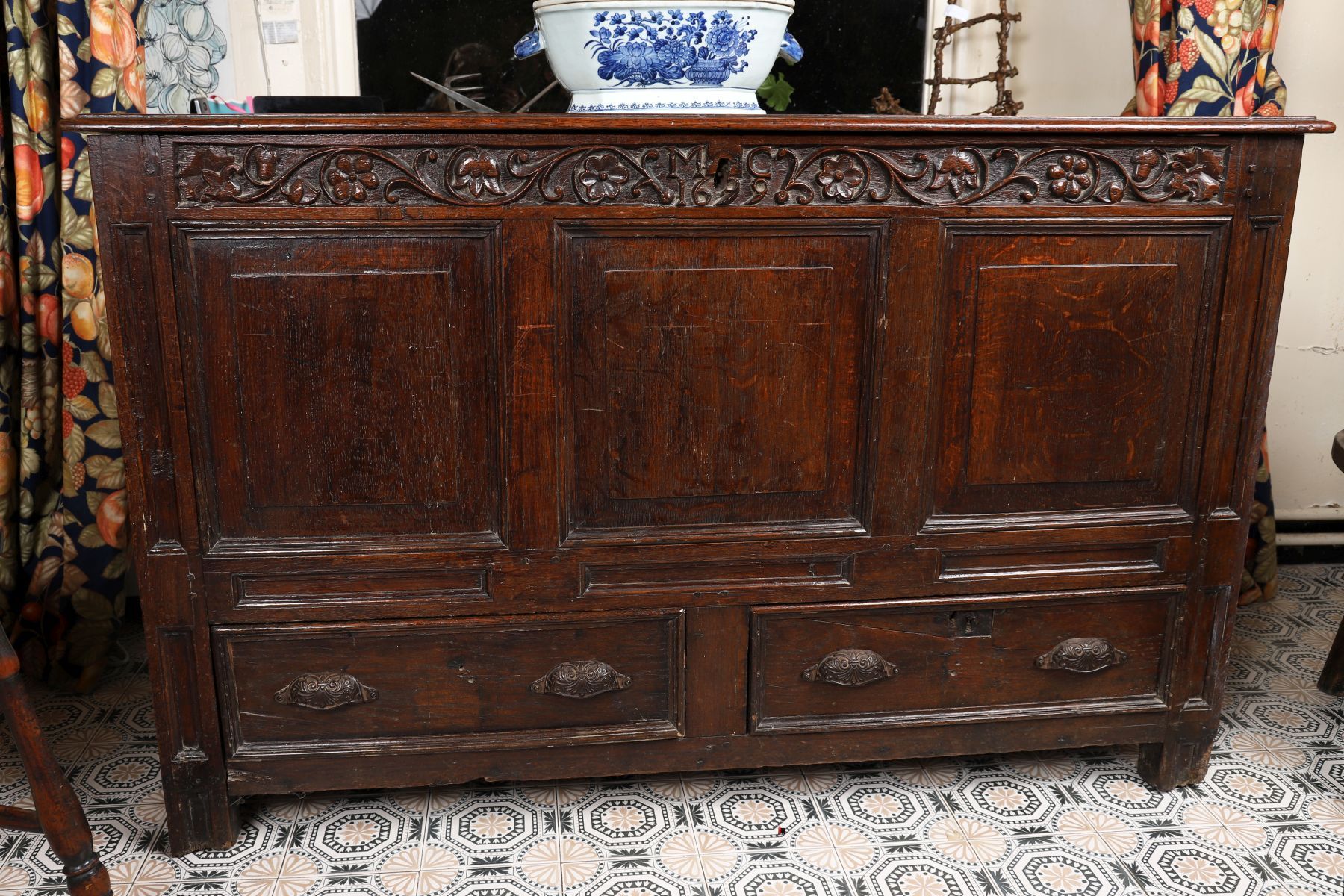 Lot 421 18TH-CENTURY CARVED PANELLED OAK TRUNK