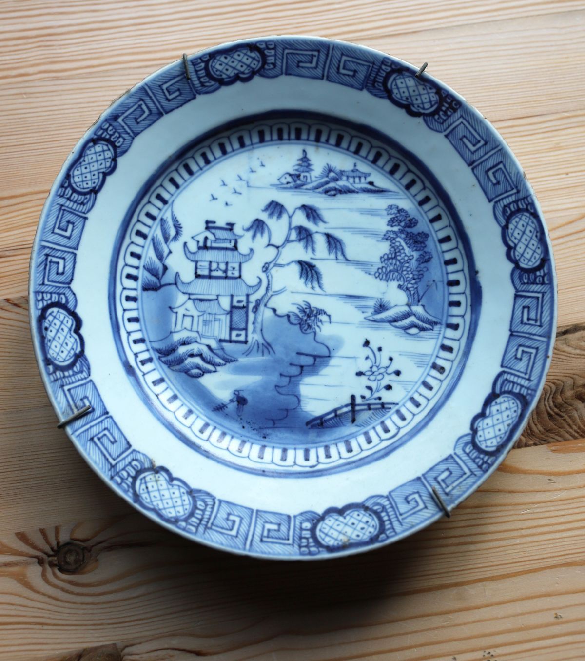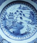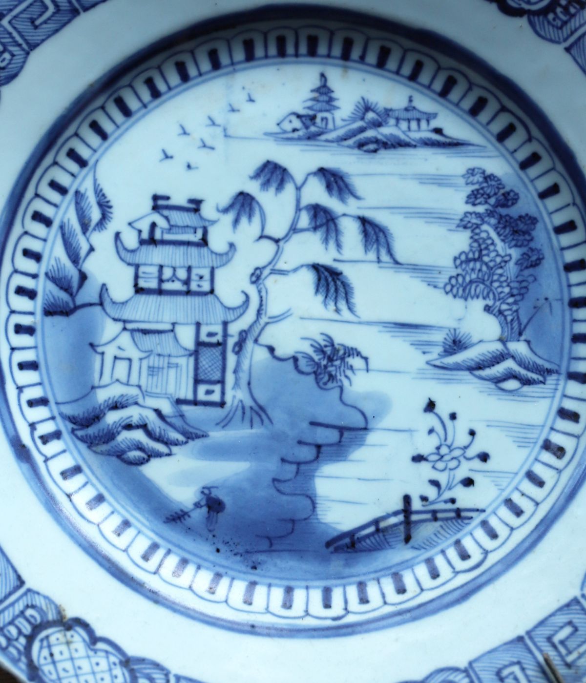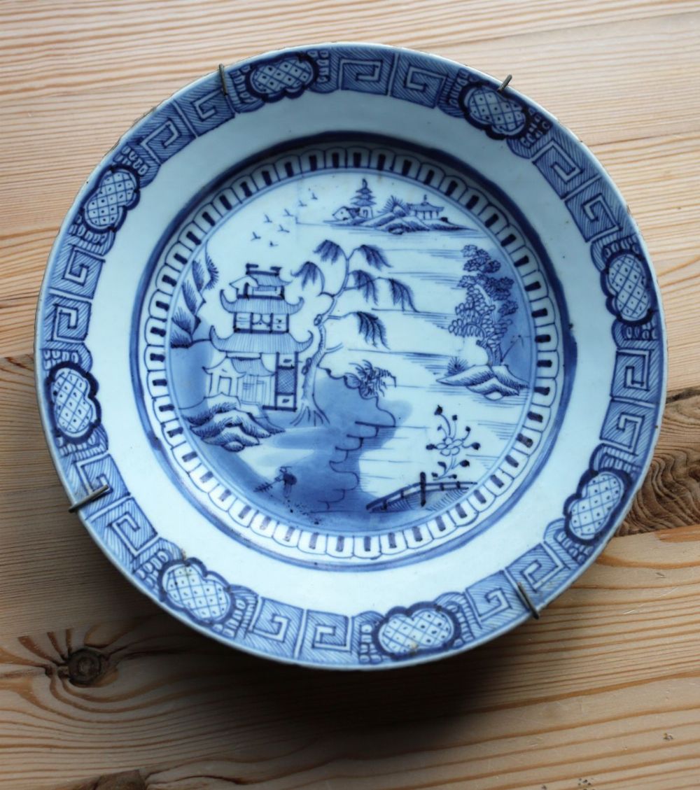 An 18th-century Chinese porcelain plate decorated in underglaze blue with a riverside landscape featuring pavilions, trees and figures, within a patterned border. Minor fritting and wear consistent with age.