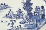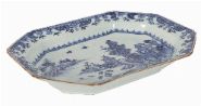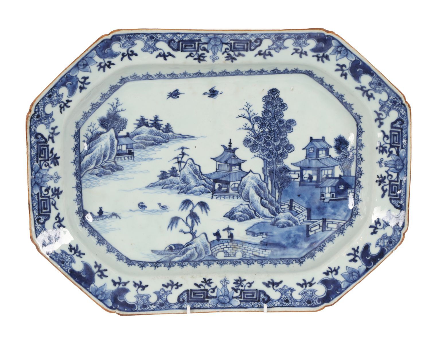 An 18th-century Chinese porcelain platter decorated in underglaze blue with a river landscape scene, pavilions, rockwork and foliage, within a shaped border enriched with stylised floral and geometric motifs.