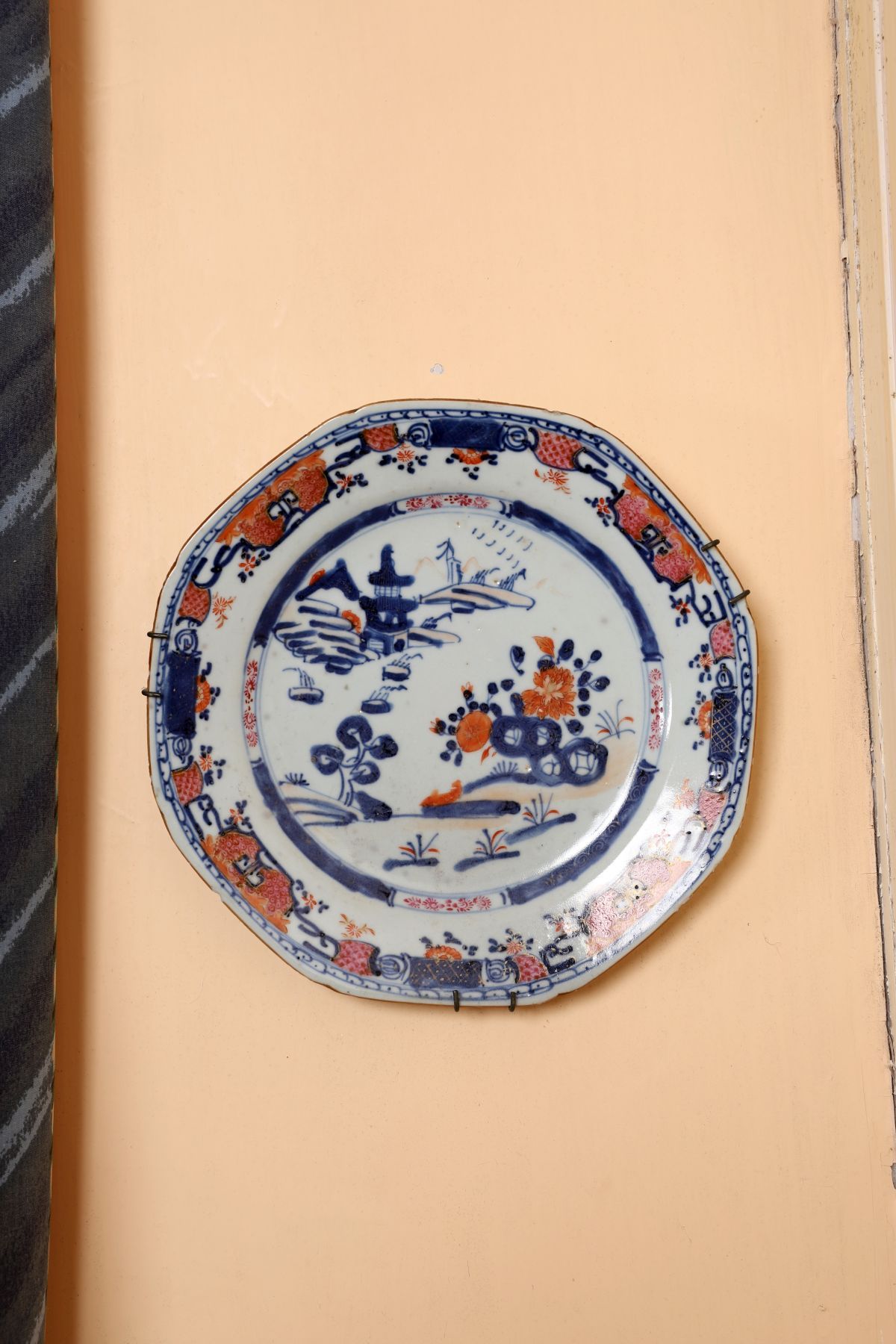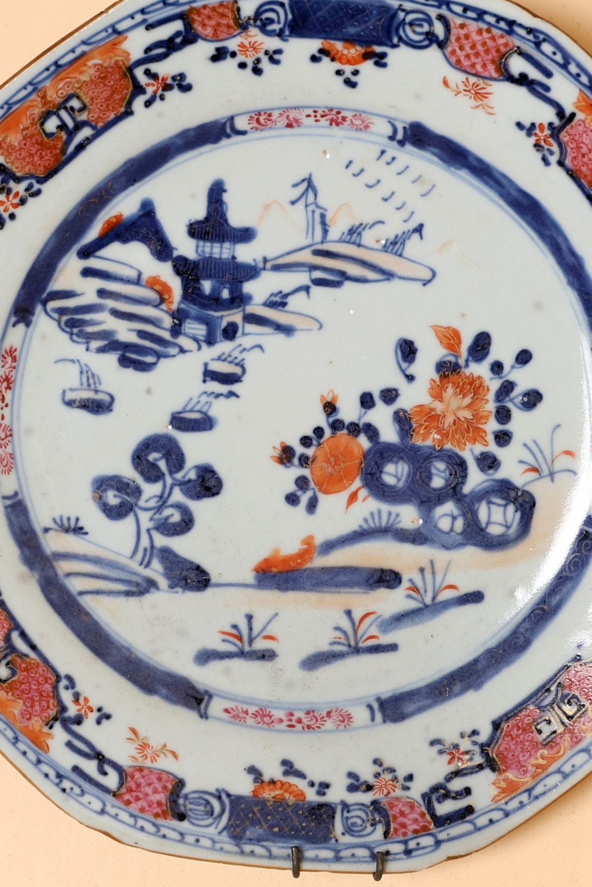 An 18th-century Chinese porcelain plate, finely decorated in underglaze blue and overglaze iron-red enamels, the central field painted with stylised landscape and floral motifs, within a shaped rim bordered with alternating panels of scrolling foliage and geometric ornament.